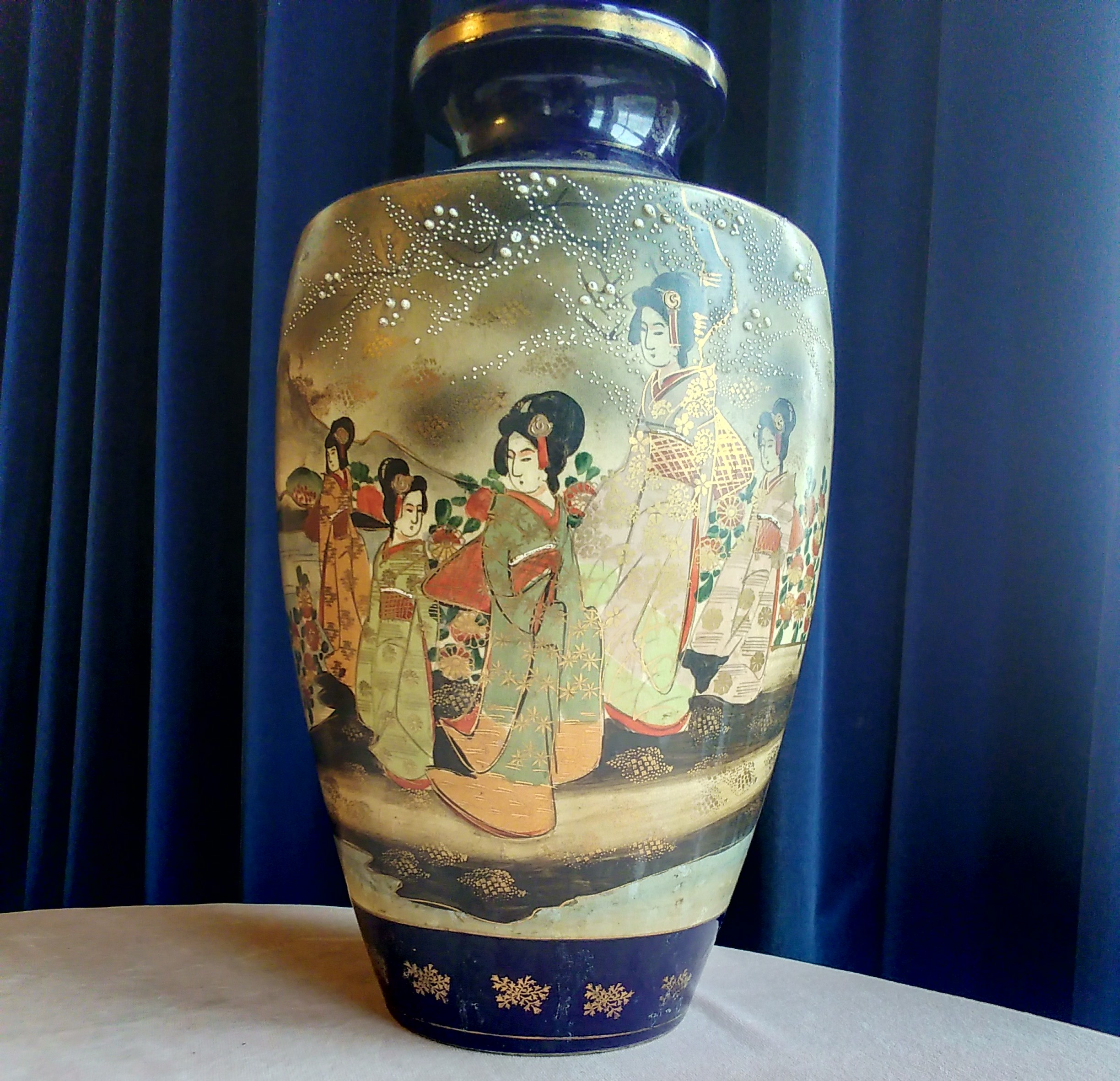 This vase is likely Japanese and dates from the pre-1940 period, a time when Japan was known for its exquisite ceramics, particularly during the Meiji and Taisho periods. The intricate designs often feature traditional motifs such as geishas and landscapes, which reflect the cultural aesthetics of the time.