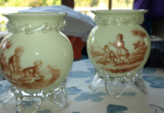 Two spherical glass vases with flattened rims and transfer prints of children playing in the country side on the face. They are a creamy coloured opaque glass with four leaf shaped feet in clear glass. There is also some applied clear glass in scallops under the rim. On the rear side there is a picture of a spray of grass or wheat.