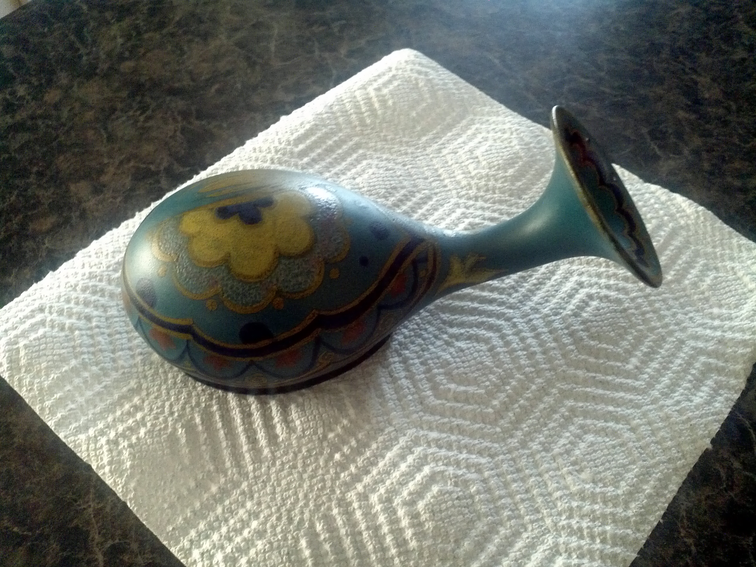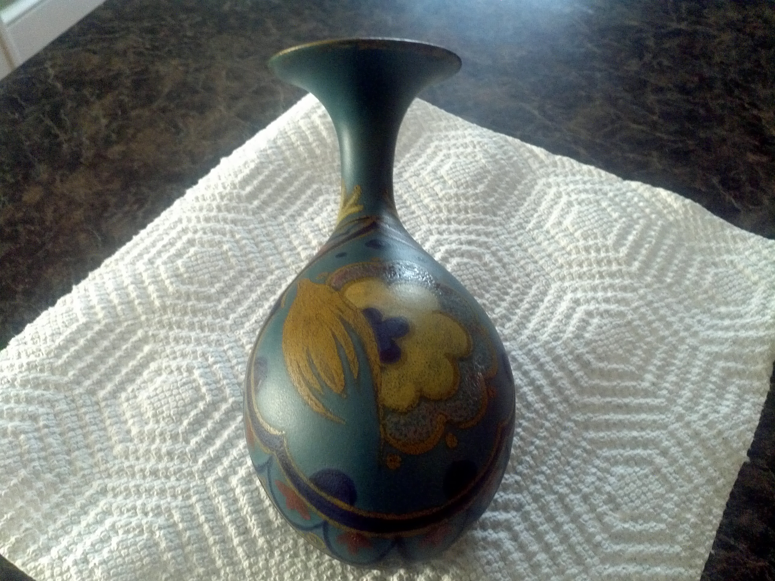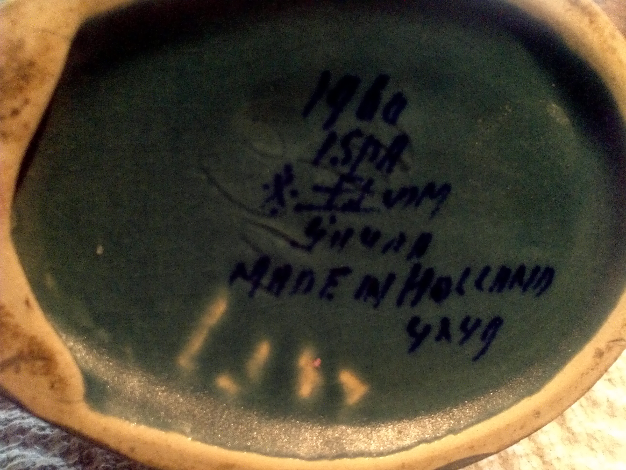 I have an unusual looking vase? it lays horizontal and the neck curves up a bit. It is marked on the bottom but I cant make out all of what it says. It Clearly says made in Holland and also I believe 1960. there is also a mark which is an X that has a dot within each open space of the x. I was hoping that maybe someone could help me identify it and maybe help me with Value as well.