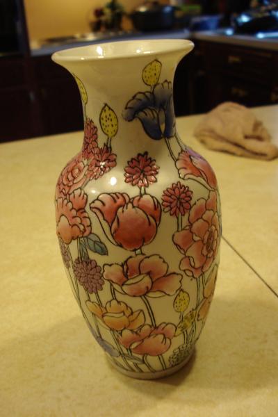 The vase is 6 1/2 inches tall with pick, blue and yellow flowers. The bottom is marked. Please refer to pictures.