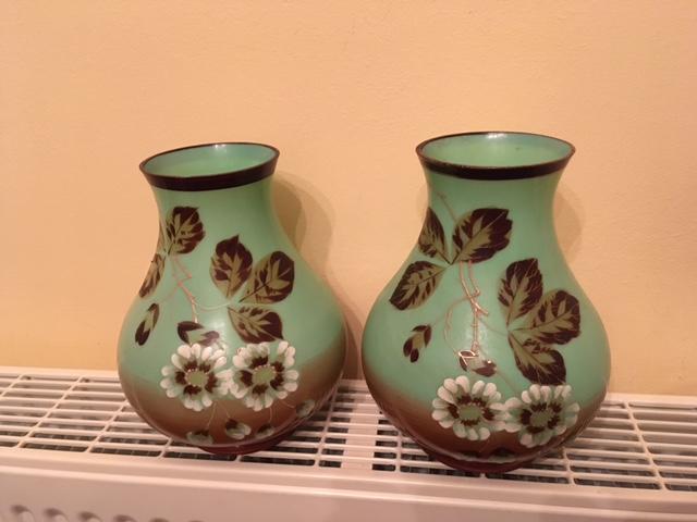 Two of green floral vases not quite a pair approx 7.5 inches