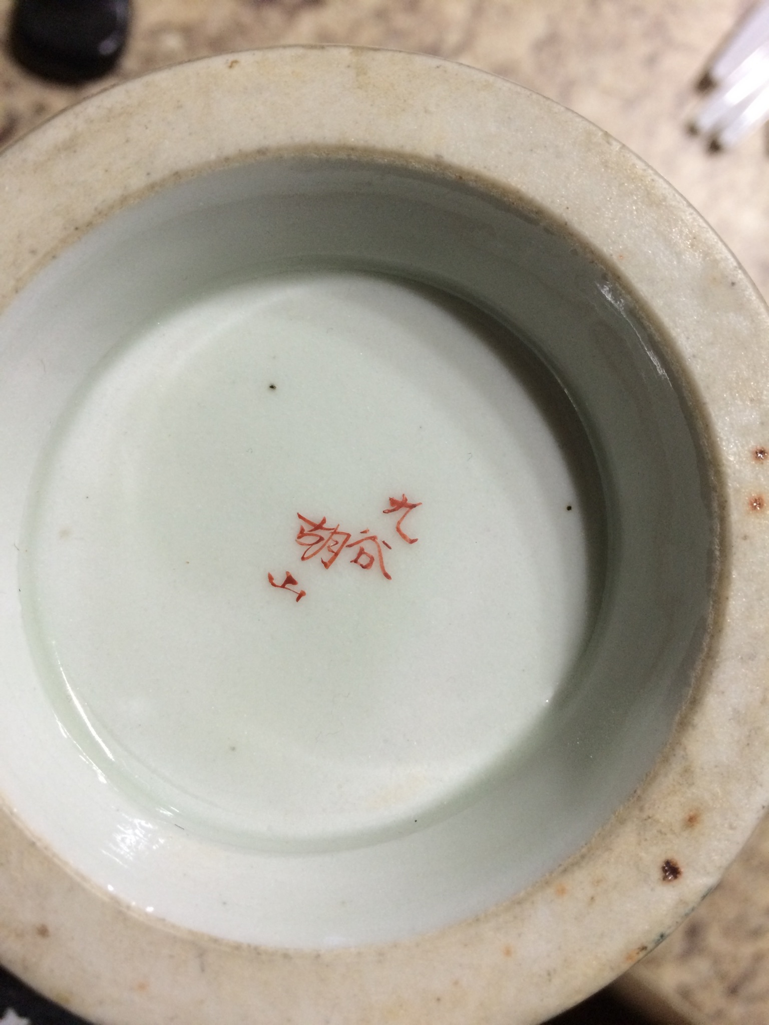 I asked my mother about this and she tells me it's hard to read because of so many different styles of japanese characters. My mother grew up in Japan and married my american father around 40 years ago. Anyways she says it looks like the name of KYU YA KOSAN or KYU TANI KOYAMA also she did mention something about a sun and moon symbols but wasn't sure. I guess it's like trying to read Shakespere as oppsed to todays language if you can understand. Hope this helps.