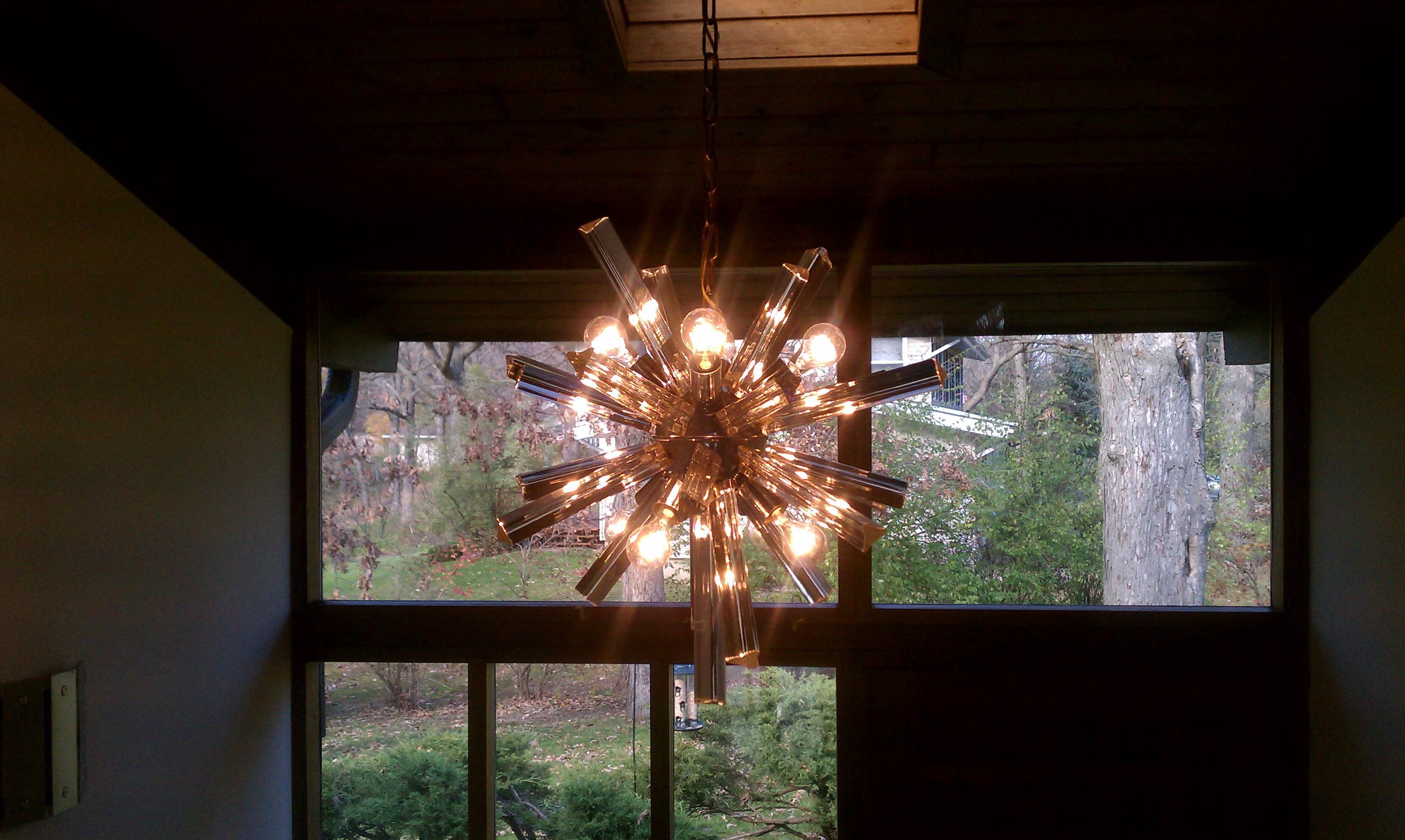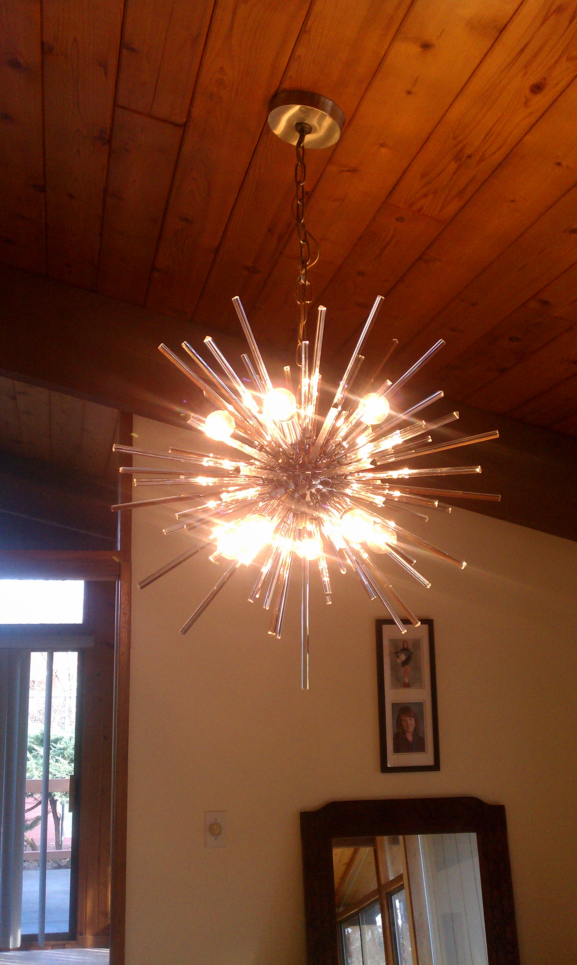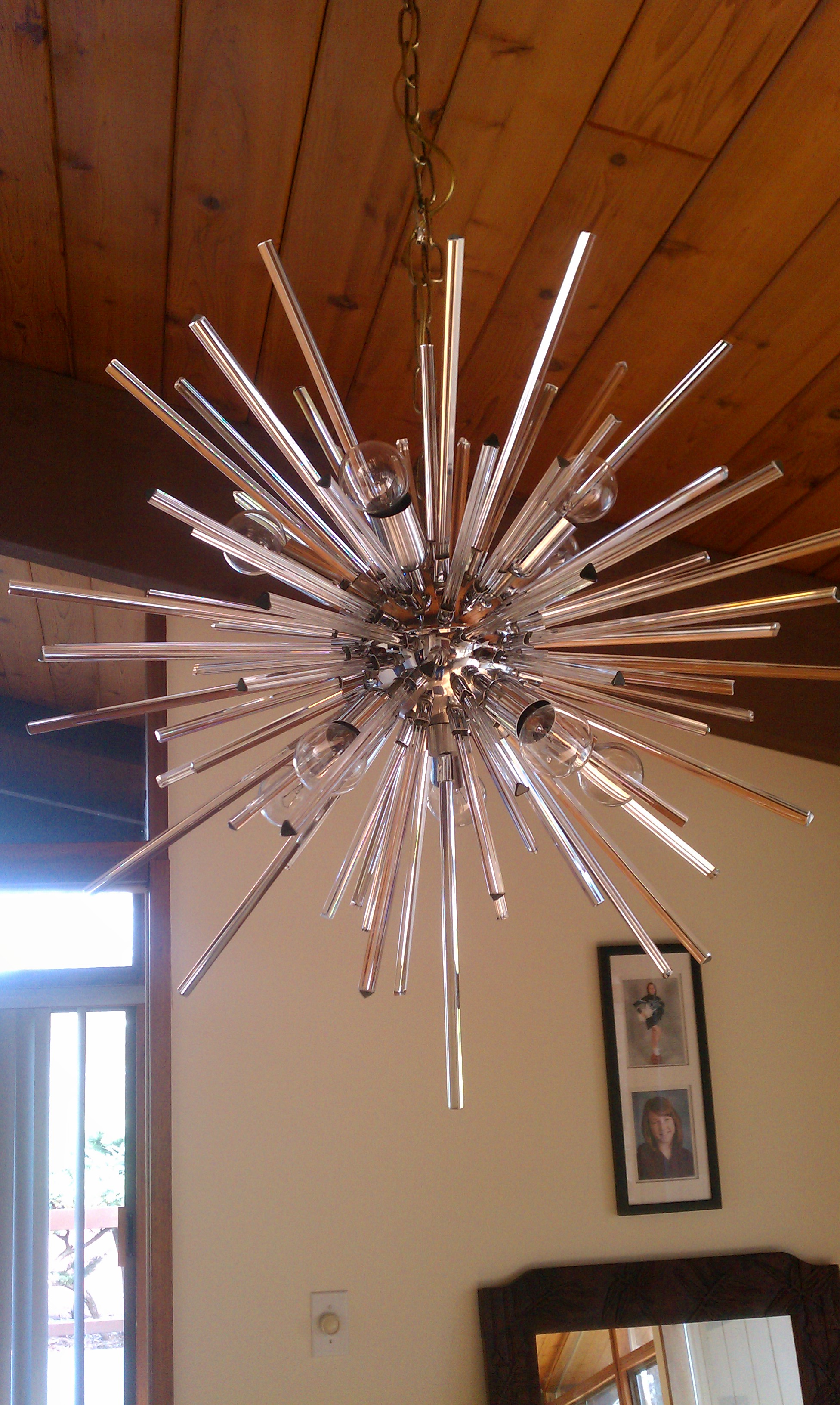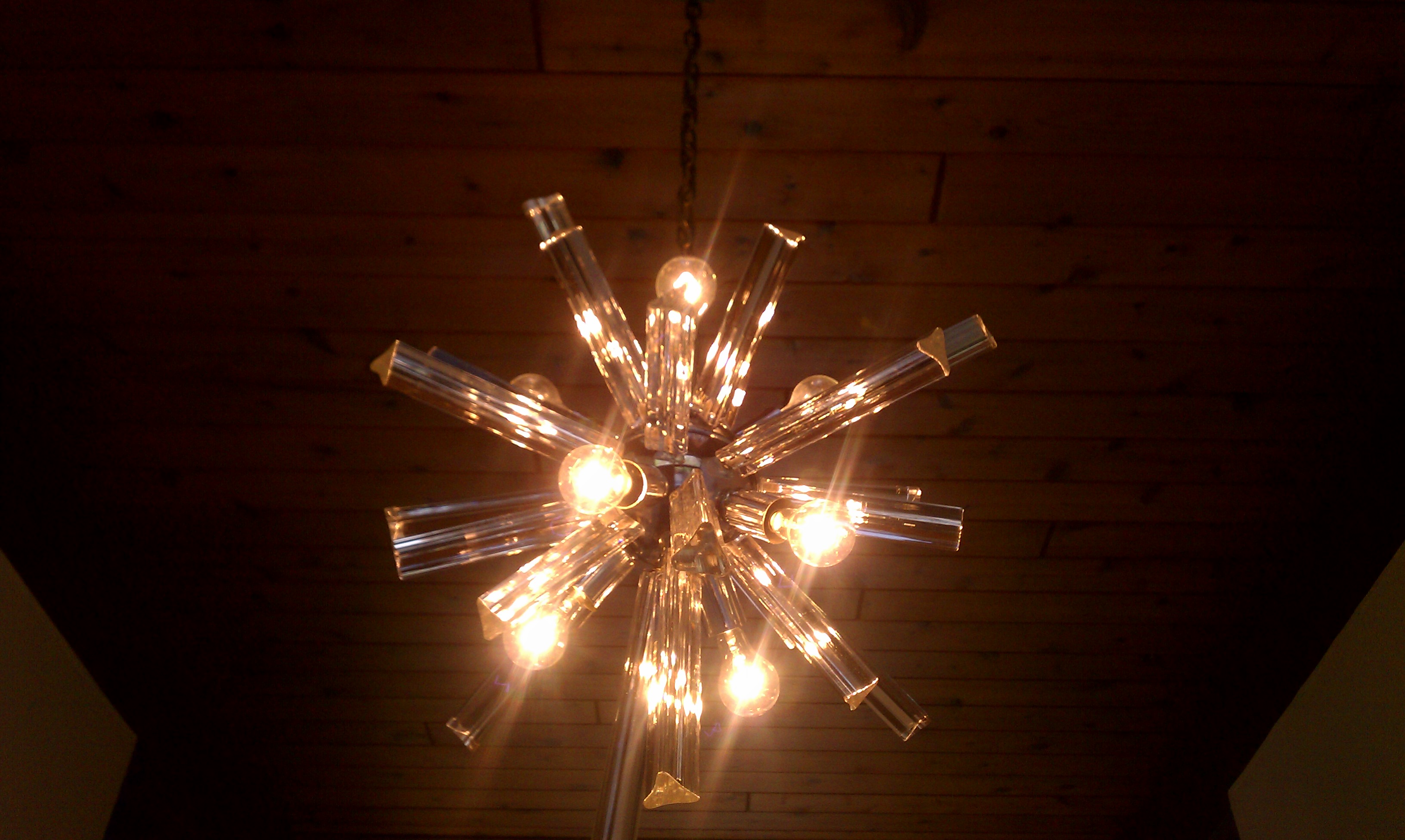 The larger is a 10 light snowflake or sputnik stlye with aprox 83 crystal/glass triangular spikes aprox 30+ in in diameter with crome or nickle globe base there are 2 different size spikes aprox 10" and 7"