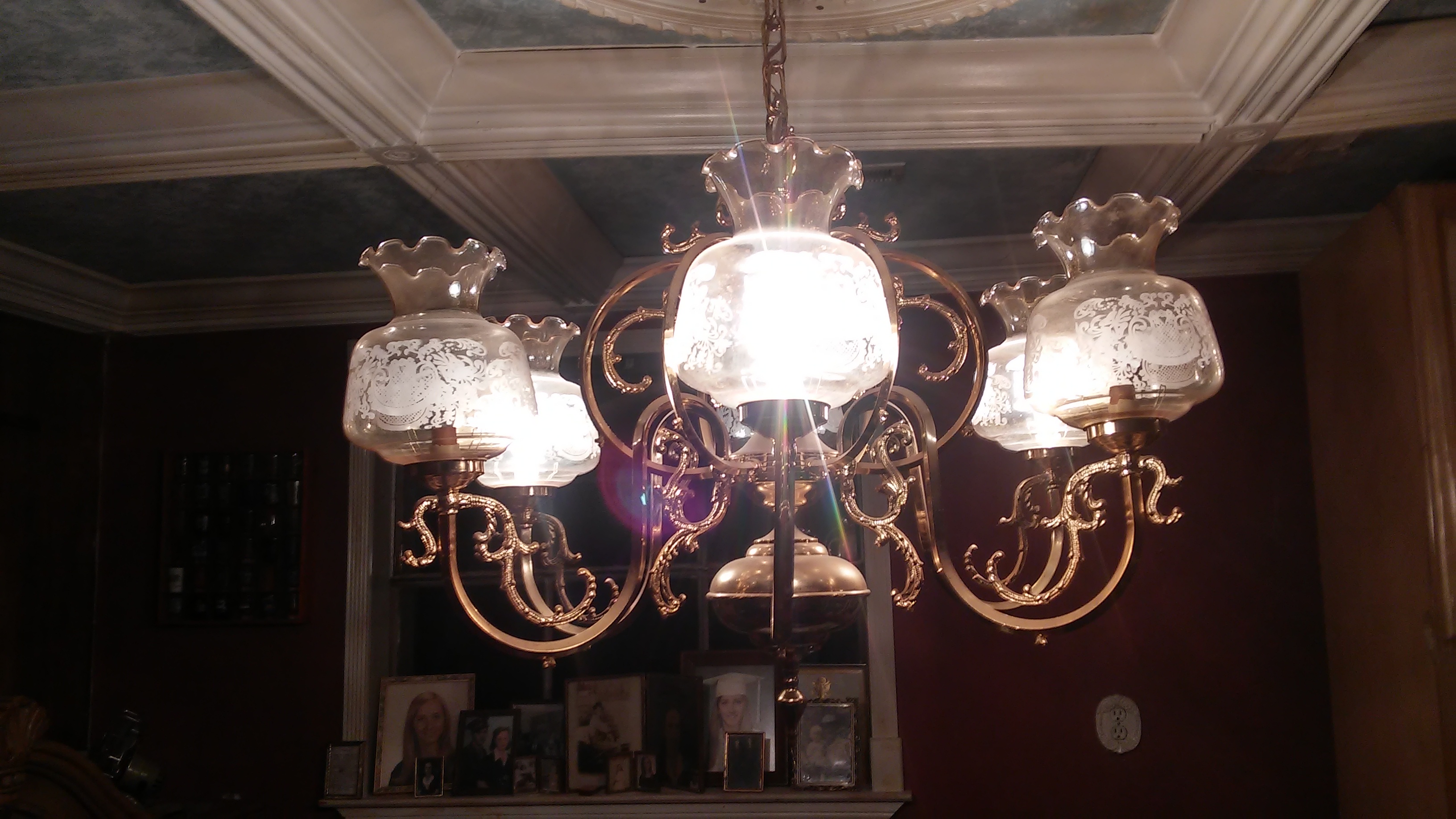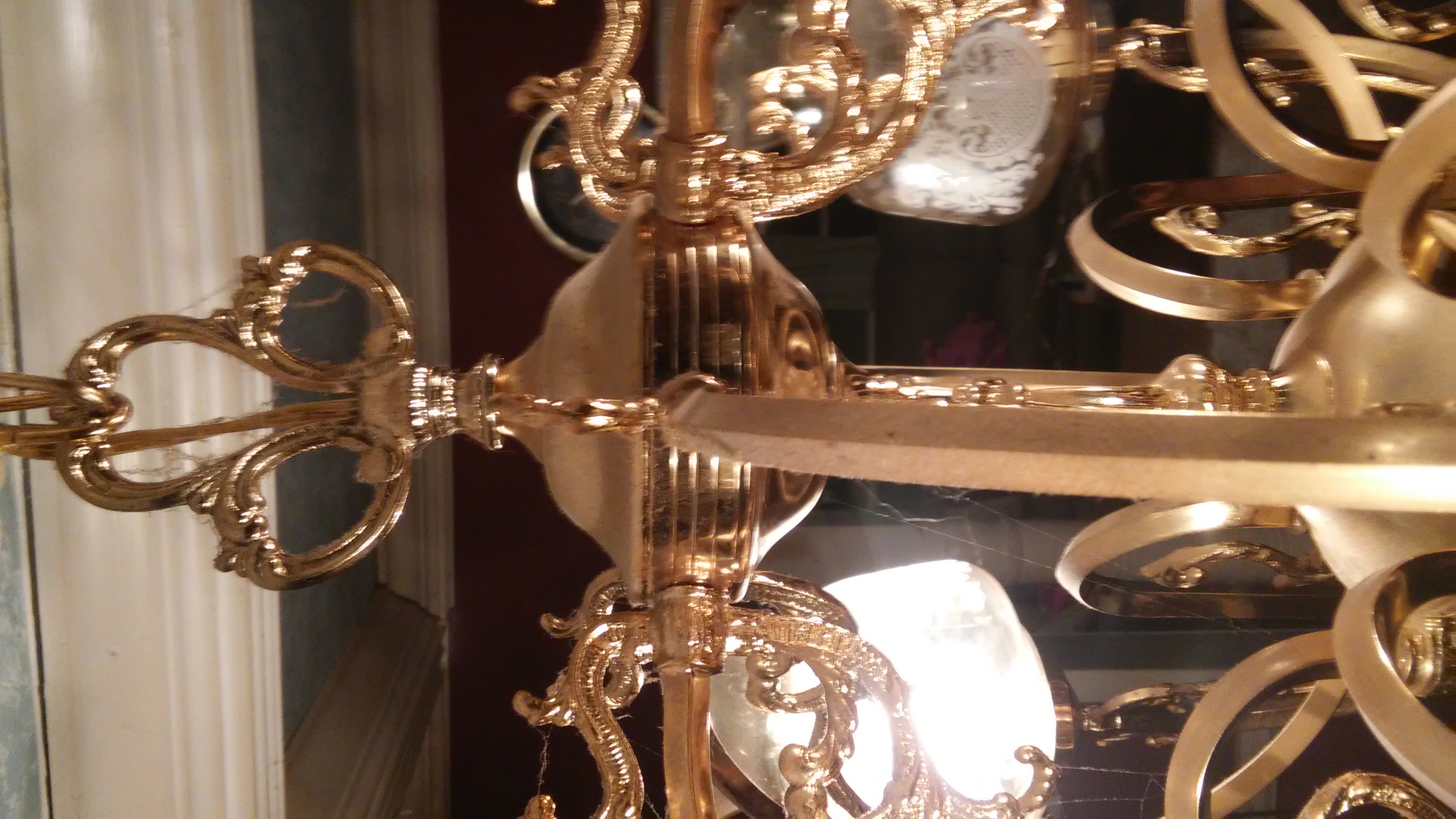 Re: ventige brass six arm chandelier with crystal globes