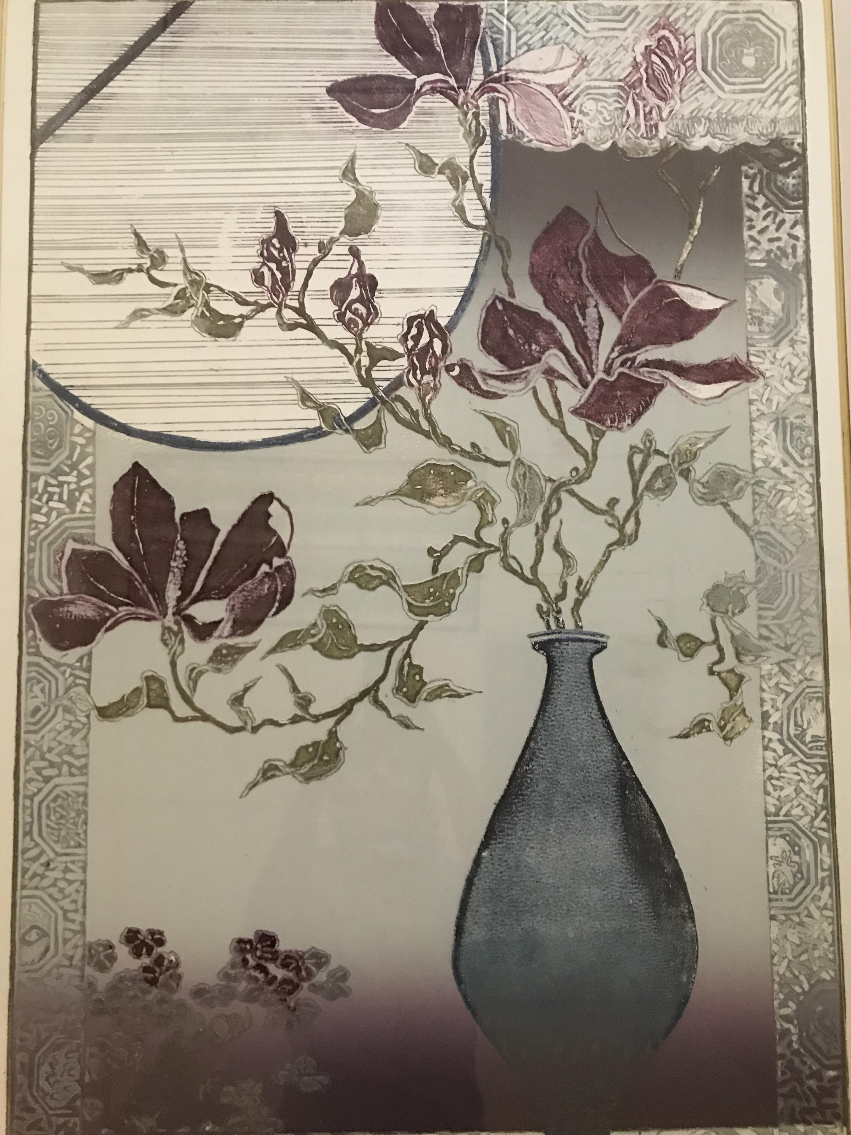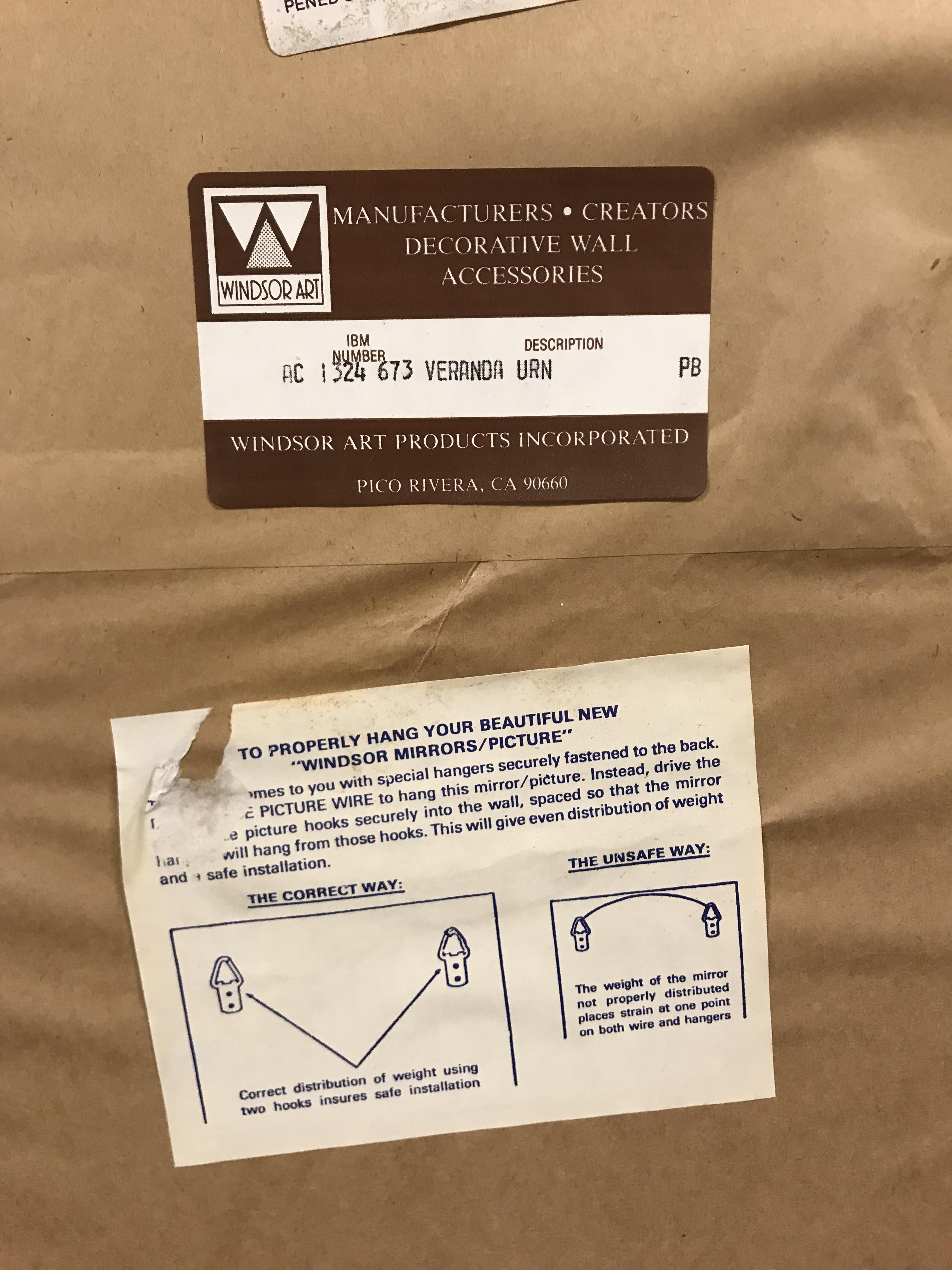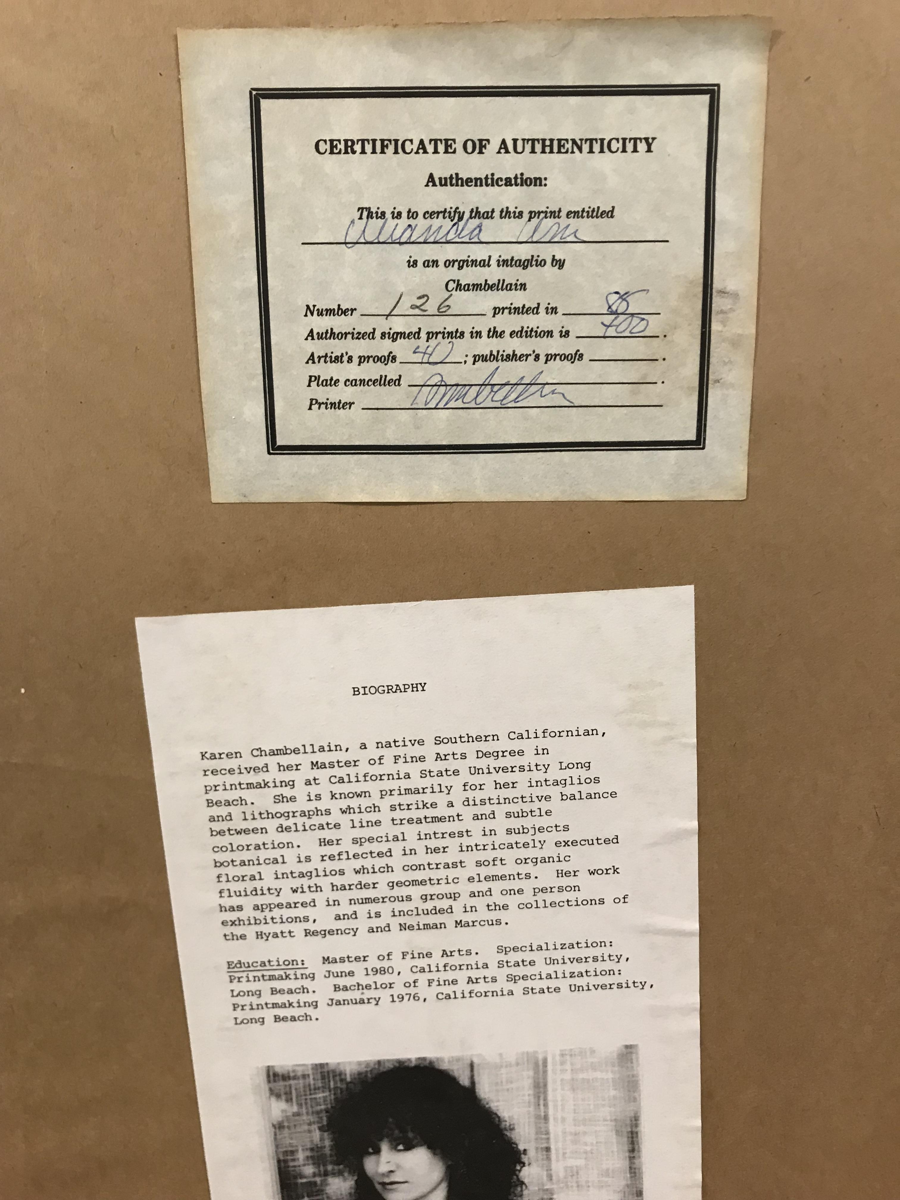 Windsor Art Products Inc IMB # AC 1324673. Name of art is Veranda Urn by Karen Chambellain and is signed. Dimensions of the art framed is 4'x3', without the frame it would be 3'x2.5'. Has always been kept in frame, art has no damage to it. Certificate of authenticity is attached to the back of the frame stating that th are is 126/400 and was printed in 1988. I do not know anything about the artist, other than her name and the little bit of information provided by a biography that is attached to the back of the frame with the certificate of authenticity.