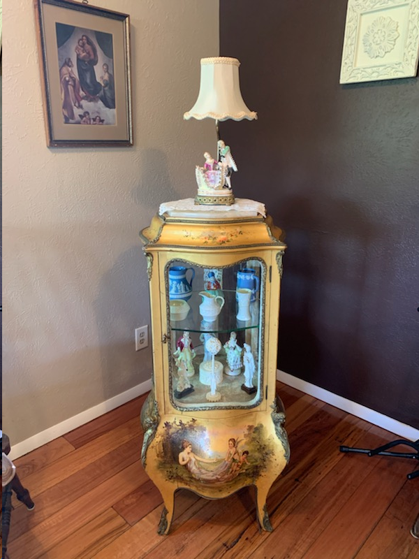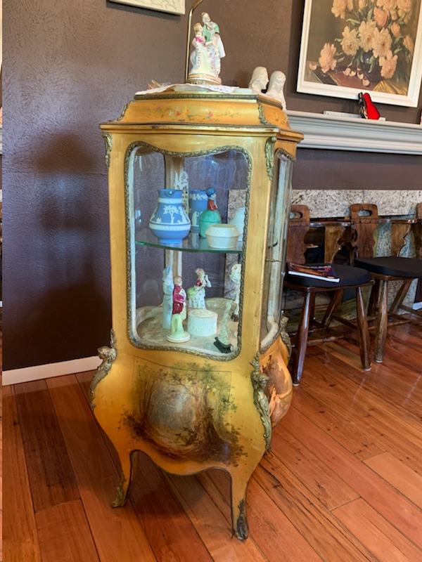Distinguishing marks Beautiful paintings on the sides. Curved glass enclosure, 1629 is stamped on the bottom edge.