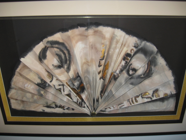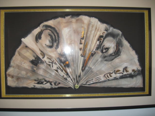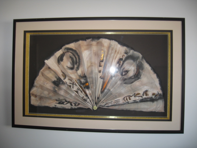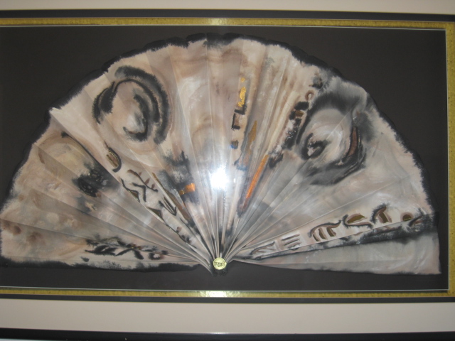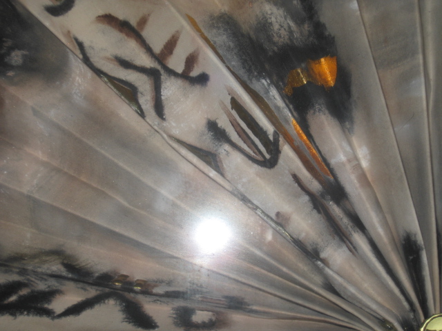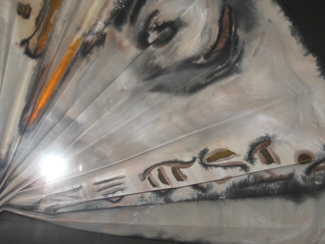 I have no idea where this fan originates from, it is very beautifull with lots of makings and symbols, it seems to be signed but I don't know by whom as I can't find any reference to this fan anywhere.