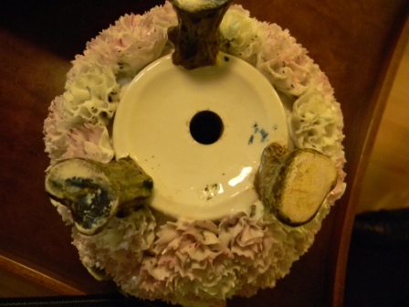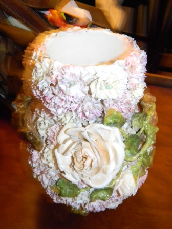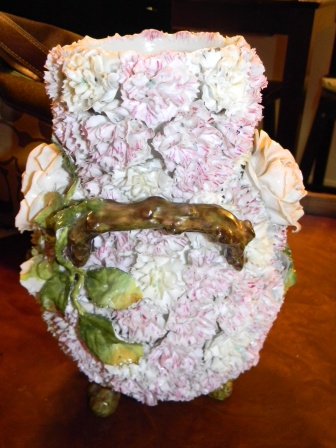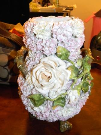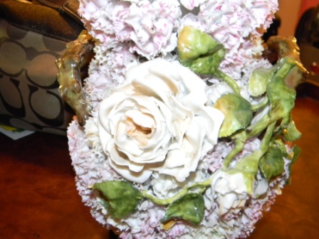 We purchased this item at an estate sale. Tag said $160, offered $80 and they took it. I felt that it was a beautiful piece and probably worth more. There are lots of very intricate hand made flowers covering the surface. Two large hand made white roses on either side. The only marking is an "817" on the bottom. It's a pretty hefty piece.