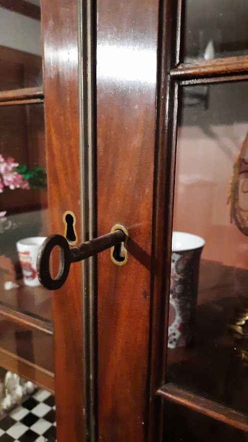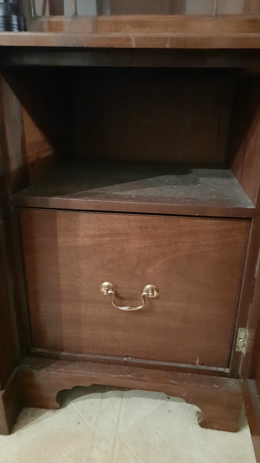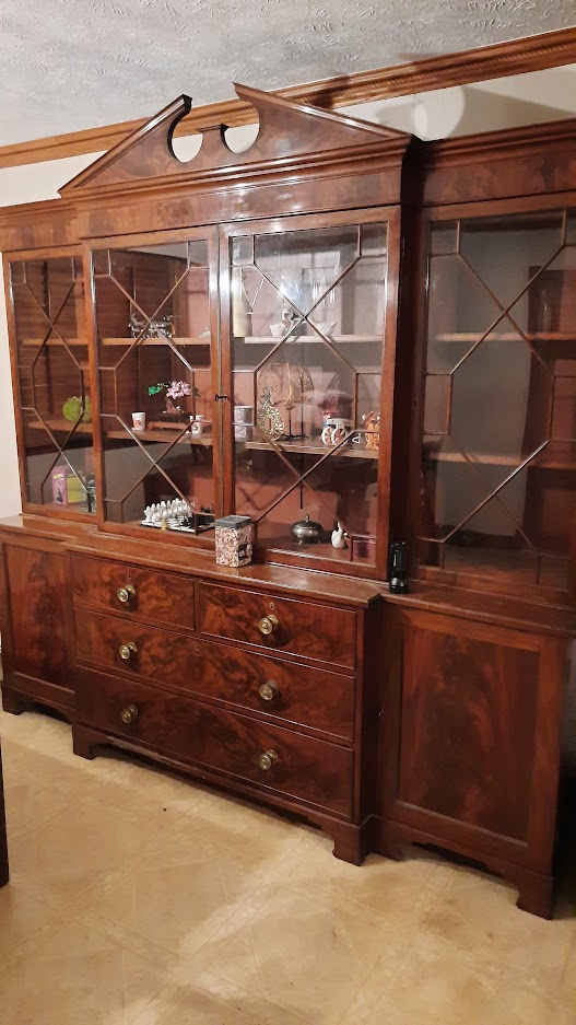 I got a very large display cabinet some time ago and I am trying to find more information on it or even a ball park range on what it may be worth. It's a very large cabinet, takes up a wall by itself and over 8ft in height (I have all of the dimensions, a bit on the rough side). It has original brass fixtures on it, and inlaid glass for the display part. Far as I can tell it's all original with minor damage from what I assume is wear and tear or moving and improper storage for a short while (neighbor I bought it from had it in a non insolated shed more or less for a while).