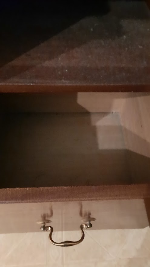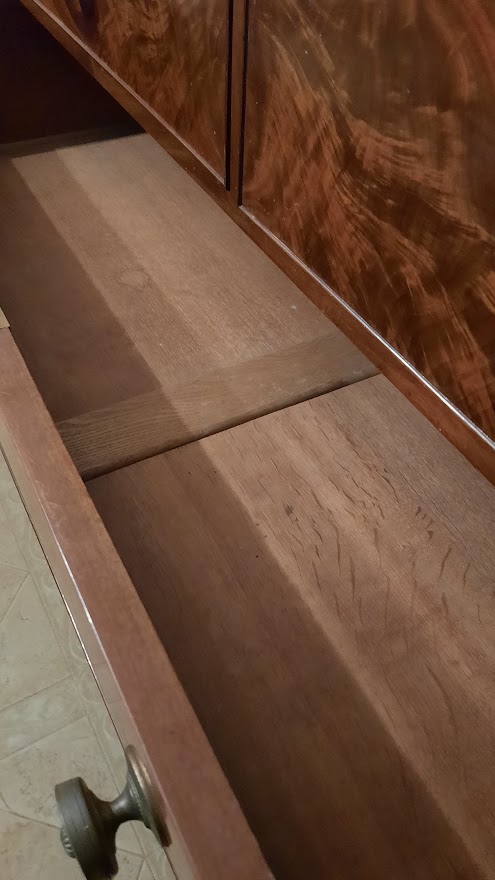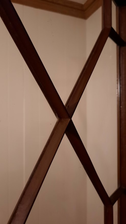 It comes apart into three sections; top or crown, middle where the display windows are and the bottom where the drawers are. I have not yet found a maker mark or anything to point out a date on it.. I'm not sure of the type of wood either. I can get more images if people need them though.