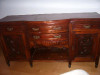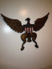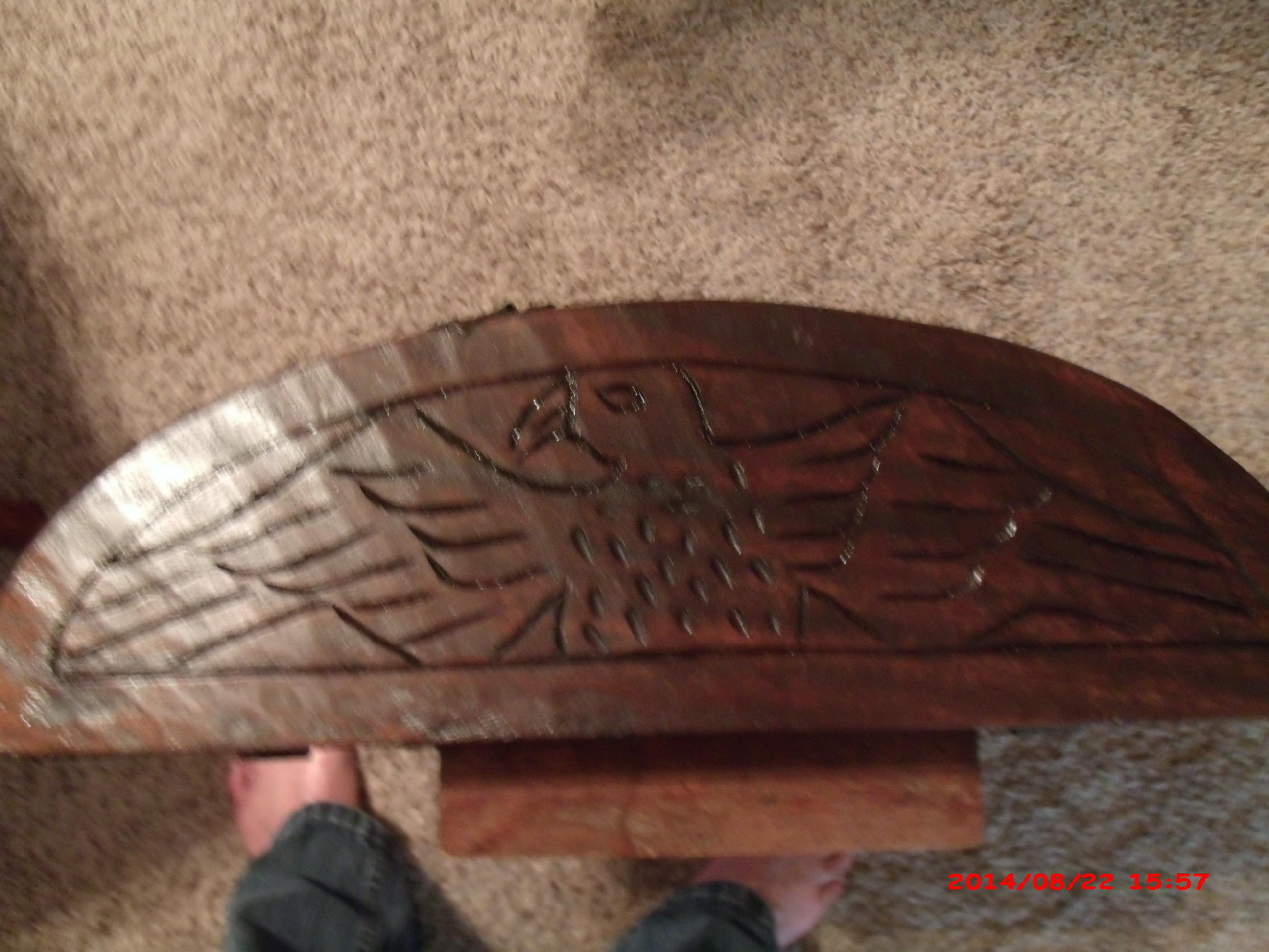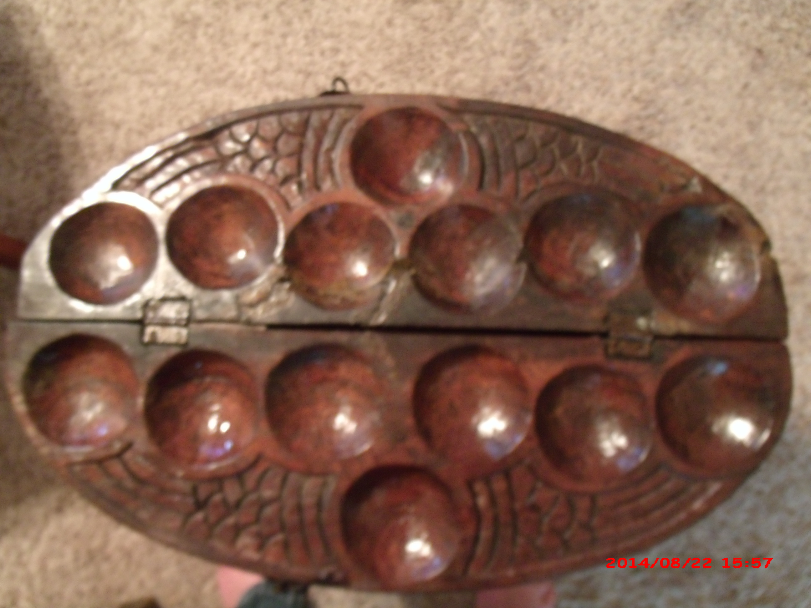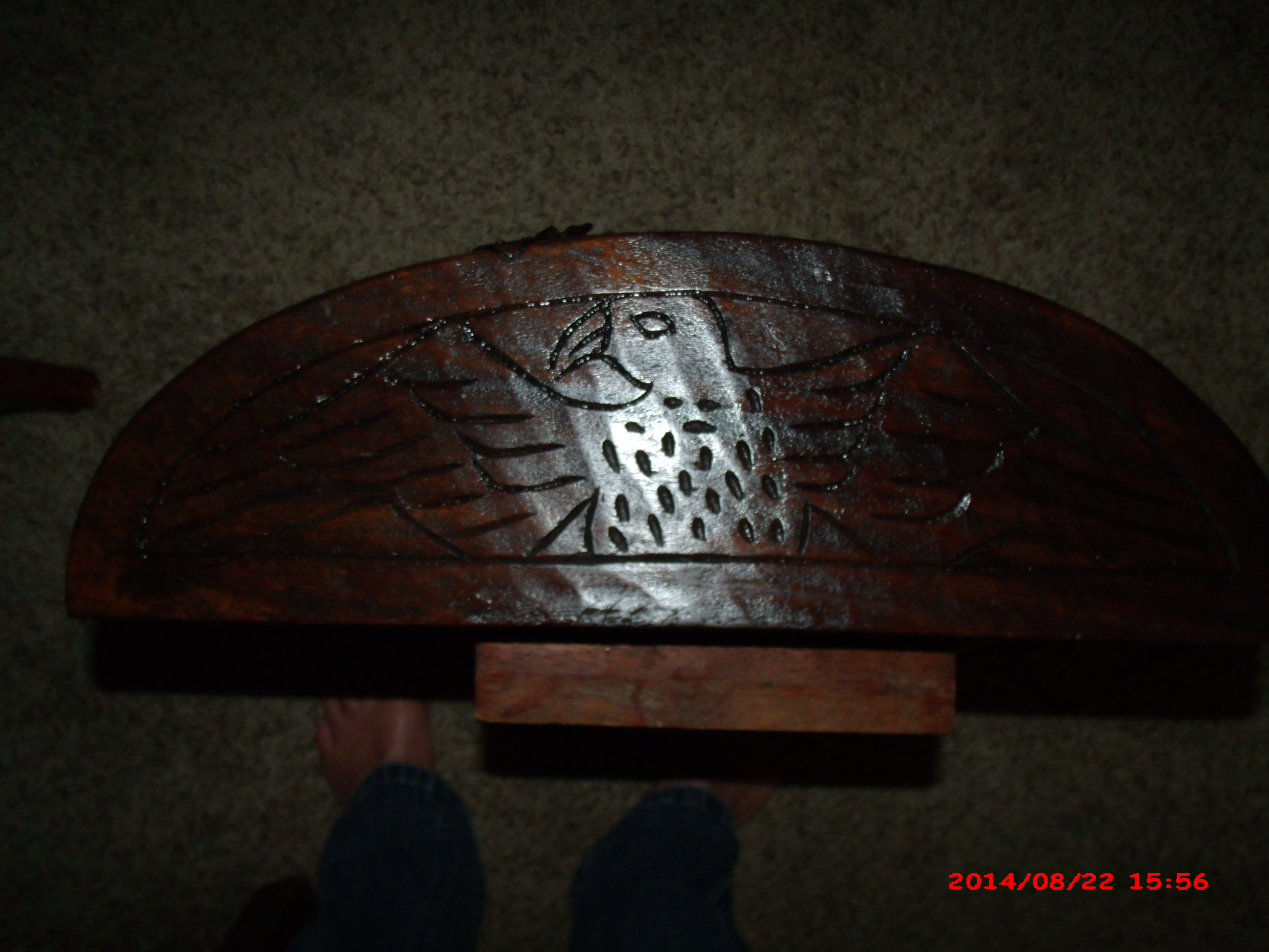 I am very interested to know what this piece is. It is very old. It is a half moon shape when closed.When open it has an oval shape,it also has when opened 14 half cup chiseled bowls. When closed these bowls line up to make seven. There are carved wings around the bowls. The outside of the box has a beautiful hand carved eagle or falcon on the lid.It has two hinges on the back and a clasp on the front. It is very heavy about 17 pound and measures 19x 12. I truly would be very thankful for ant information on this piece as I have searched for months. Its age...or origin. Thank you so much for looking.