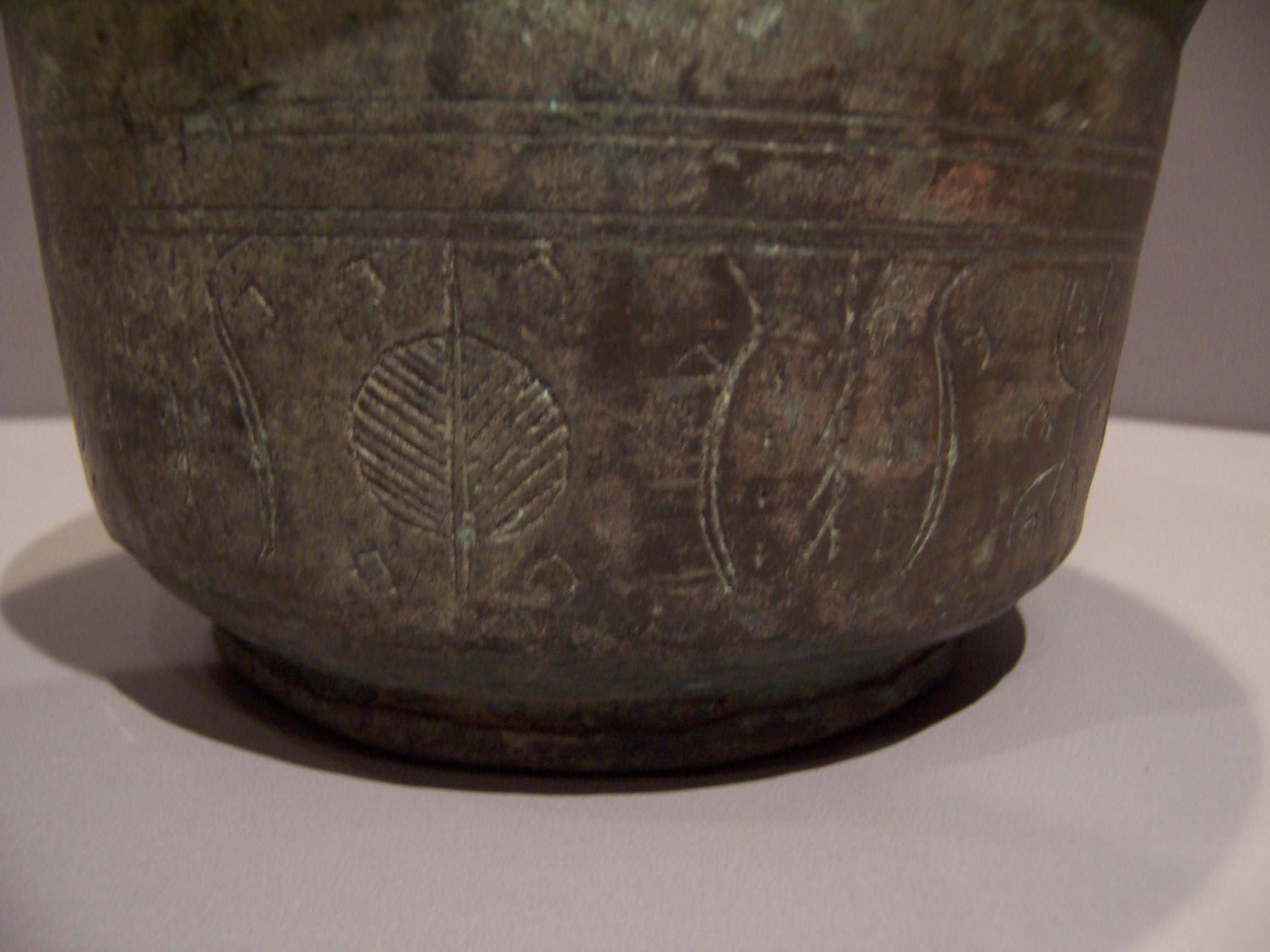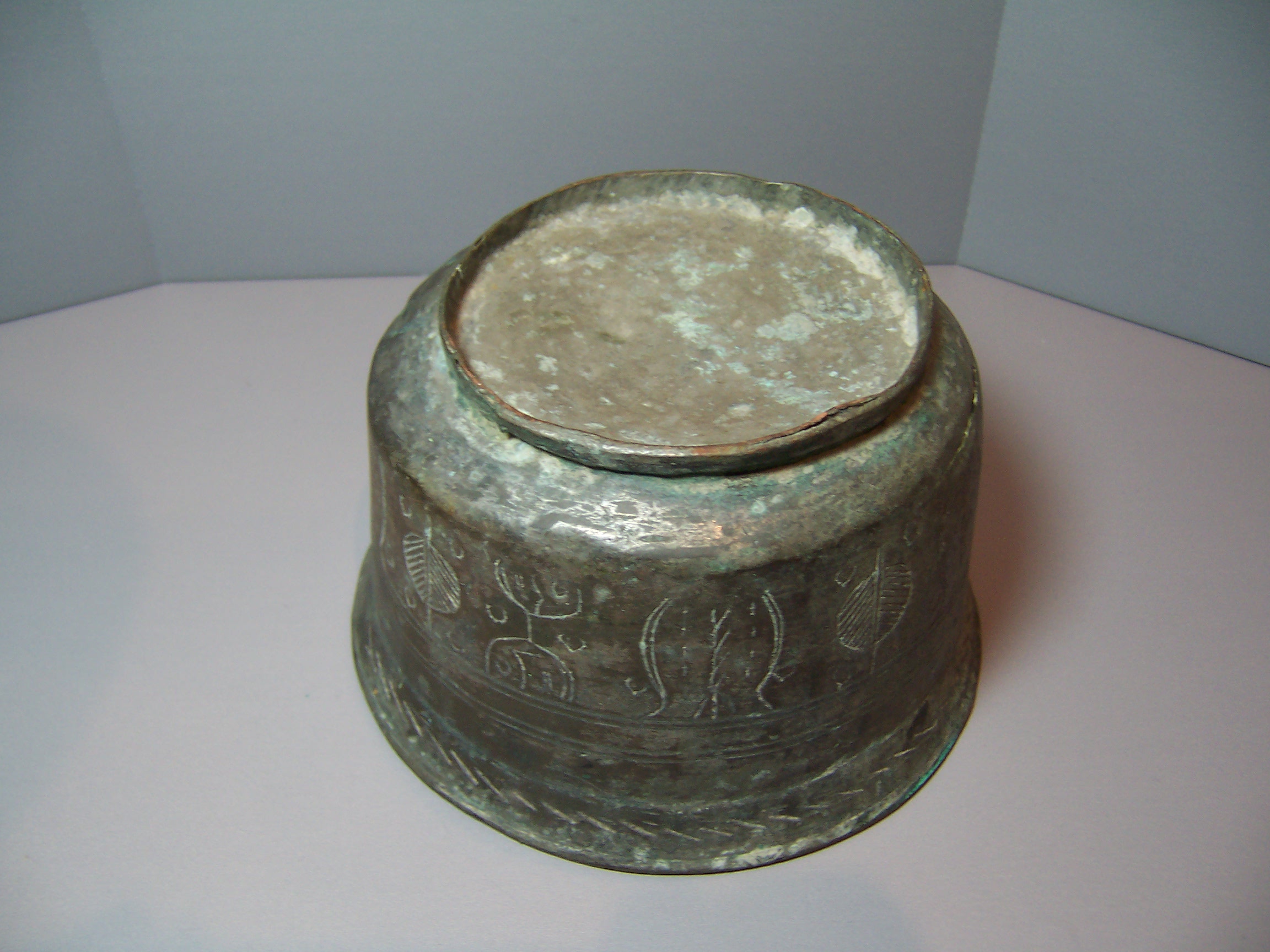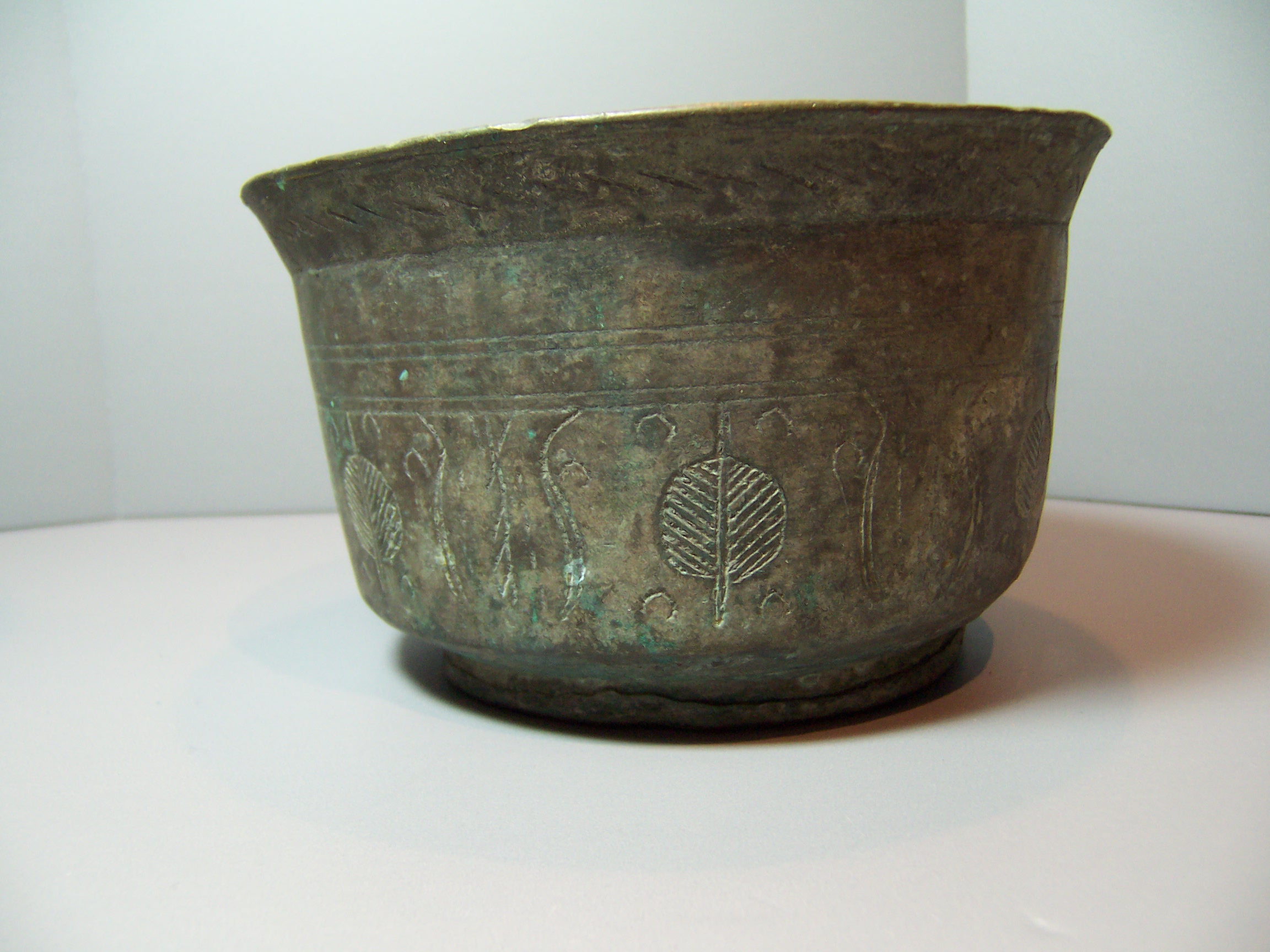 Very old bronze bowl with etched decorative repeating pattern around the bowl and under the lip. Can you help me identify this bowl, age, source, worth? Thanks for your help.