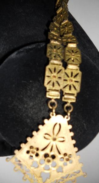 Very early necklace I found in an old chest in my inlaws attic a long time ago, they were antique collectors. The chest was full of old clothes from my mother-in-laws family. The stones are yellow and set in prongs with open back to let the light shine. The stones are beautiful and sparkle. There are no marks and looks like brass metal. There is no clasp or hook on this necklace. Any information on this piece is very much welcomed.