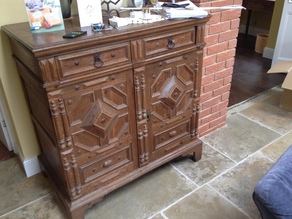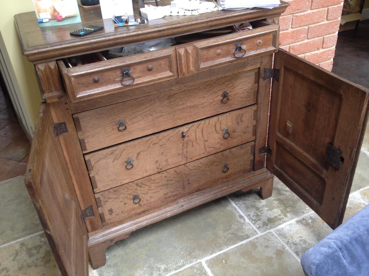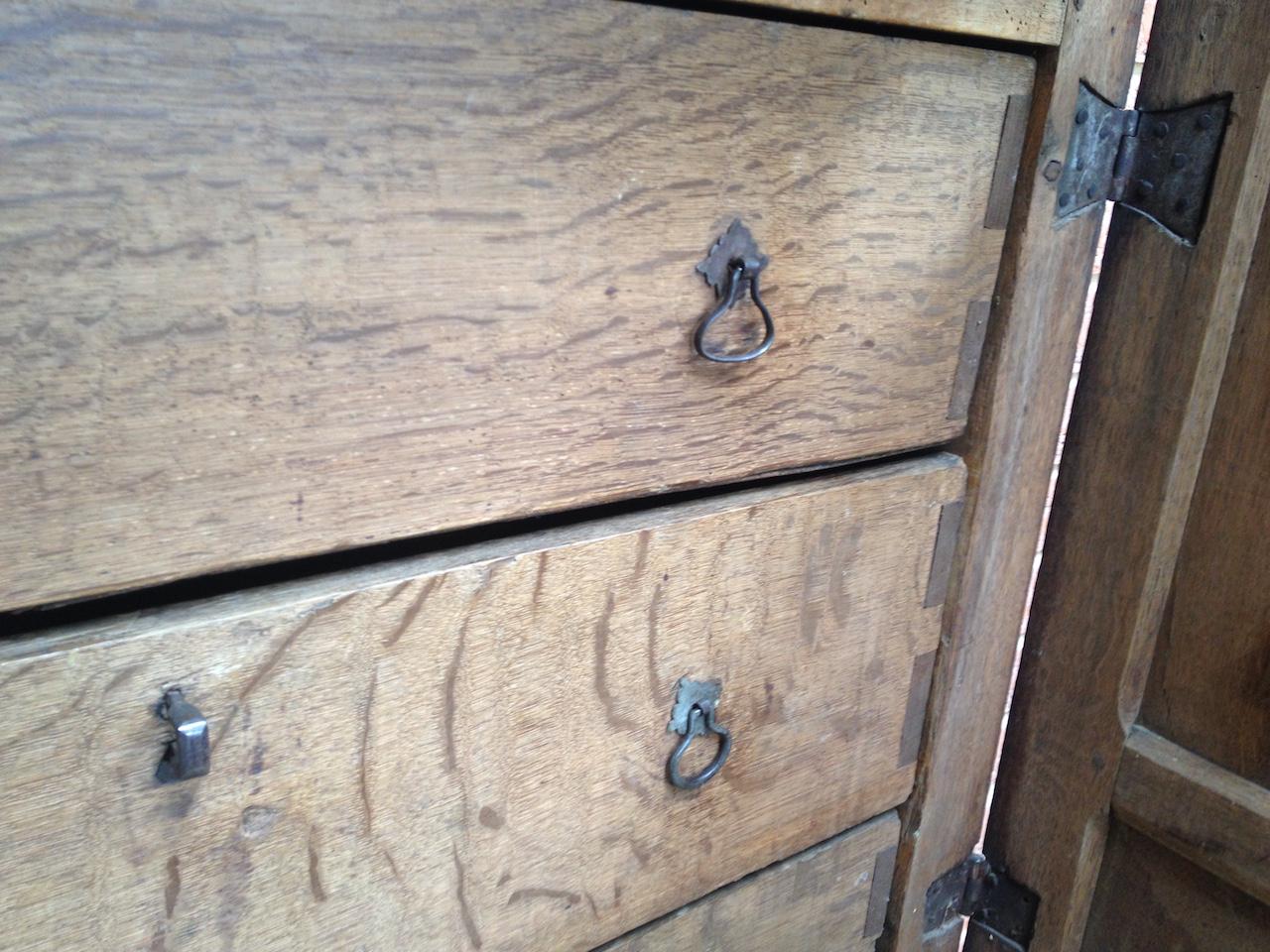 Ornate oak four drawer sideboard with single drawer in the removeable top section the top and three more deep drawers behind the detailed doors. Iron handles with decorated escutcheon plates on the exterior drawer, same handles undecorated inside. Hinges and lock appear to be of blacksmith quality.