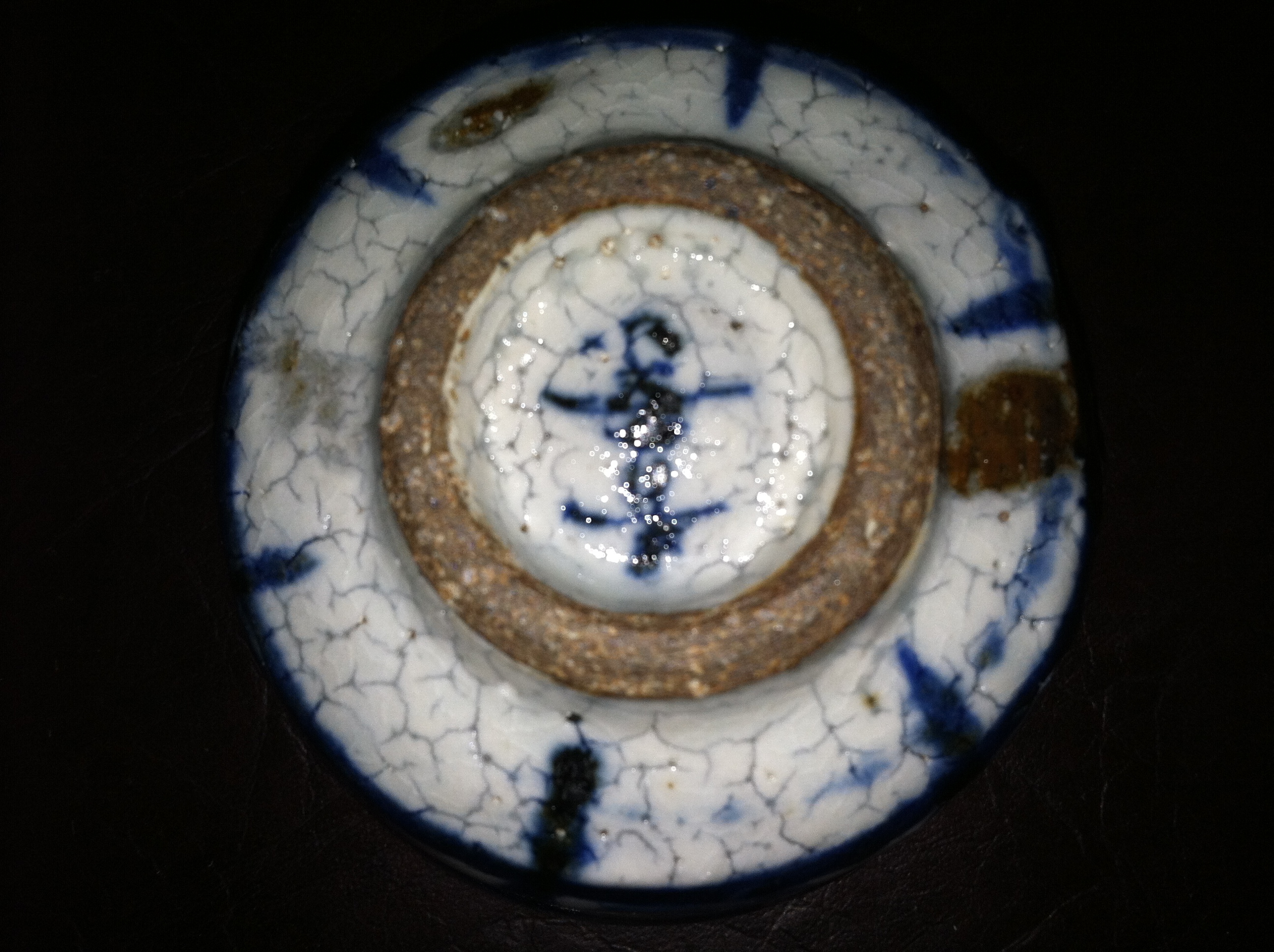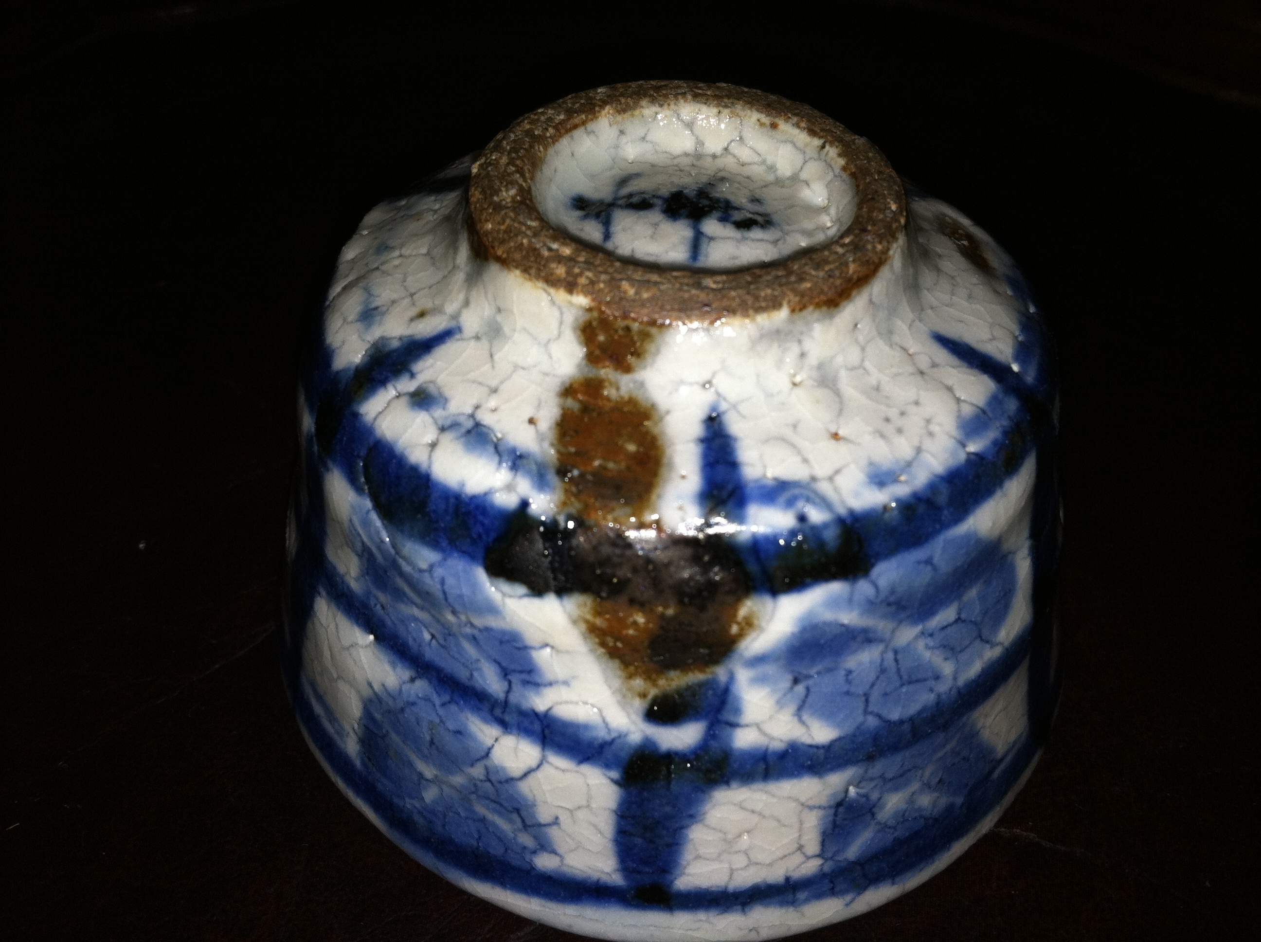 This is a very old "Blue and White Oriental Cup" that's signed on the bottom. The cup has "Brown Iron Spots and a Crackling Surface" which helps identify this item as being at least several "Hundred" years old....