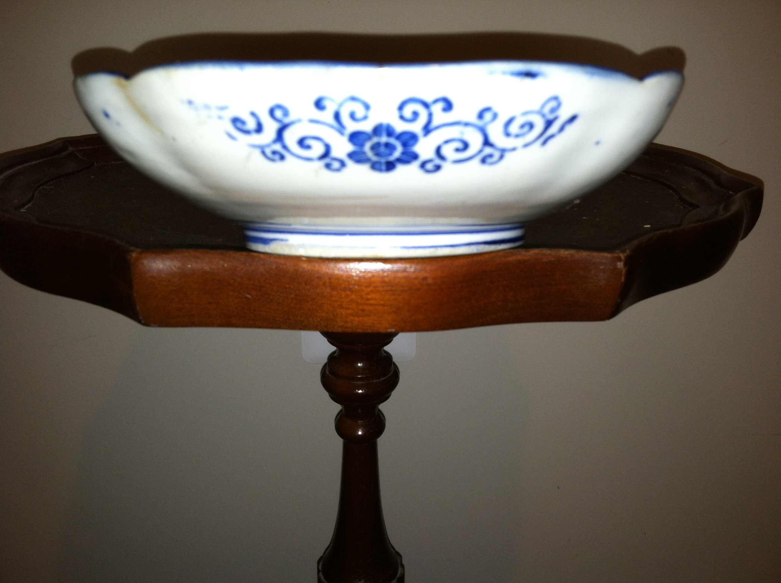 This is a very old "Blue and White Dish". It's not signed and it has a small chip around the top rim. It's H 1' 1/2 x L 7" 11/16....