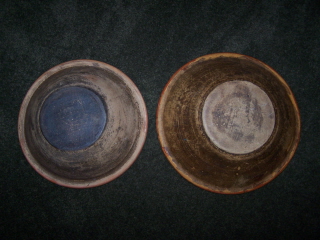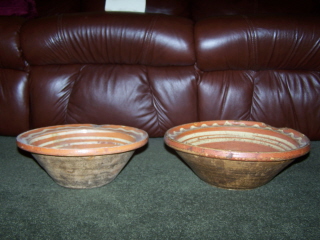 These were bought at a auction by me about 6 years ago. I have more but they are not this fancy. The other ones I have are decorated with one line at the top and maybe one wavy line at the top. Some are plain. They are heavy and well used.