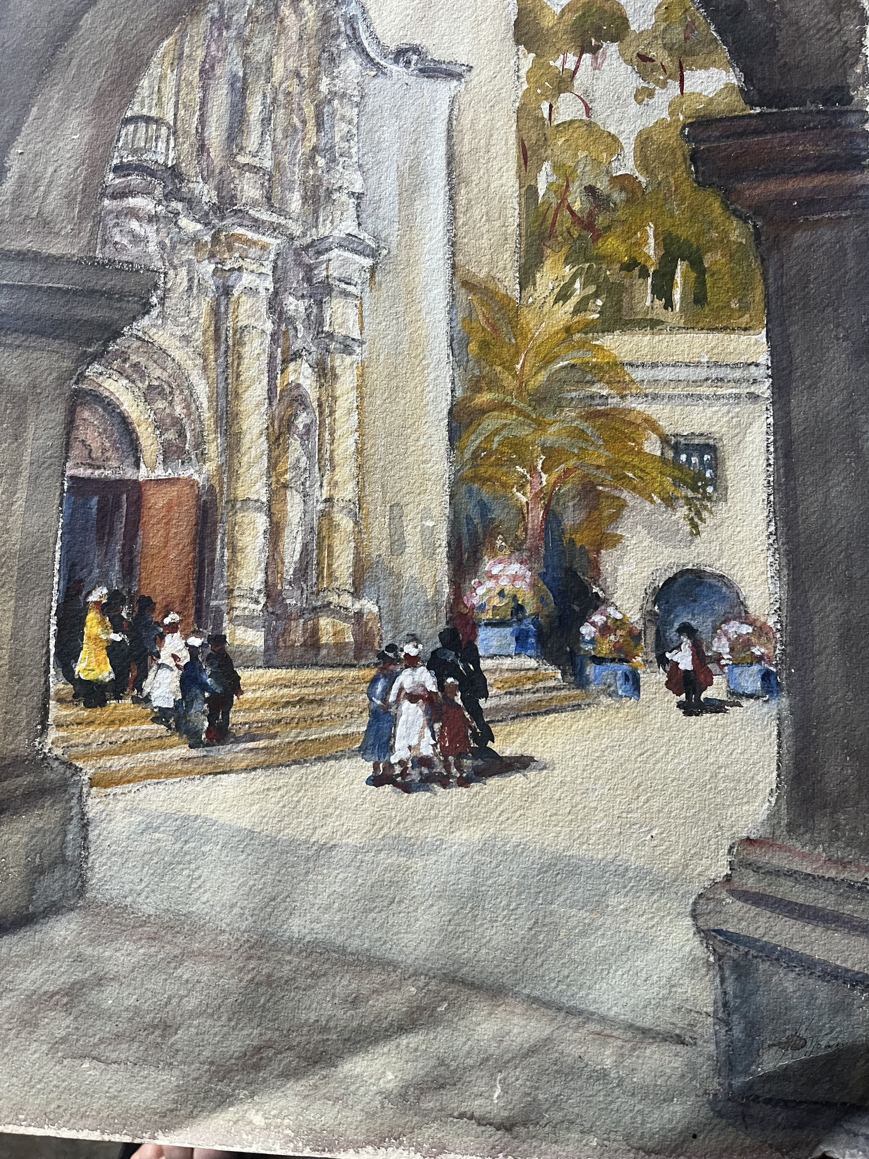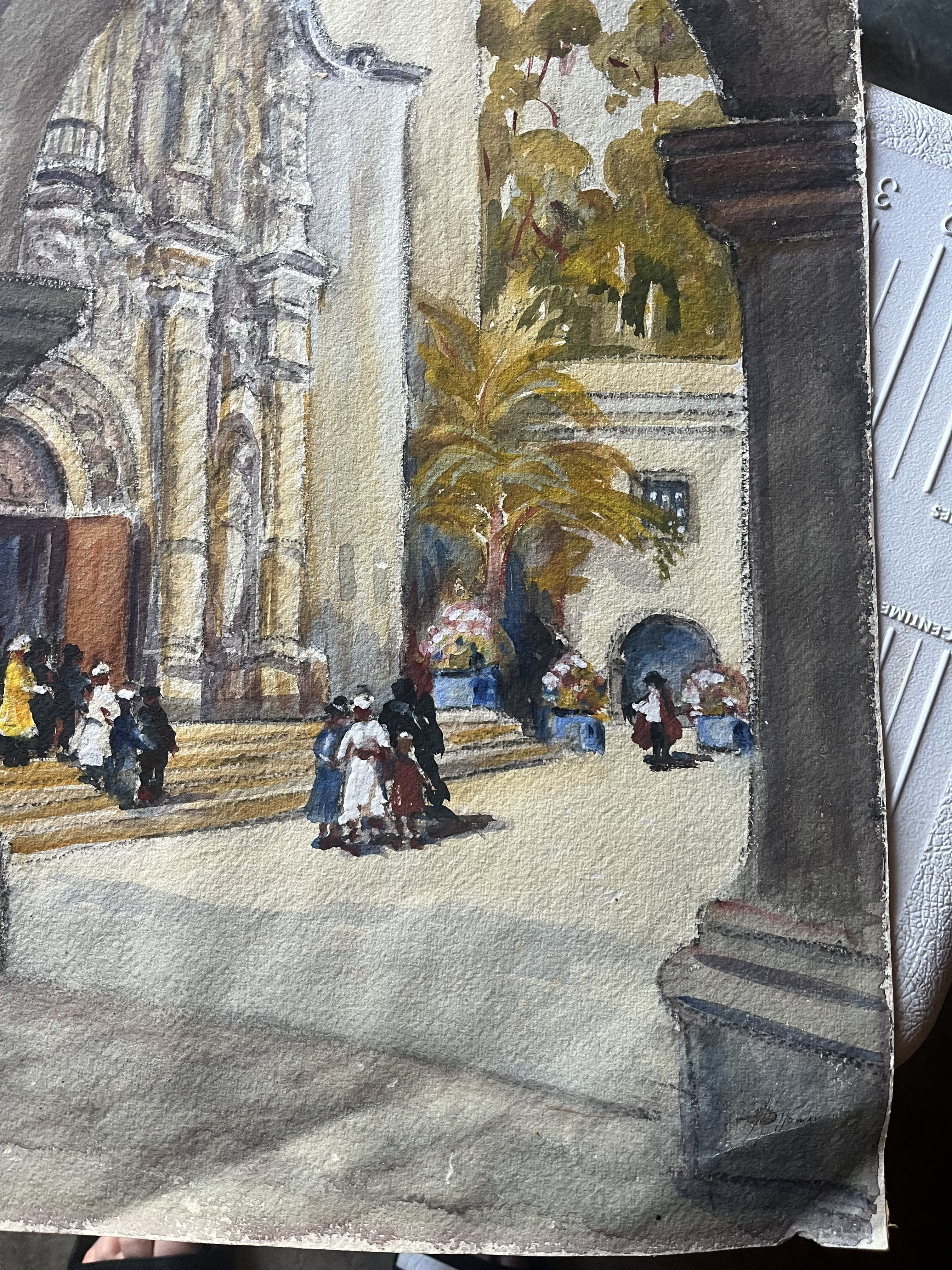 14 x 20 x 65 hand drawn sketch. Appears to be a busy town square with many people and decorative collums.