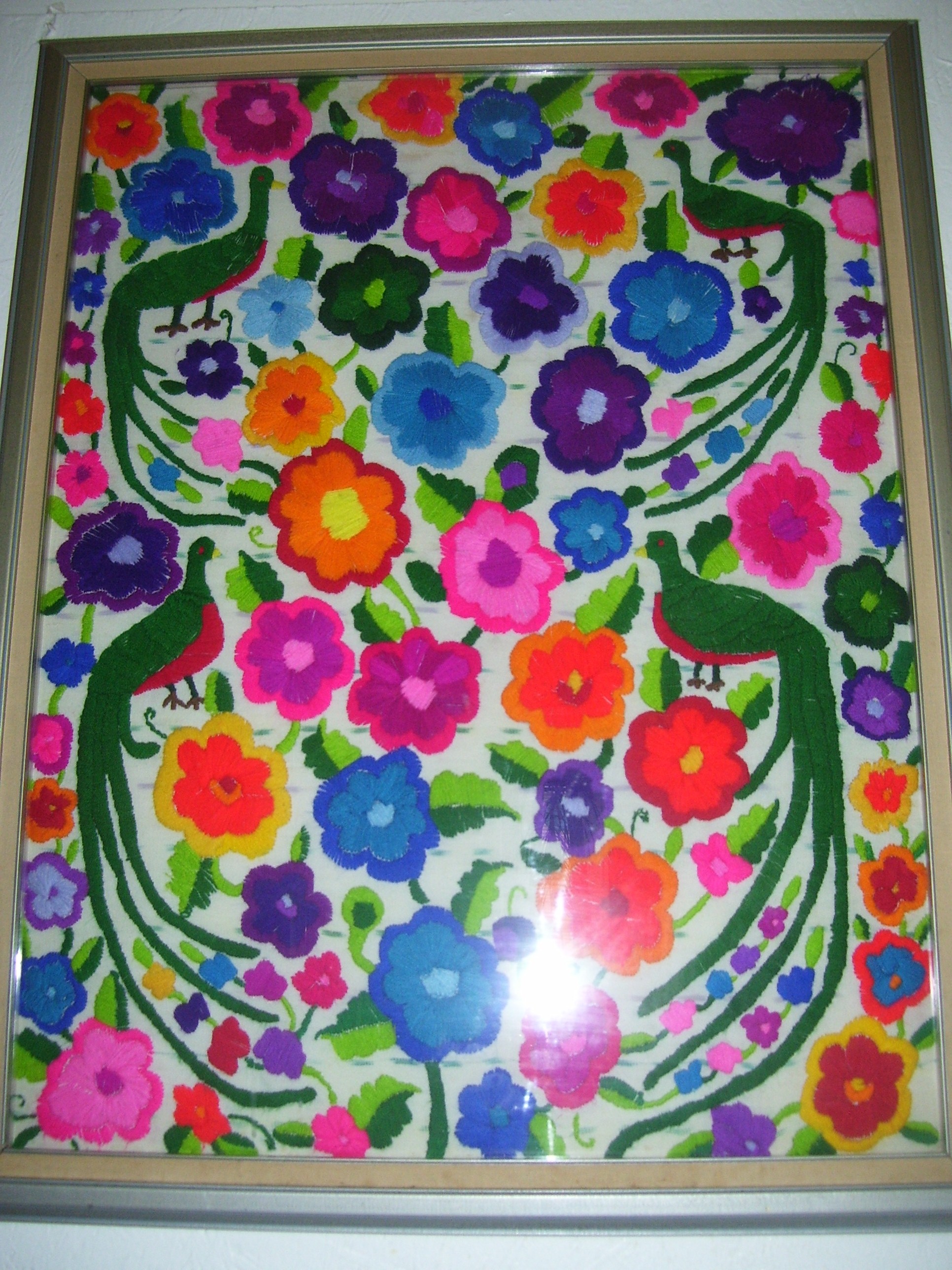 This is a really funky piece I scored at a yard sale~~Three bucks!! It's pretty sizeable measuring 38"H x 30"W,Framed.Deciphering what it is stitched on is hard.Looks like some light form of burlap/ canvass stuff.Four peacocks or birds of paradise(?) and then a slew of flowers and vines all stitched in thin yarn/heavy embroidery.I really like it and would like to find out what type of regional/ethinic style I am looking at as I would like to look for similar items.