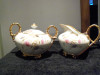 There is a floral pattern, pink blossoms with cream centers, yellow and brown leaves, blue-green and brown leaveson light brown limbs. All outlined in gold trim. All on creams colored background. Around neck is brown with gold multi sized ovals and gold trim around rim.