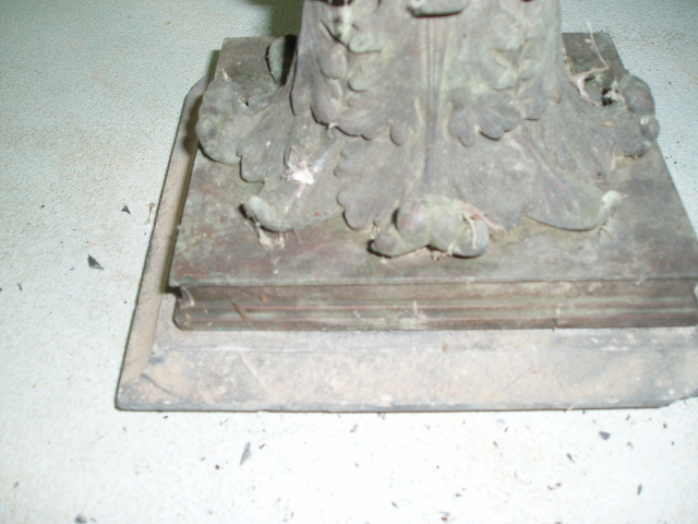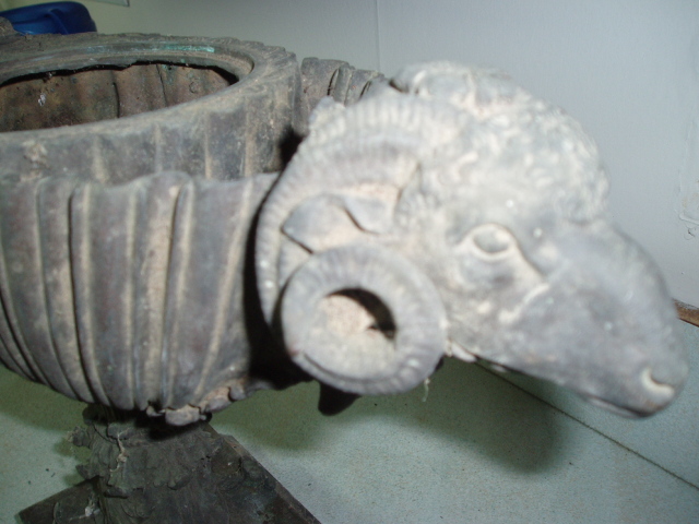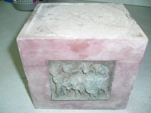 I think the base goes with it but am not certain. The only thing that looks wrong with it is that the ram on the front has a piece off of one of his horns and if the base is a part of it, one of the four scenes is missing. The middle piece on the top comes off and next to the ram is an opening. The top also comes off of the stand and it is very heavy (maybe for incense?). There is a hole in the top of the ram.