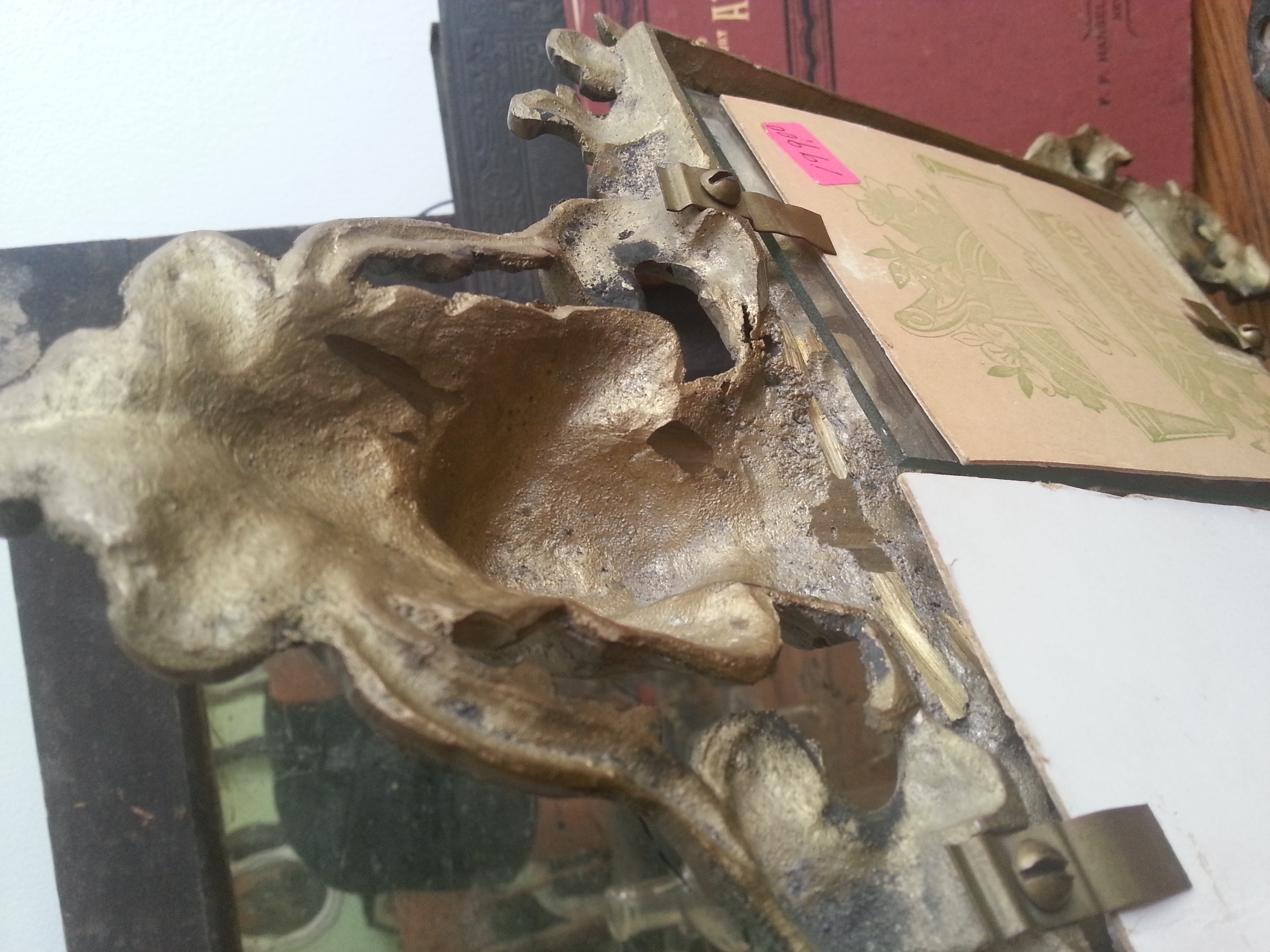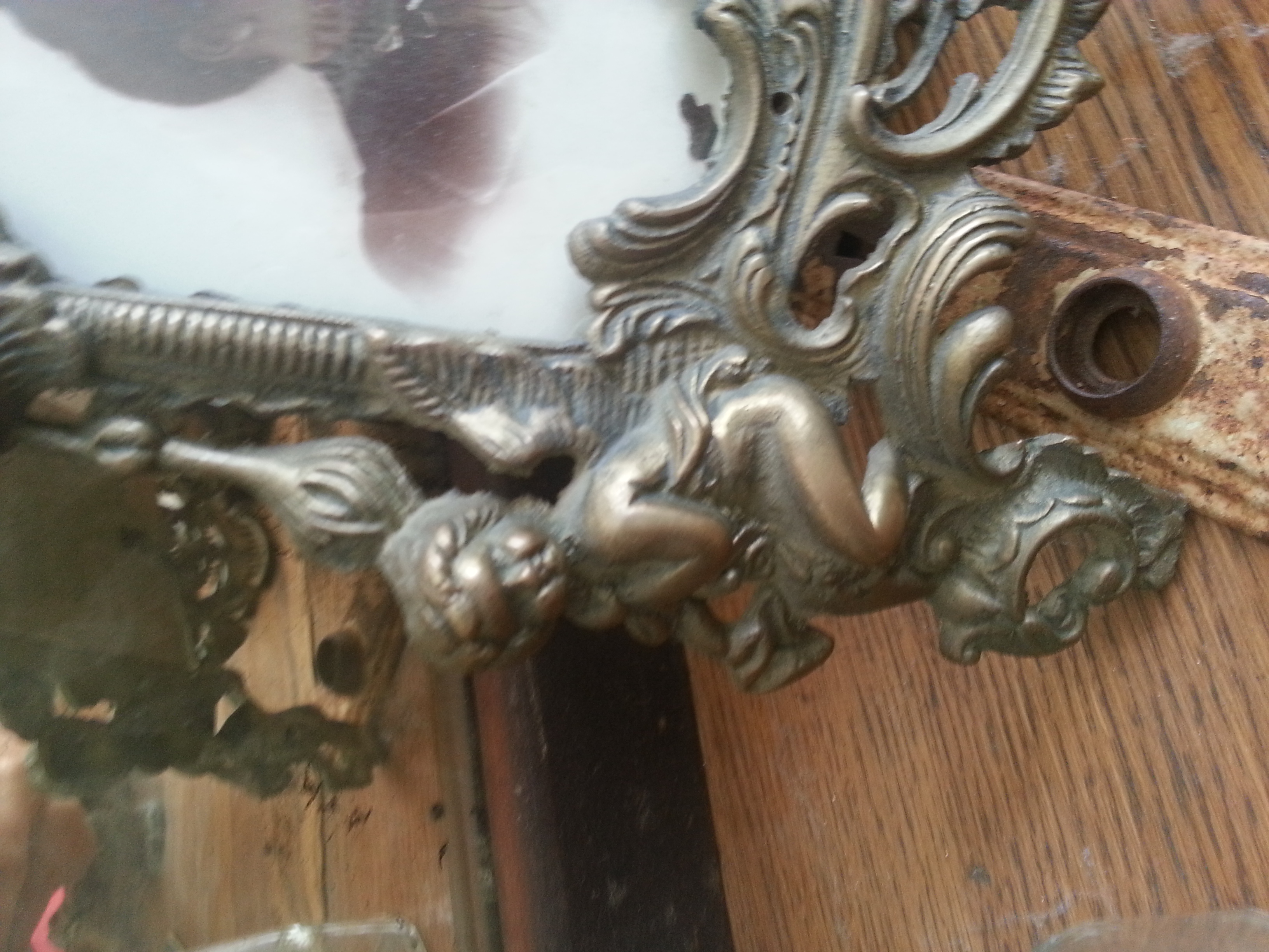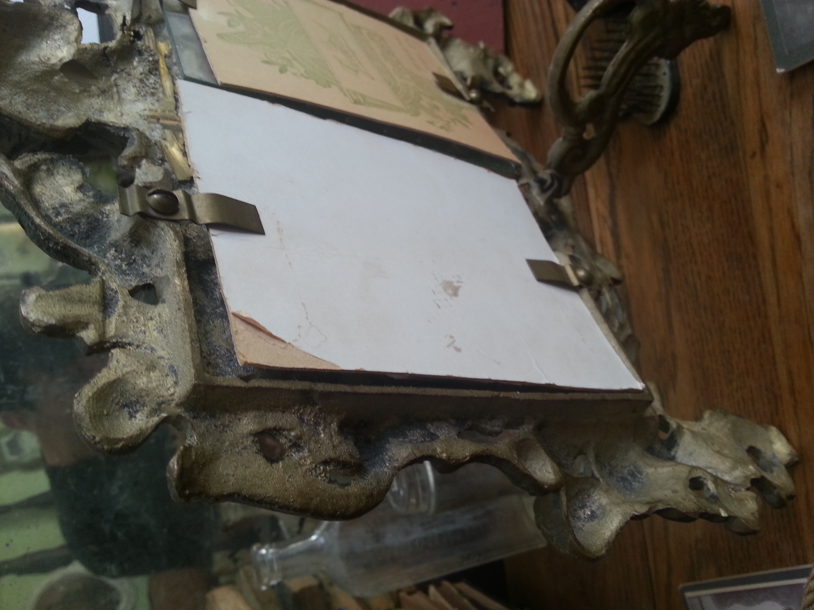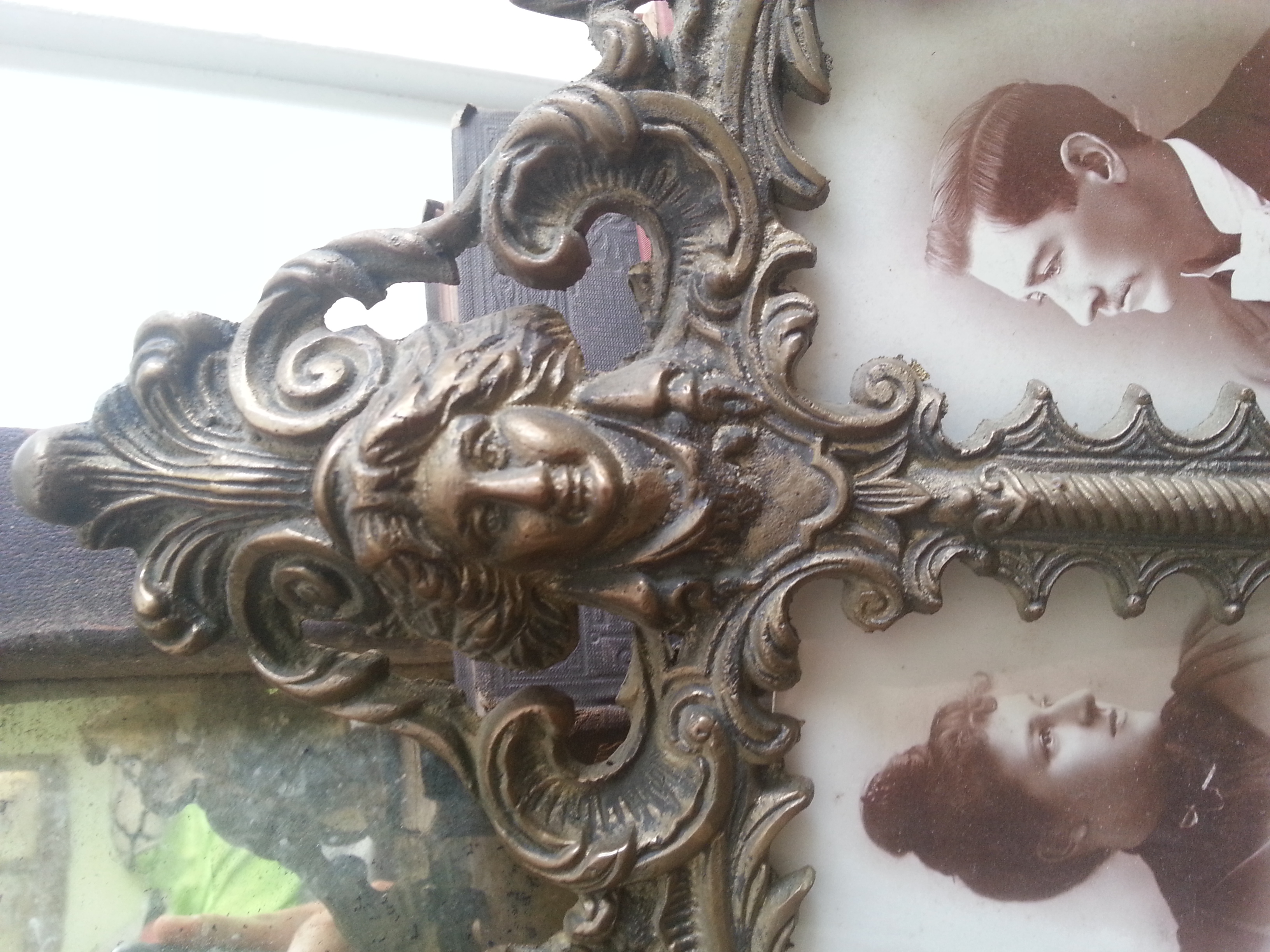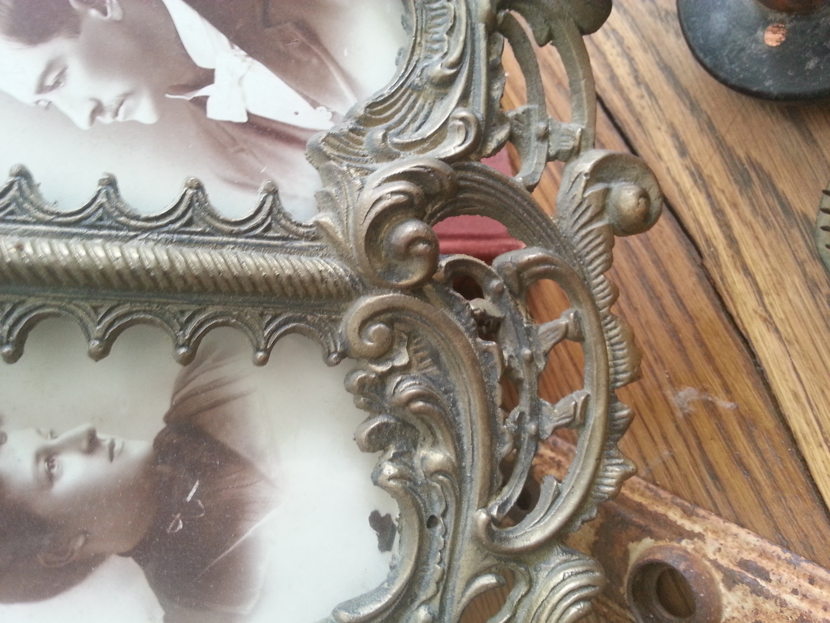 What a beautiful frame, especially complete with the photos and all. Circa 1880-1890 for sure. Made of bronze, as far as I can tell. Bronze is darker and more matte like that, brass is more gold and shiny. It's probably worth around $80. The photographs are also around the same time period.