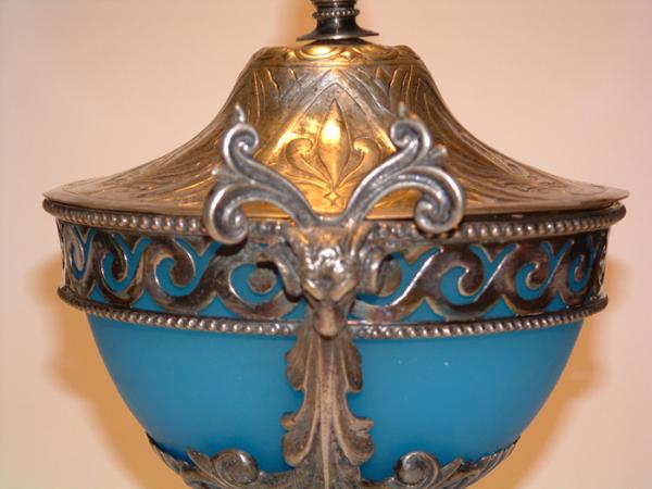 Victorian compote made of silver plate and blue frosted glass. Tam's head handles, and what appears to be an acorn top. No other information available. Photos must suffice.