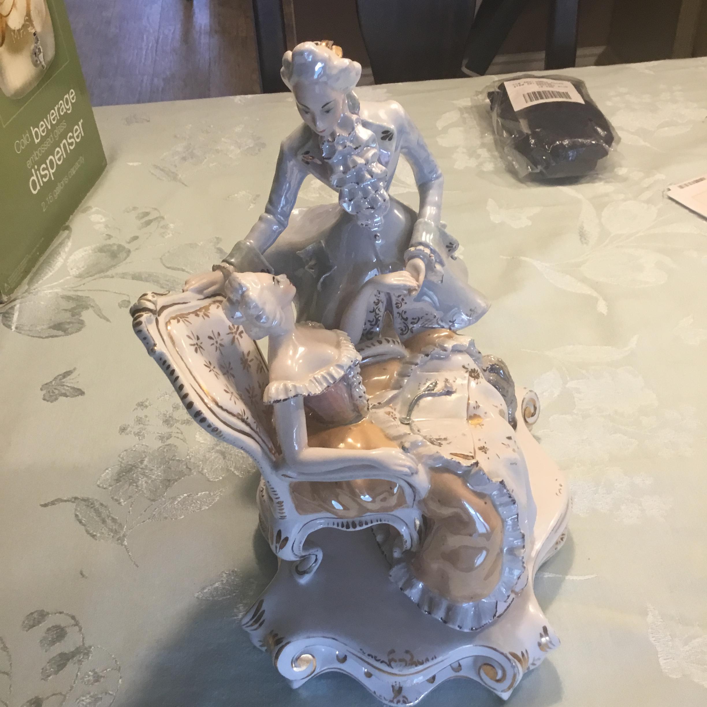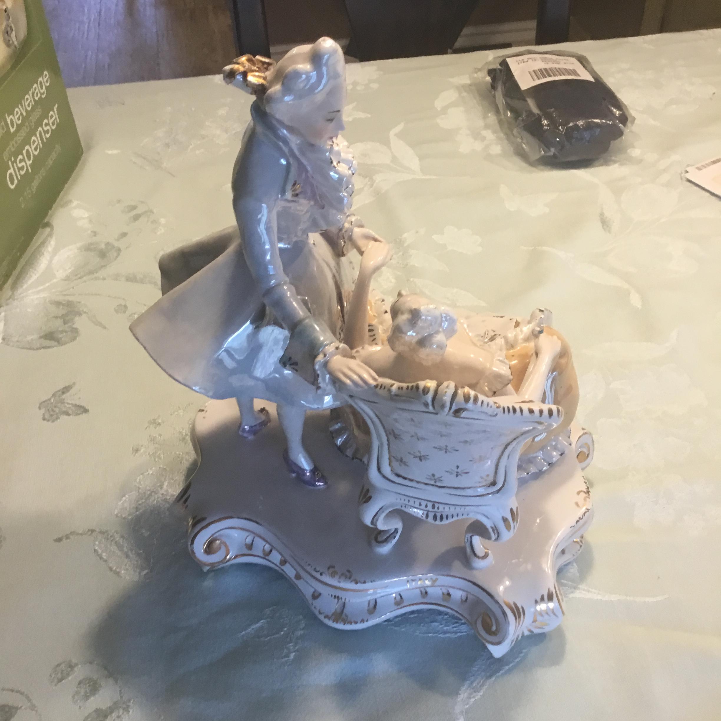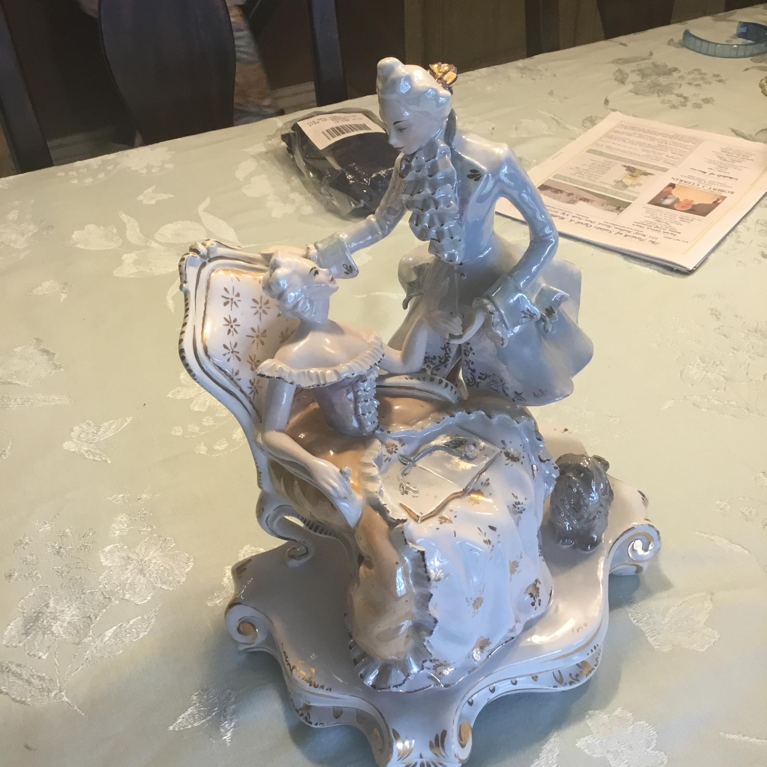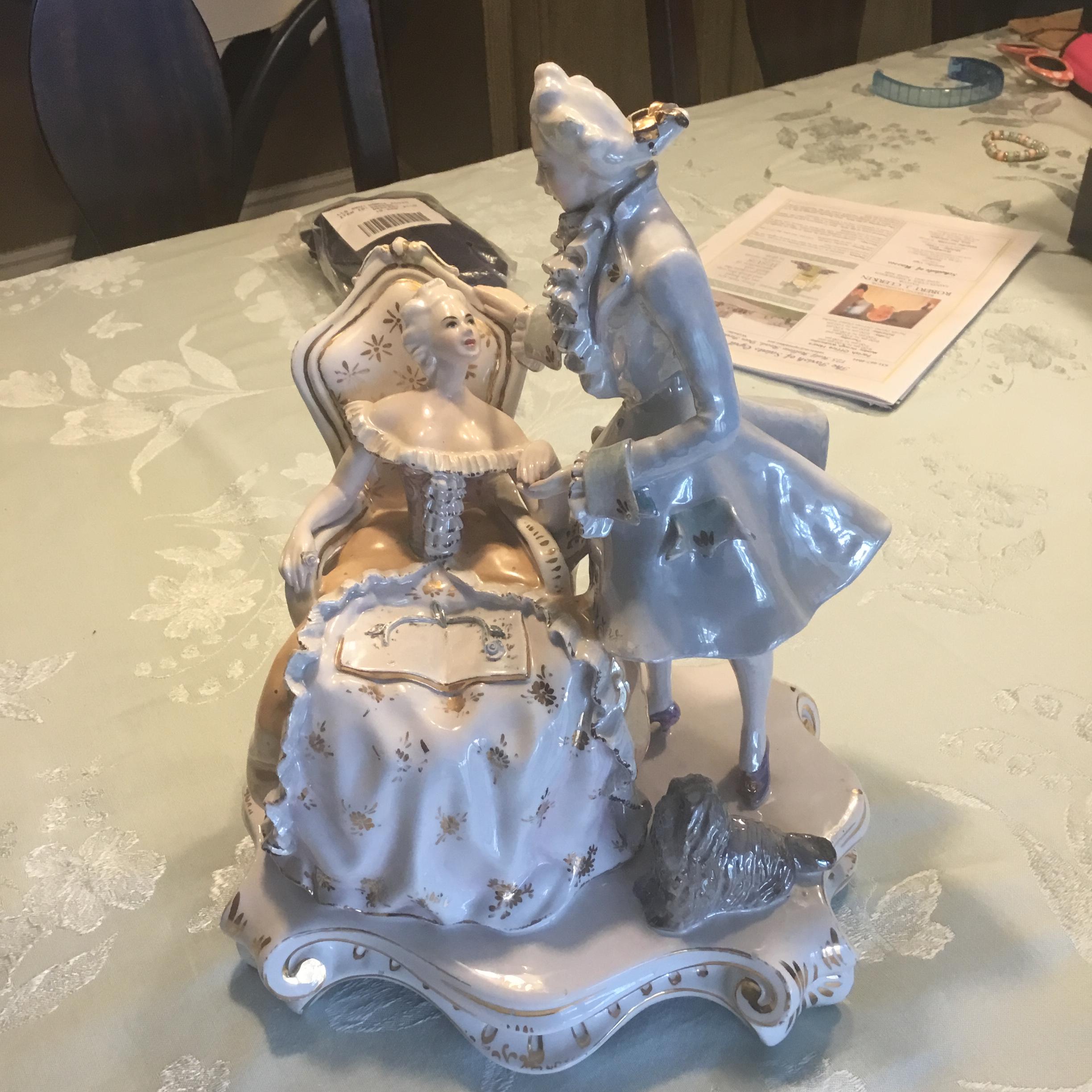 Porcelain figurine. Woman sitting in arm chair. Gentlemen standing. Both looking at each other. Woman’s left hand in gentleman’s left hand. Dog sitting by their side. Back of figurine base says Italy. On the bottom is marked 186 or 86 Italy. There is also a crown symbol with what looks like the number 9 or another symbol below the crown.