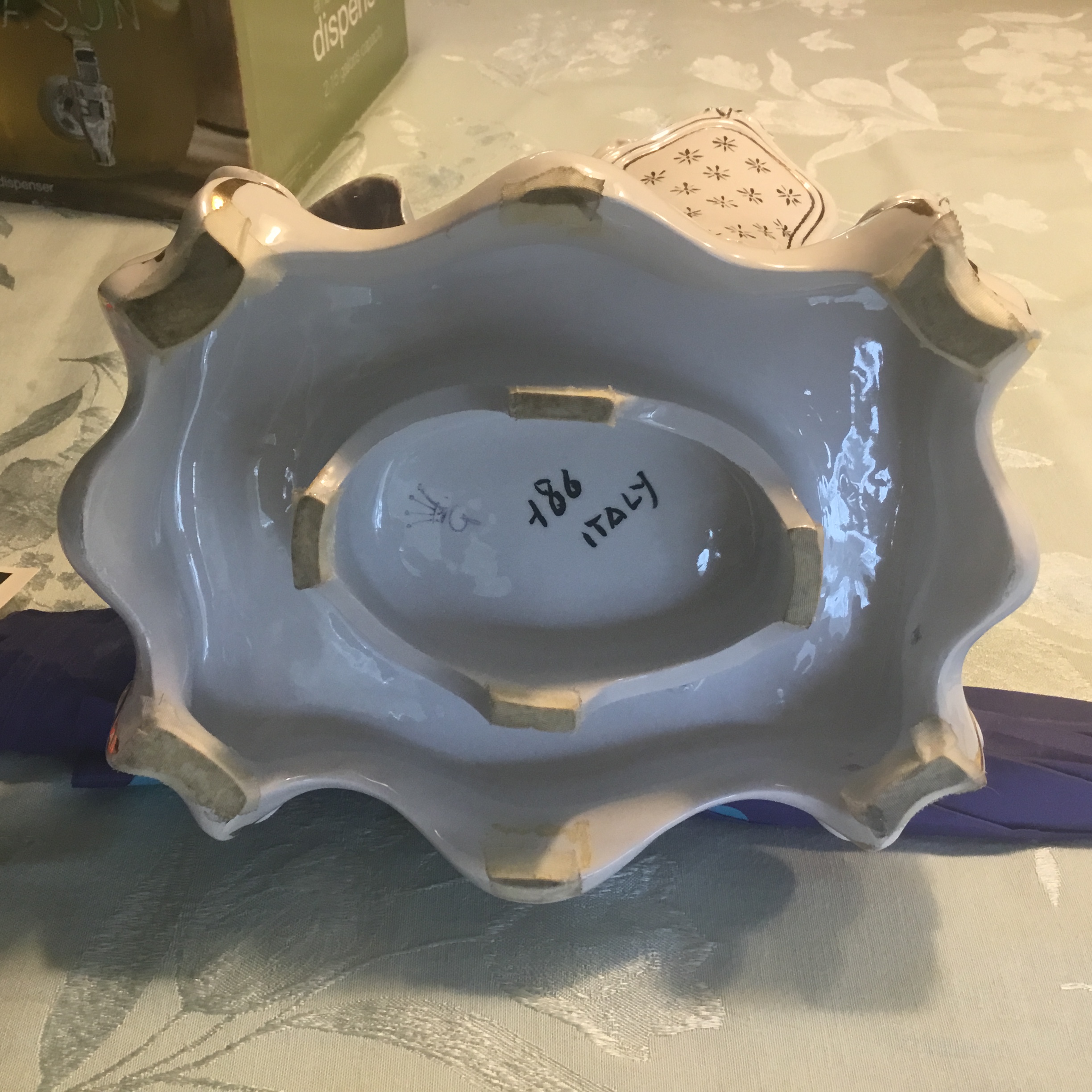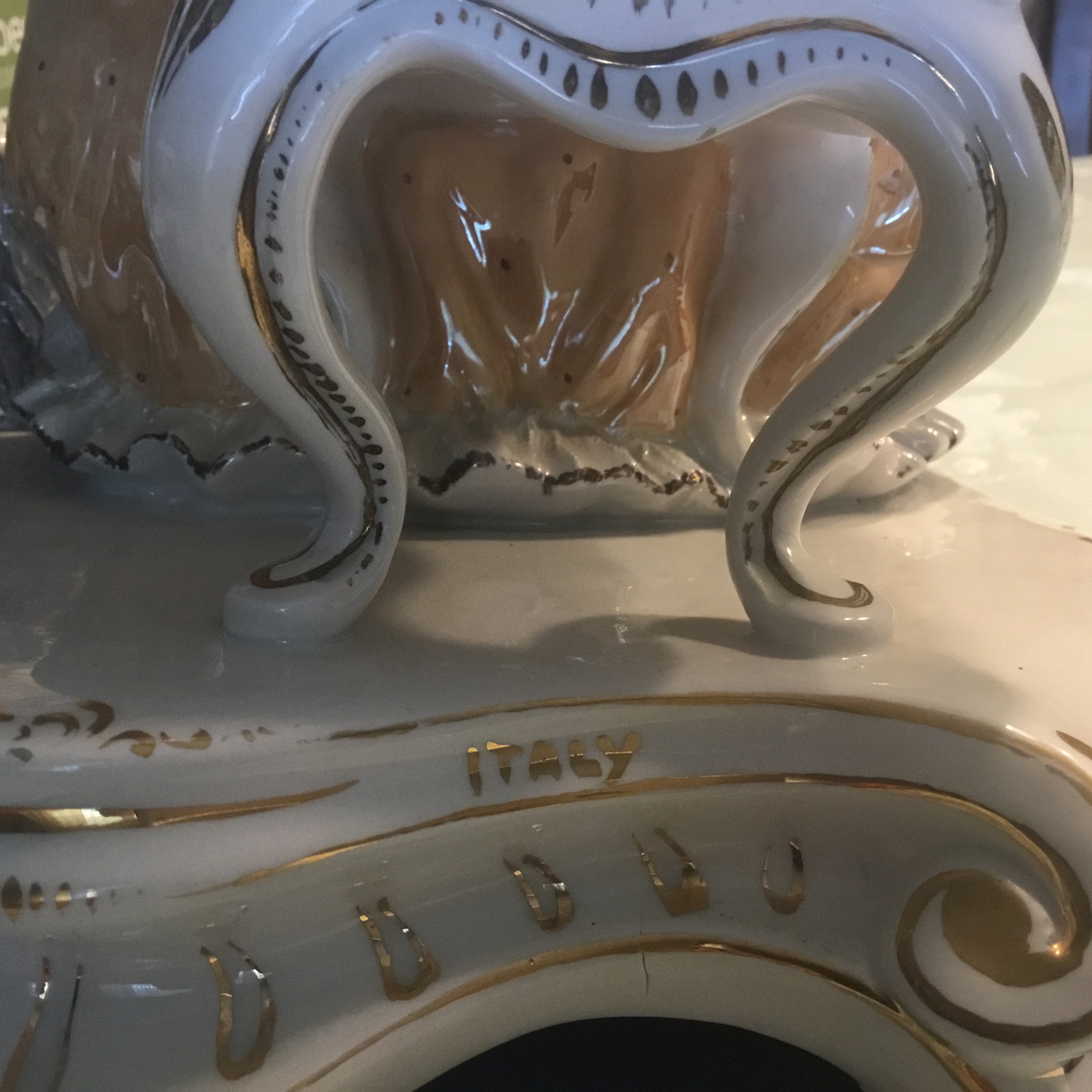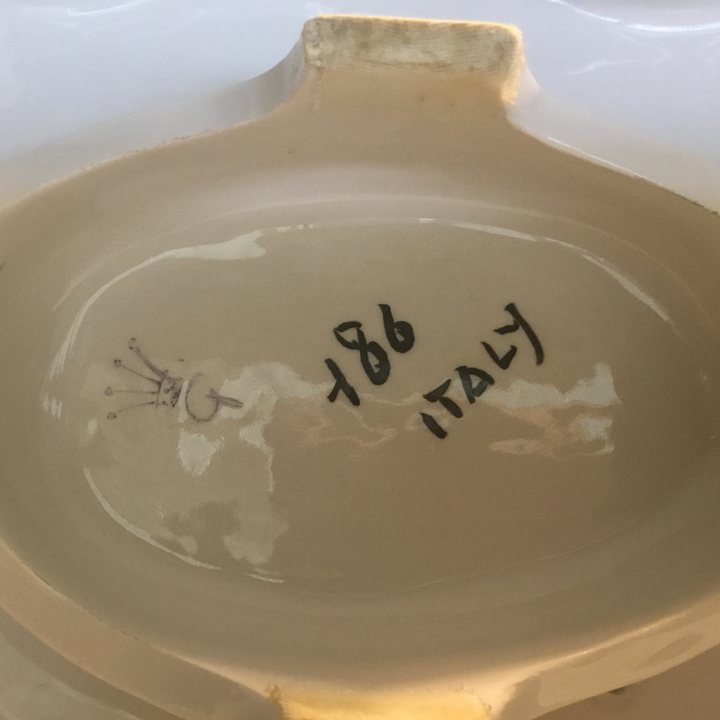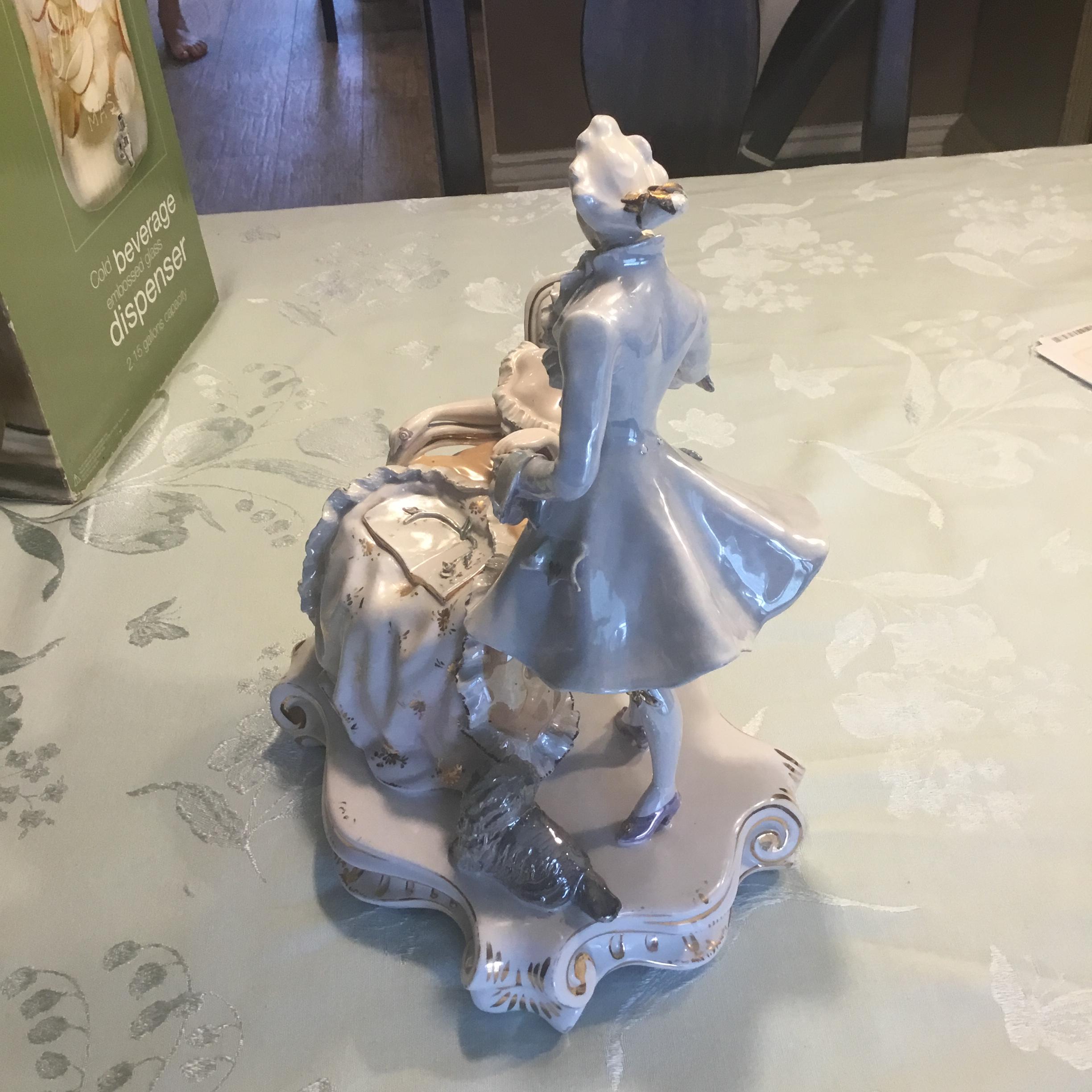 Porcelain figurine. Woman sitting in arm chair. Gentlemen standing. Both looking at each other. Woman’s left hand in gentleman’s left hand. Dog sitting by their side. Back of figurine base says Italy. On the bottom is marked 186 or 86 Italy. There is also a crown symbol with what looks like the number 9 or another symbol below the crown.