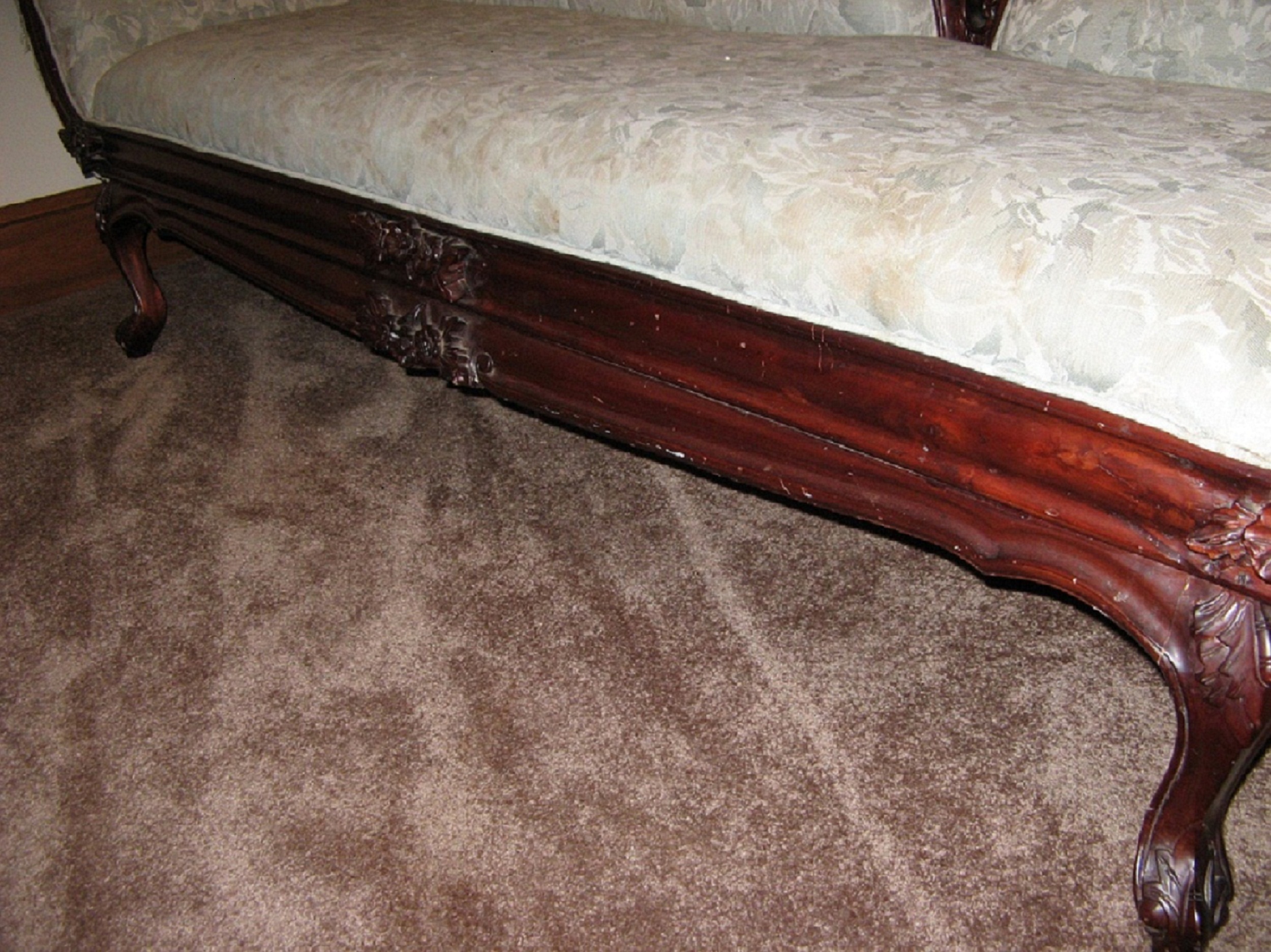 This is, I think, a rococco couch. It is heavily carved with fruit, flowers and foliage. The frame is very sturdy, no cracks in the wood. This is not, the original upholstry and currently the fabric shows water stains and there are minor scratches on the trim but nothing that is damaging to the wood itself. I would like to have the style confirmed and when you might think this was produced and by whom.  I am trying to decide if I should sell this or get it recovered.  Thanks!
