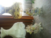 Figurine is about 8" high and about 7" wide. It show a Victorian couple in front of a vanity. The man is sitting and wearing a maroon and green coat and gold knickers. The woman is standing and bending toward the man wearing a dress with a dark blue top and light rose skirt