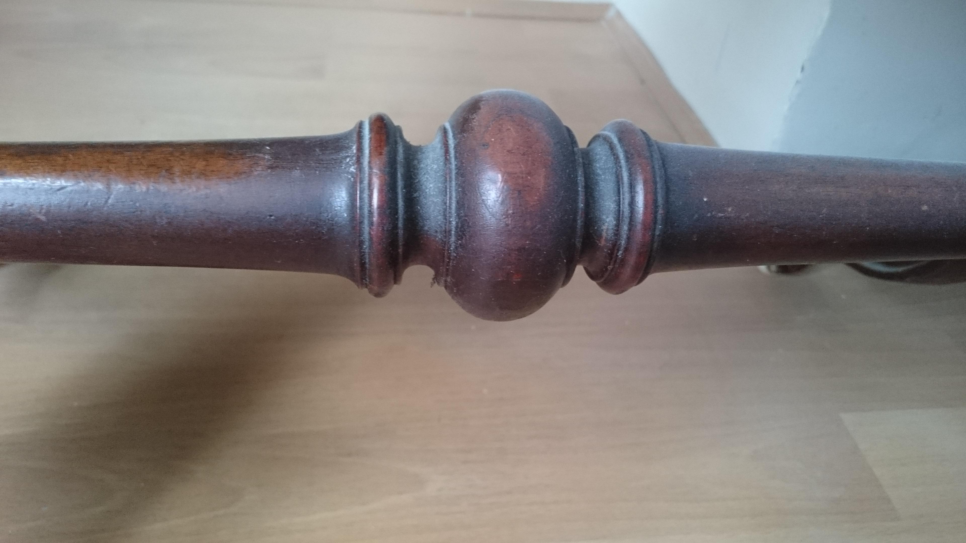 My dad thinks it's made from Walnut, but we aren't sure. In pretty good condition, but has been used, so there are scratches, marks and a tear in the green cloth.