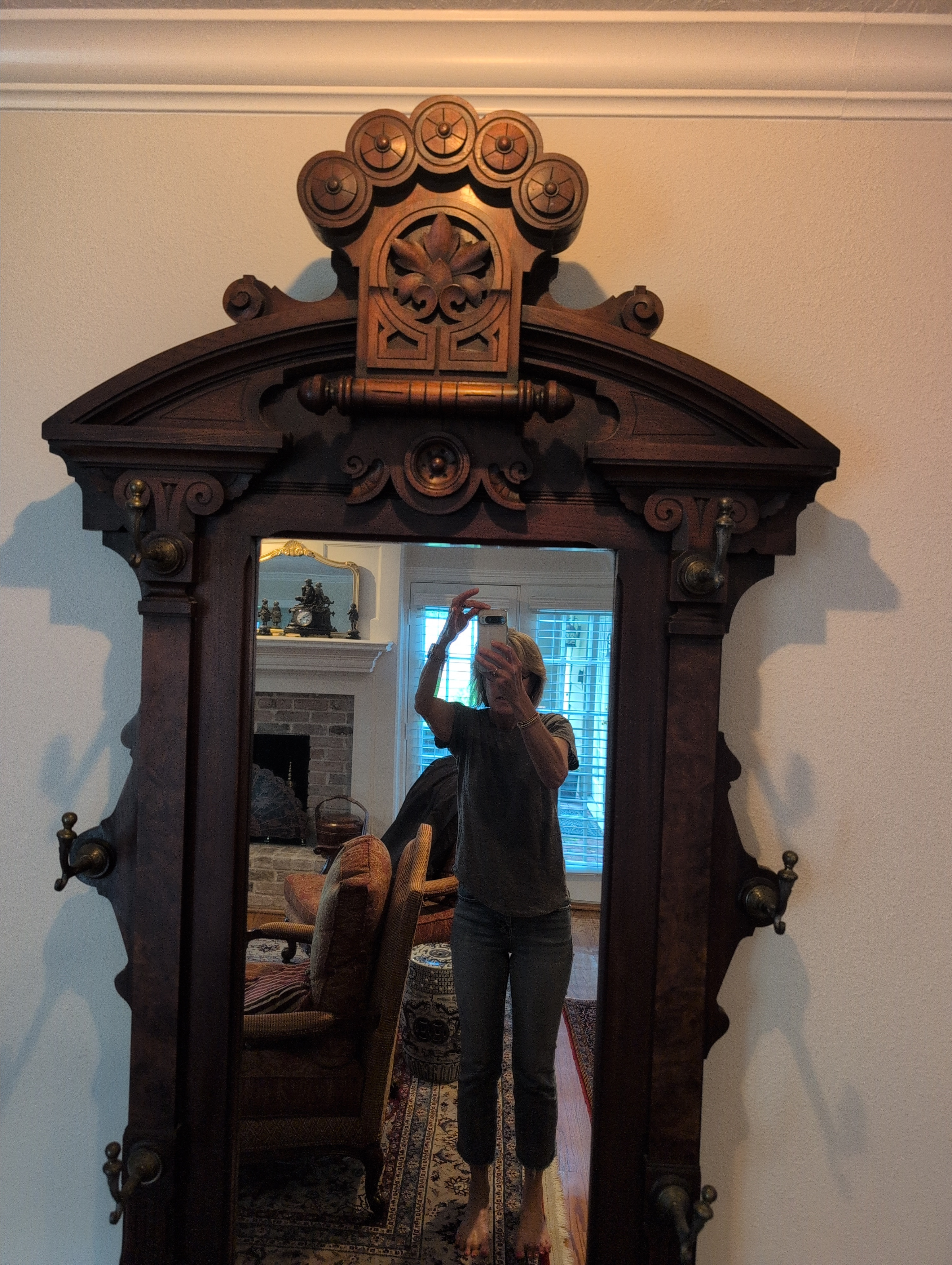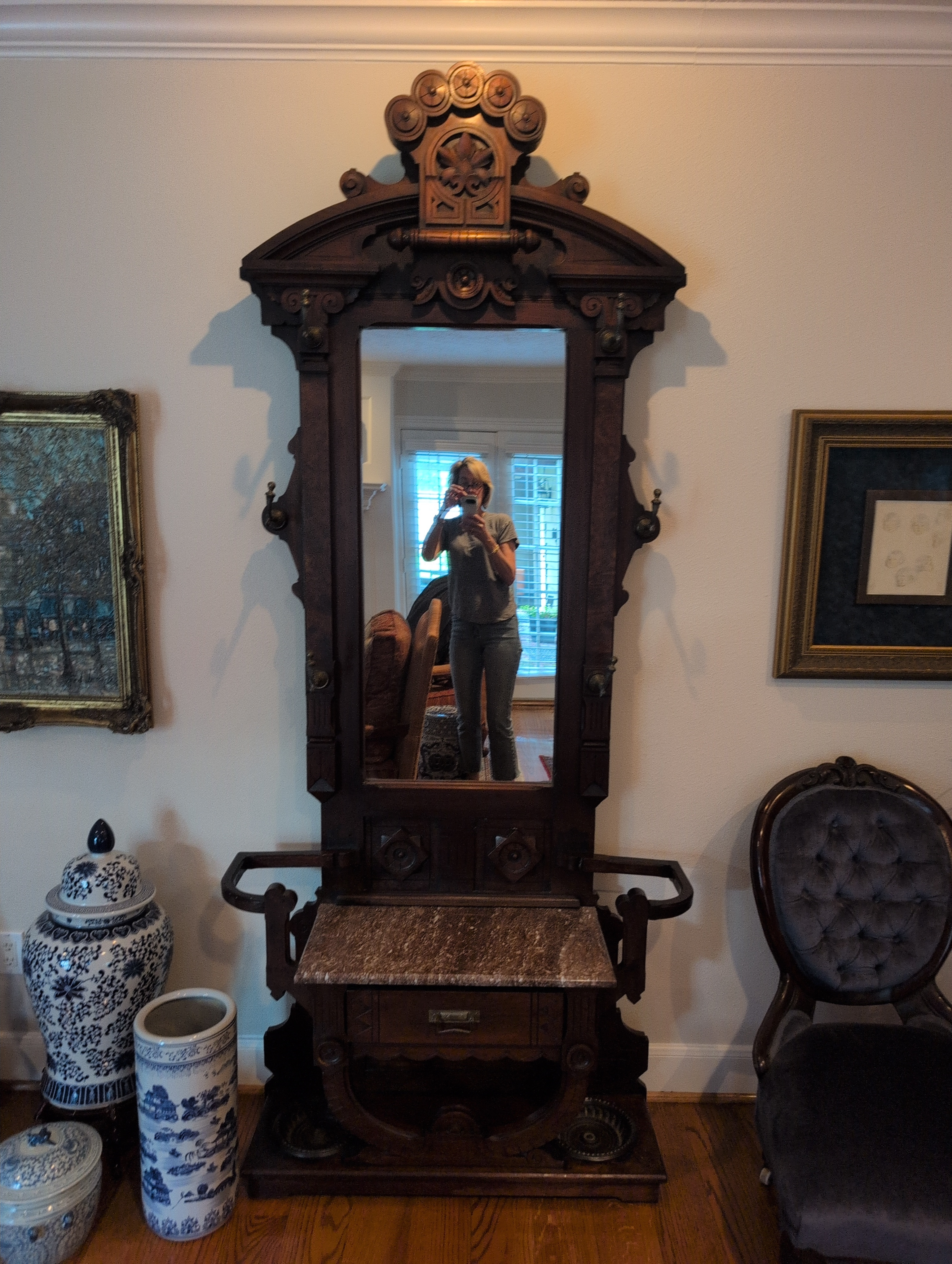Victorian Hall Tree with Mirror. Dating to c. 1850-1900. Materials: Wood, Mirror. Estimated value: $250 – $450. Condition: Very Good. The market for Victorian furniture is currently stable, with moderate demand. Prices for well-preserved pieces have shown a slight increase in recent years.