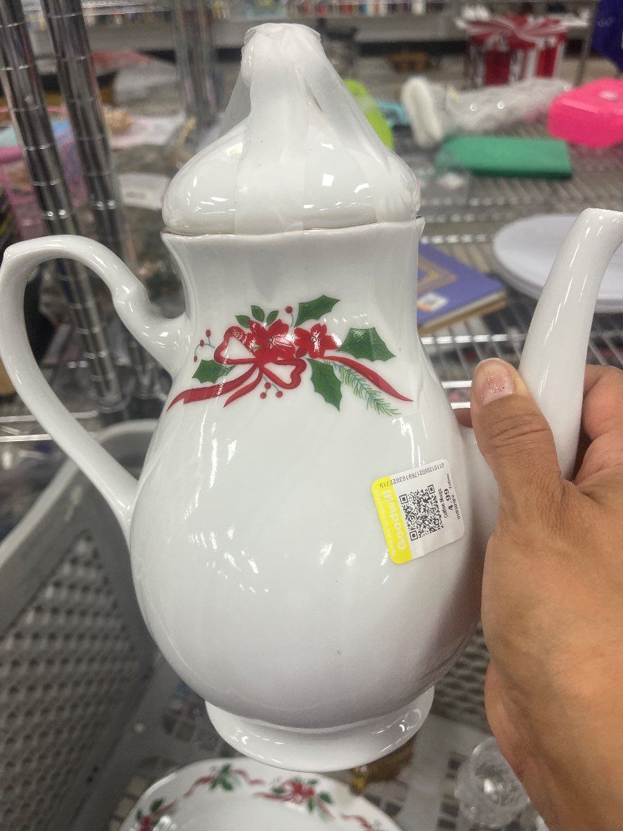 Physical Description: This coffee pot is made of fine porcelain, featuring a glossy white finish with hand-painted decorations of red bows and green holly leaves. The pot has a classic shape with a tall, slender body, a curved spout, and a decorative lid. The dimensions are approximately 10 inches in height and 6 inches in width at the widest point. The piece weighs around 1.5 pounds.