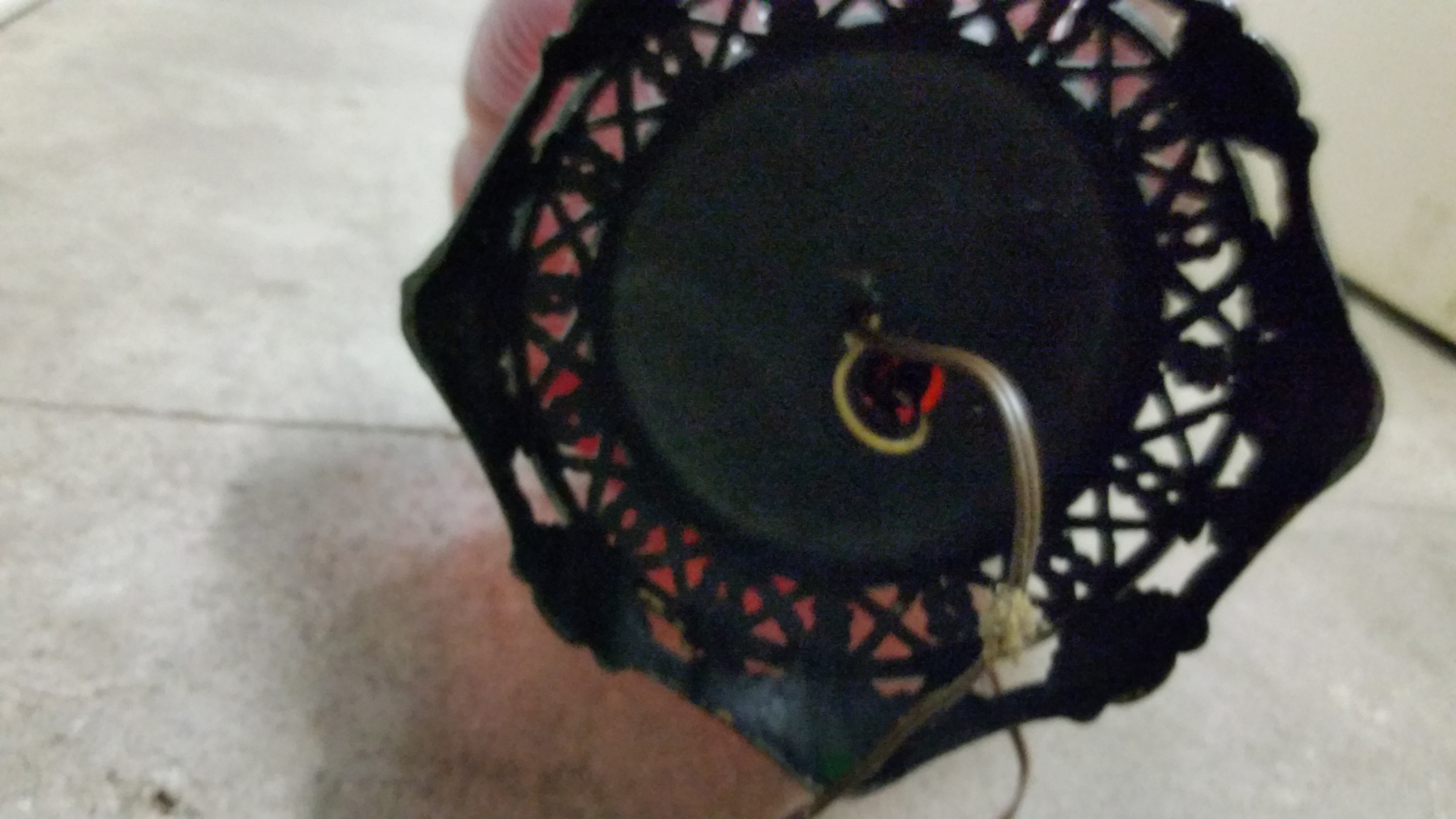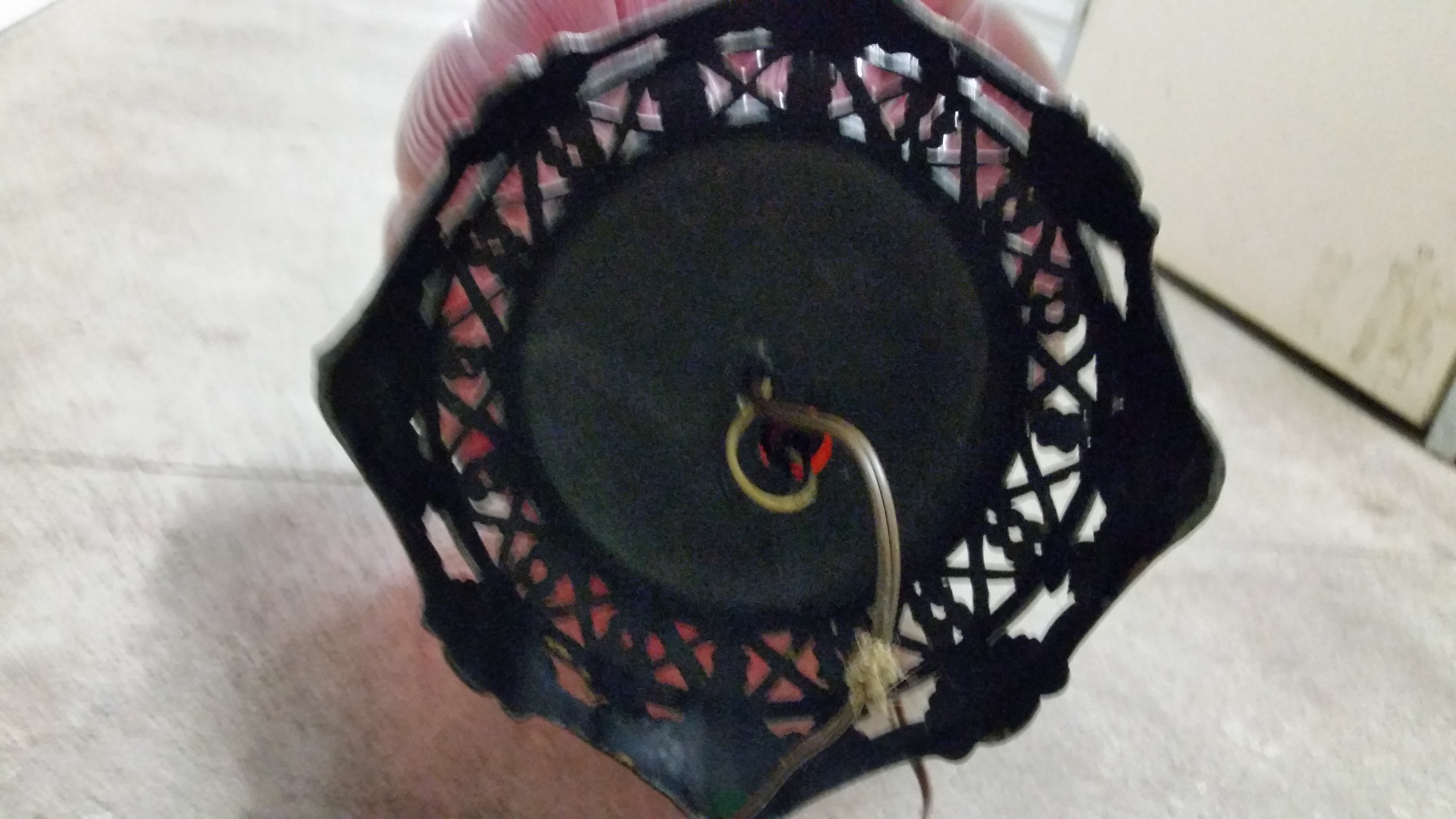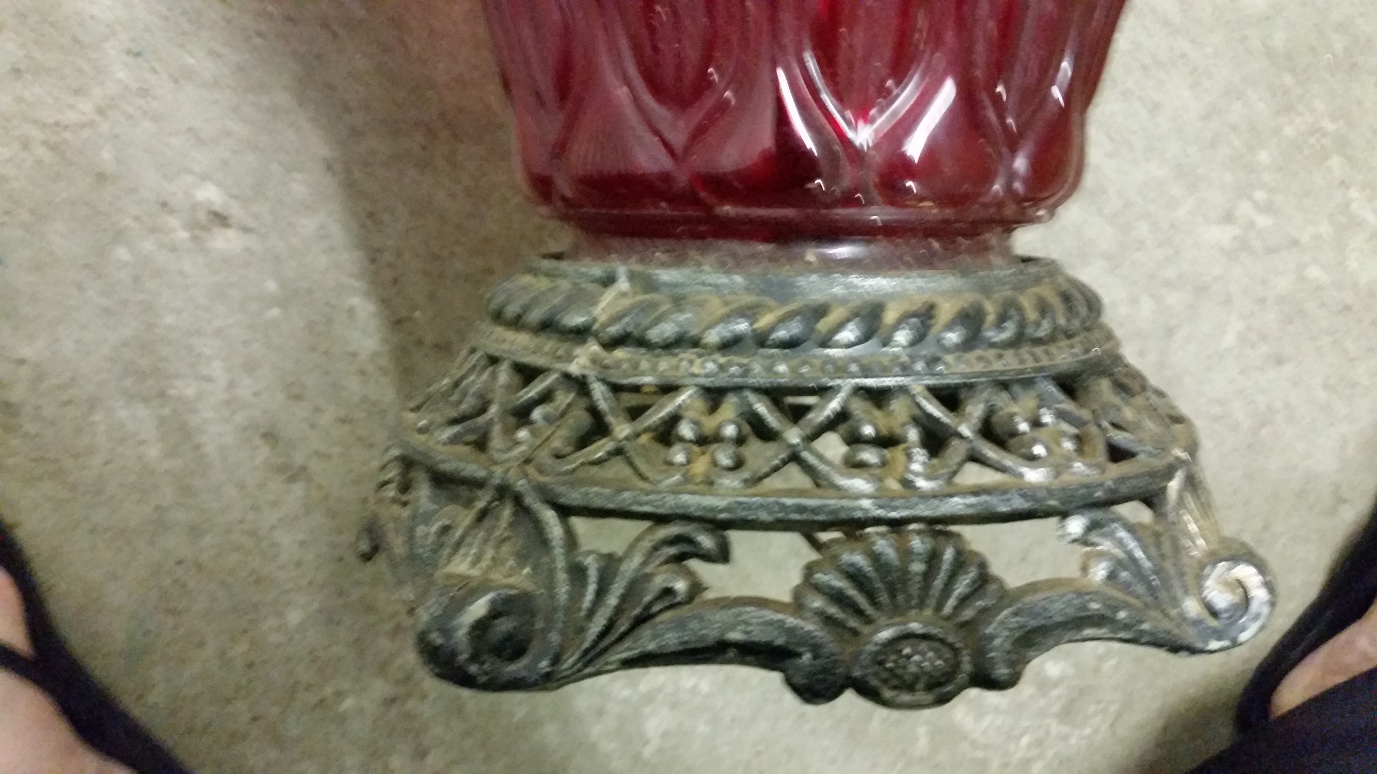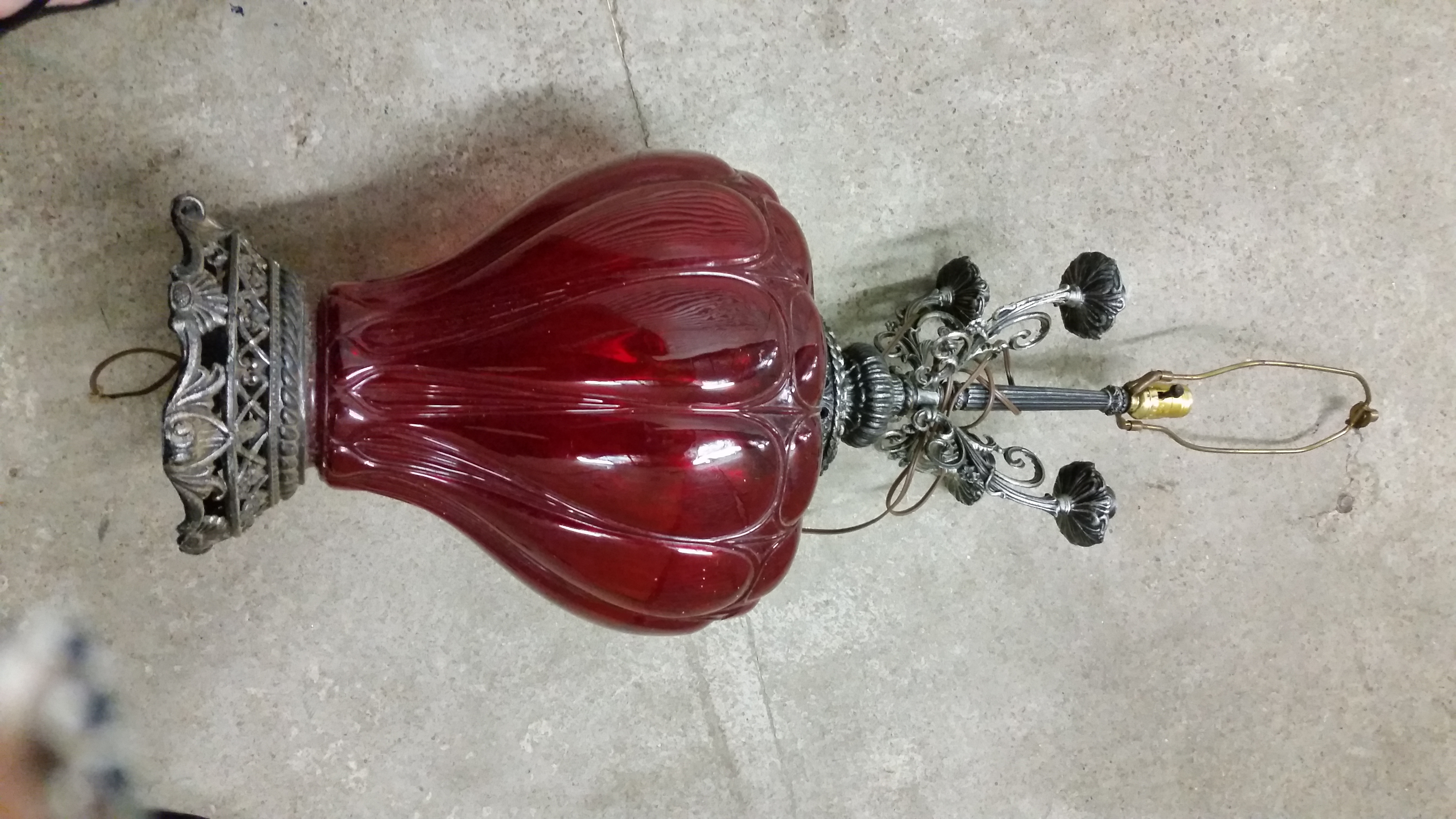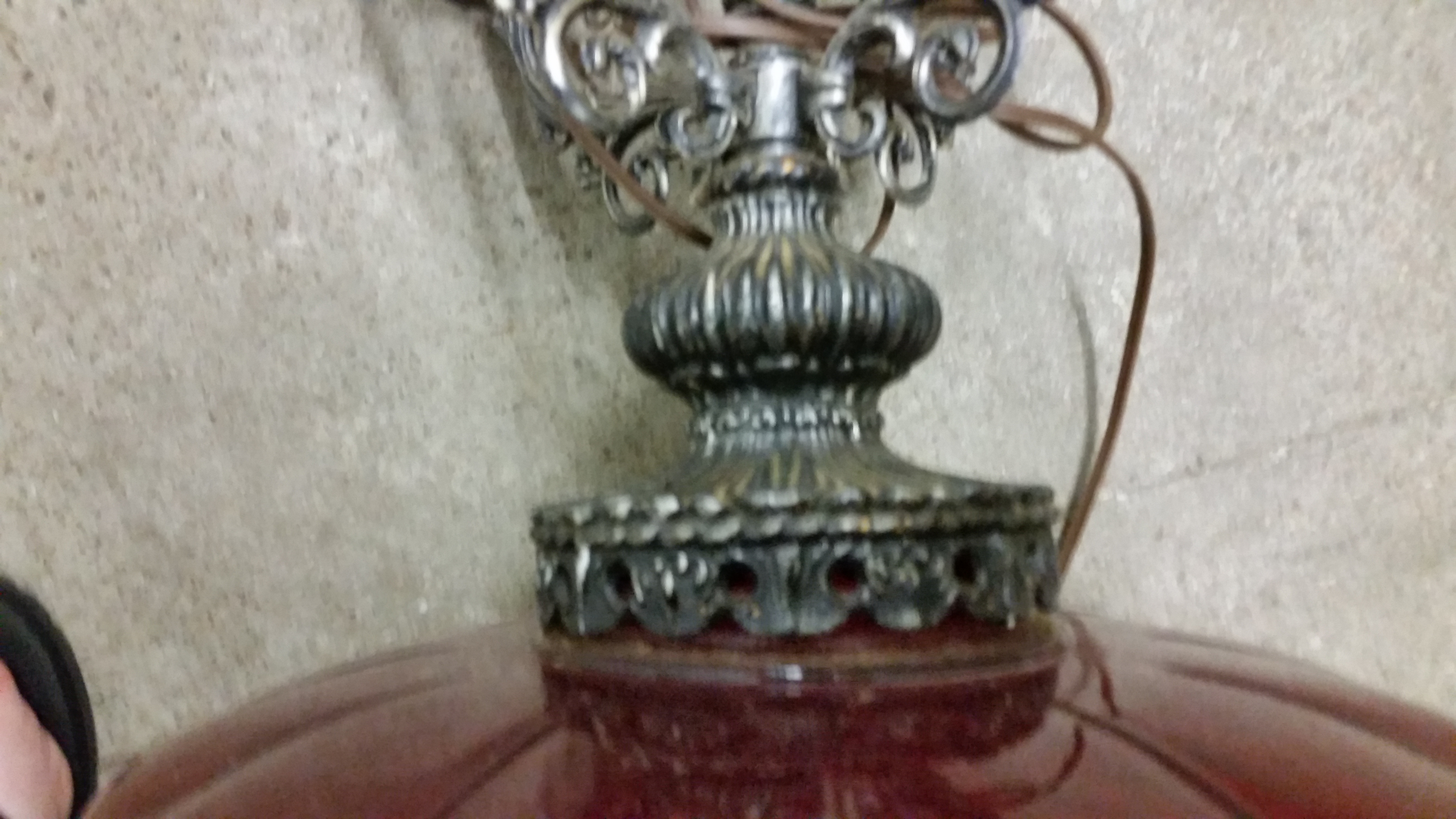 There are two lamps, I could not find any markings to the manufacturer. the shades are unavailable. This holds candlesticks and has a place for a light bulb, there is also a small light bulb in the bottom of the red lamp bulb.