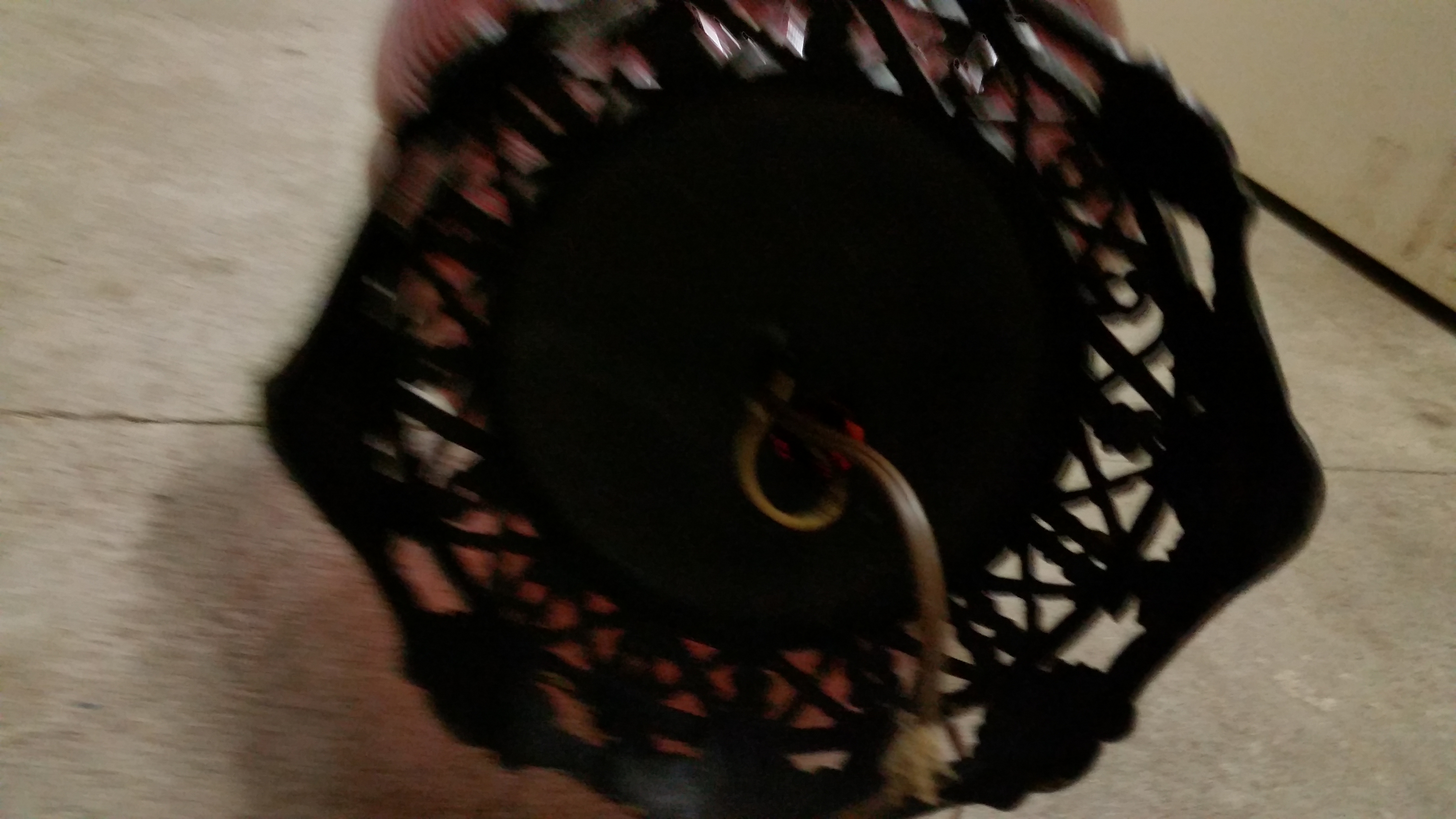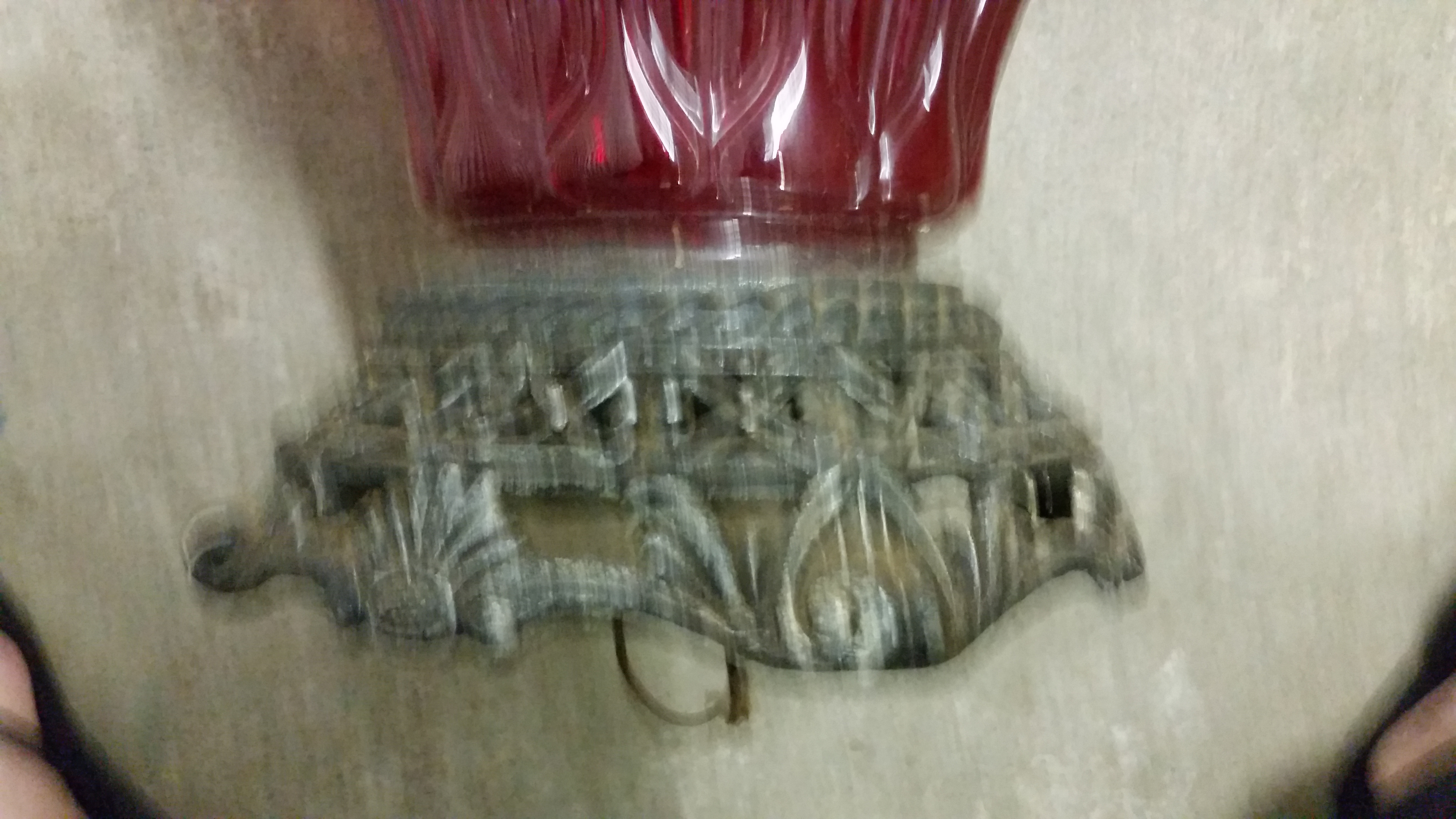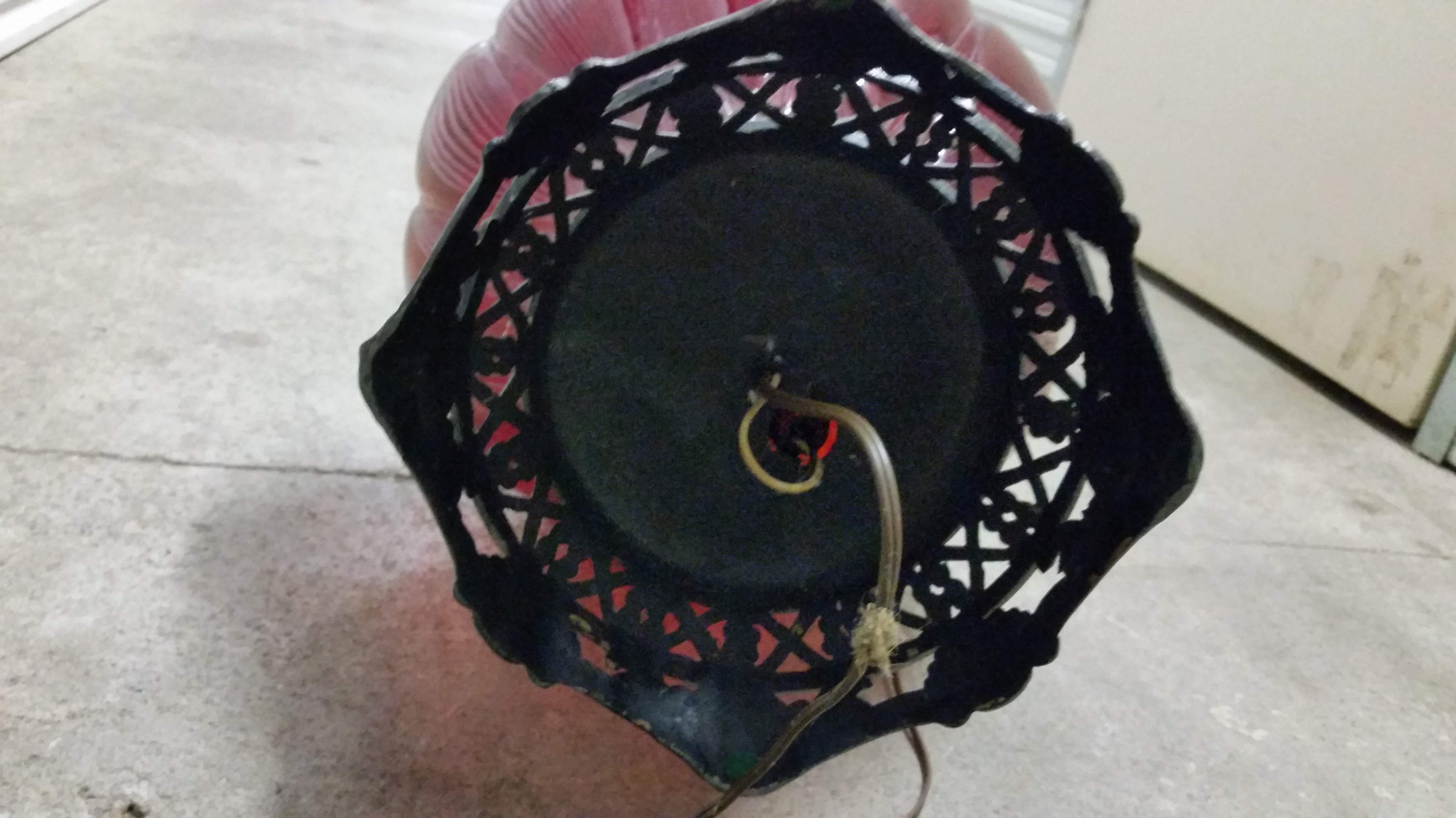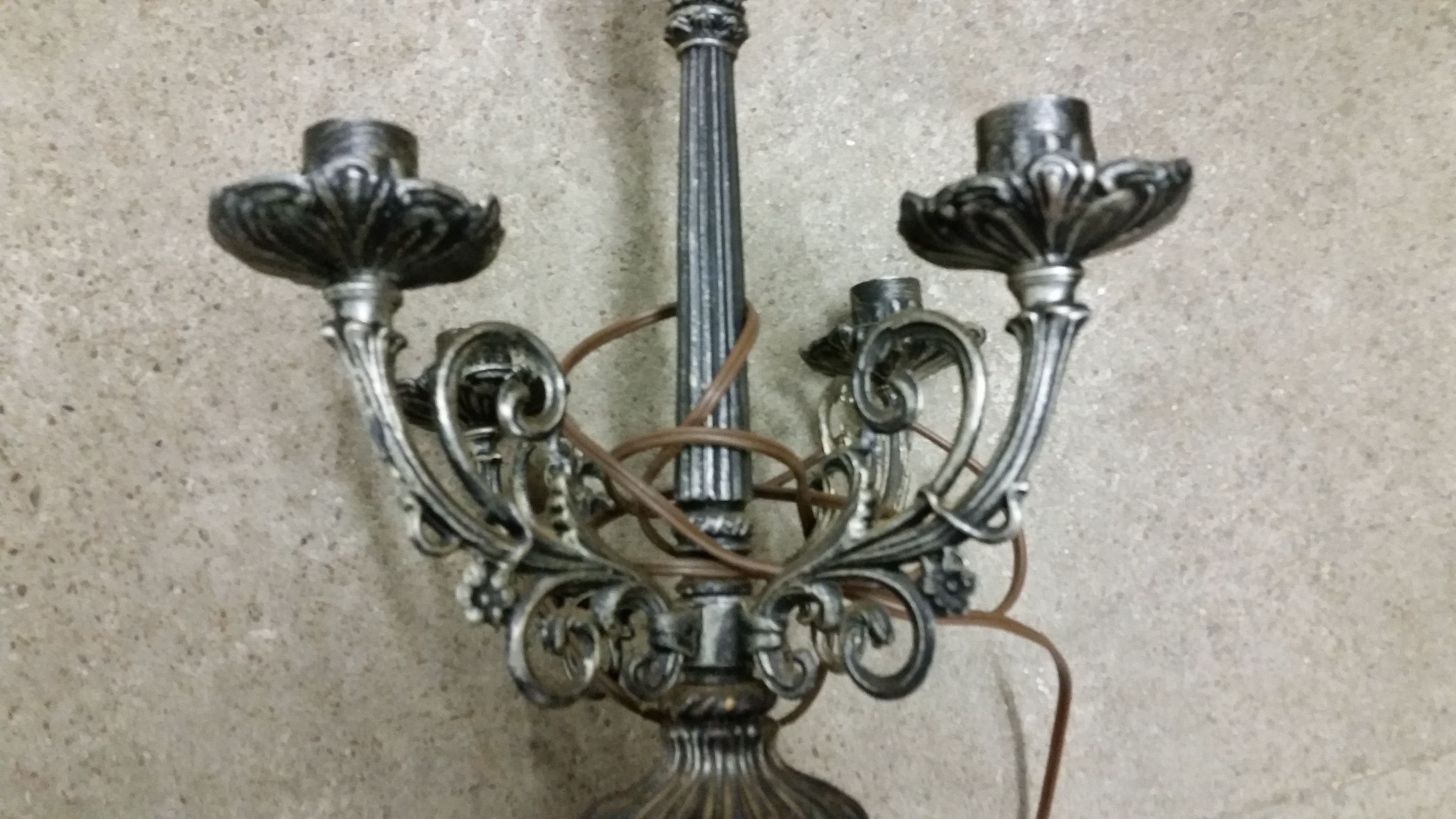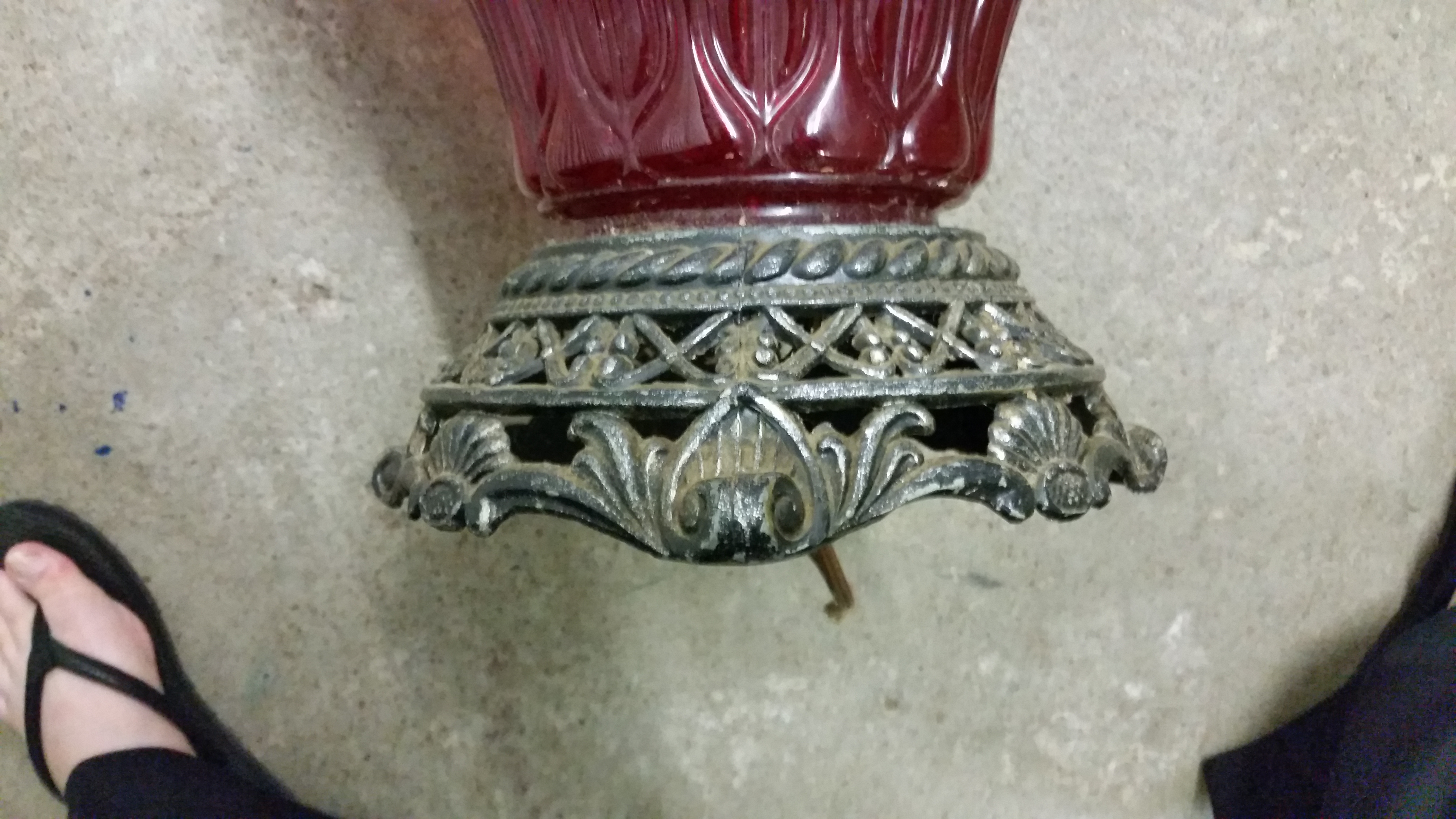 There are two lamps, I could not find any markings to the manufacturer. the shades are unavailable. This holds candlesticks and has a place for a light bulb, there is also a small light bulb in the bottom of the red lamp bulb.