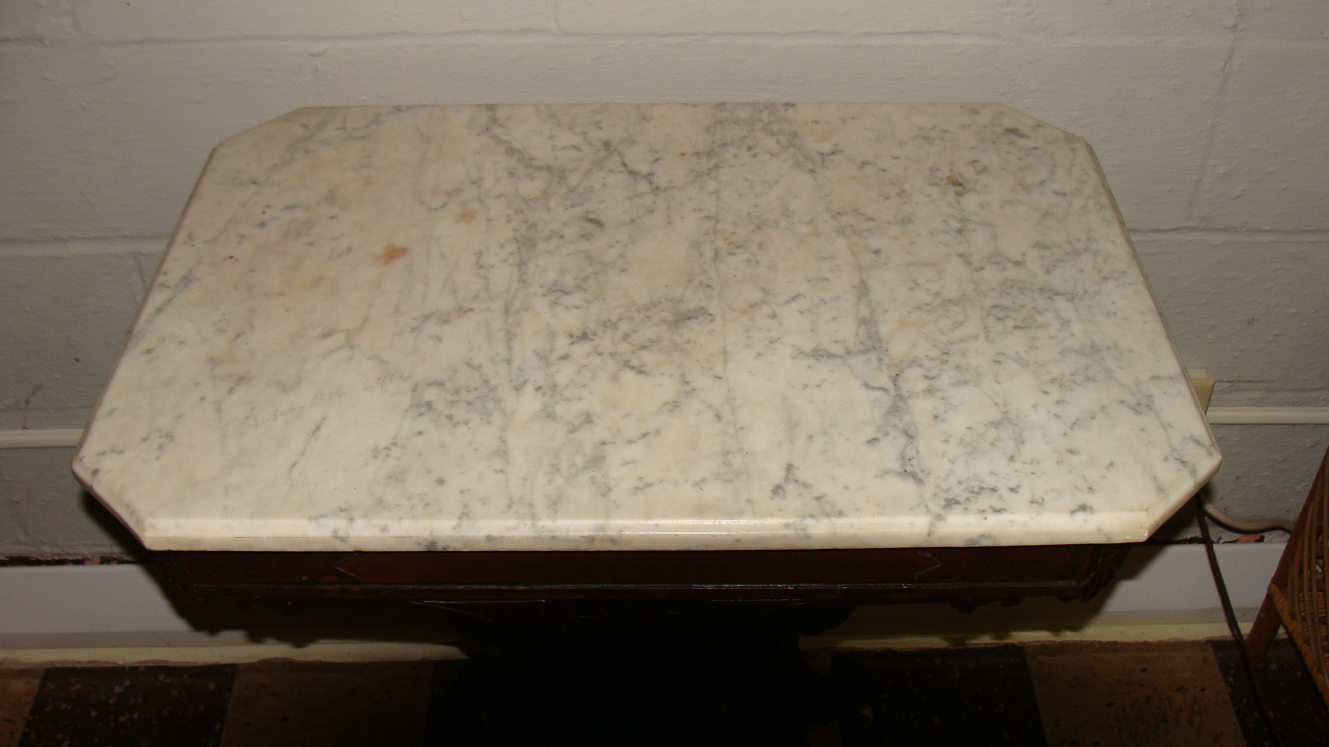 Table top is28"long x20"wide x28.5" height. Has aDark wood finish bottom with 4 small casters.The top piece isa white marble with dark to light gray streaks through out it.This piece belonged to my Grandmother and is in excellent to perfect shape.