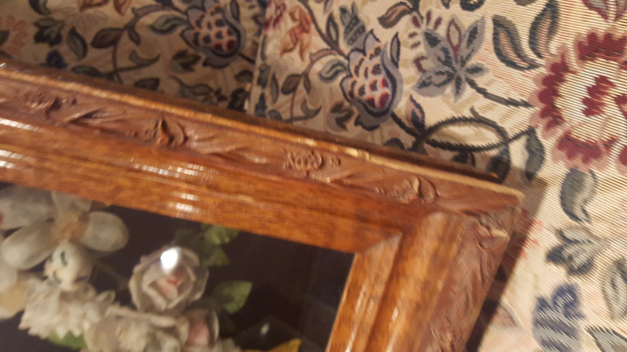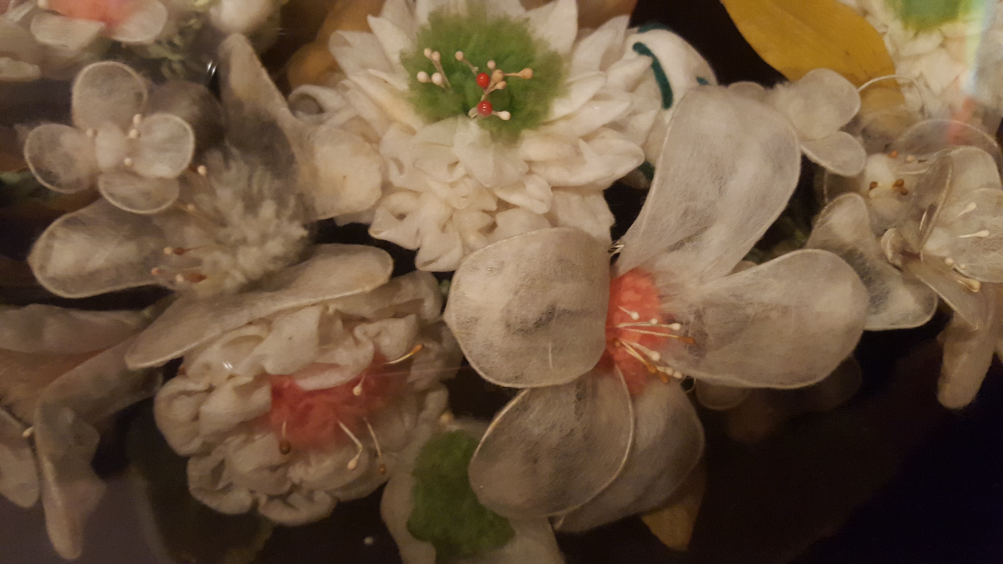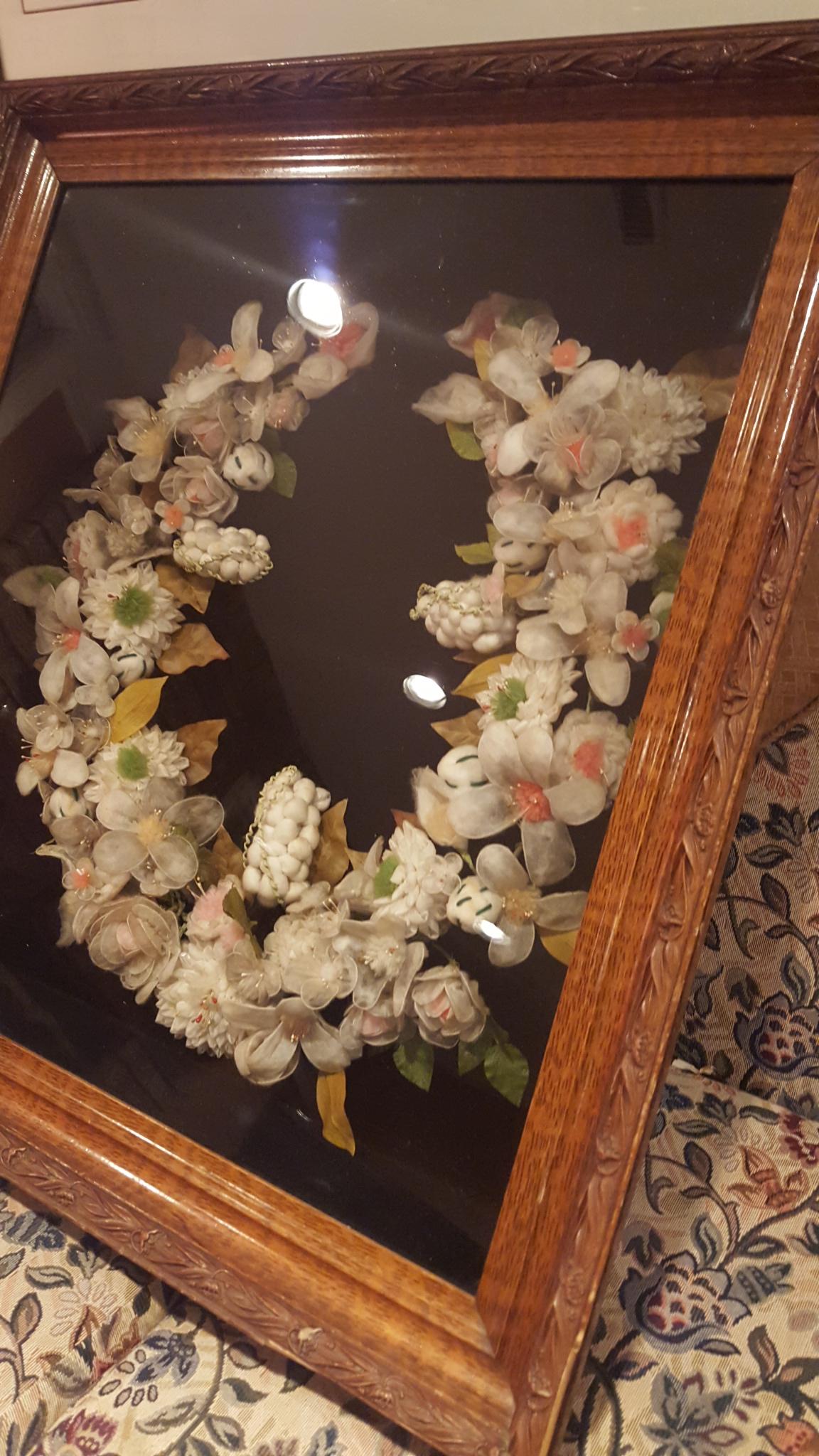 I recently acquired this wreath. It is rather large more than 24 inches wide and tall. The flowers seem to be made of tissue or cotton and yarn, mostly. The band kground looks pretty be covered in black velvet. There is some damage to the frame as pictured. I would like to know value and anything else you can share.