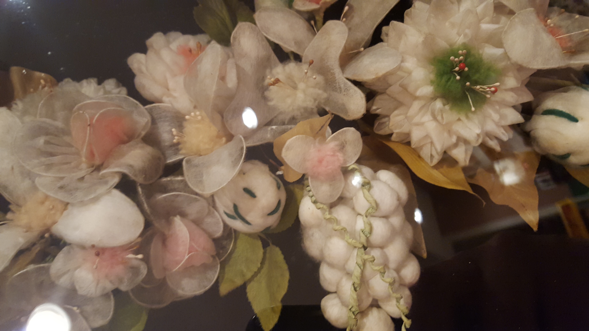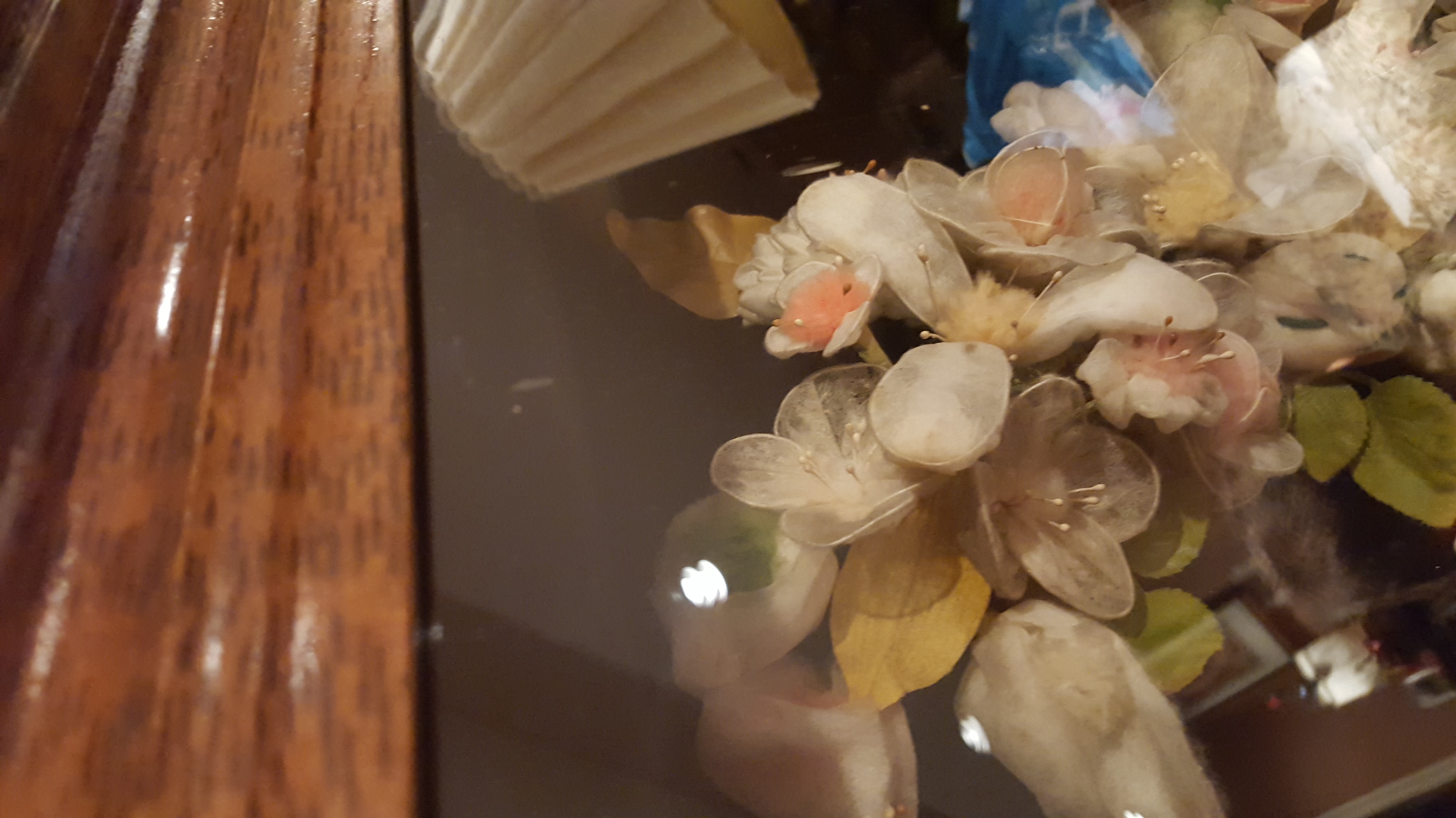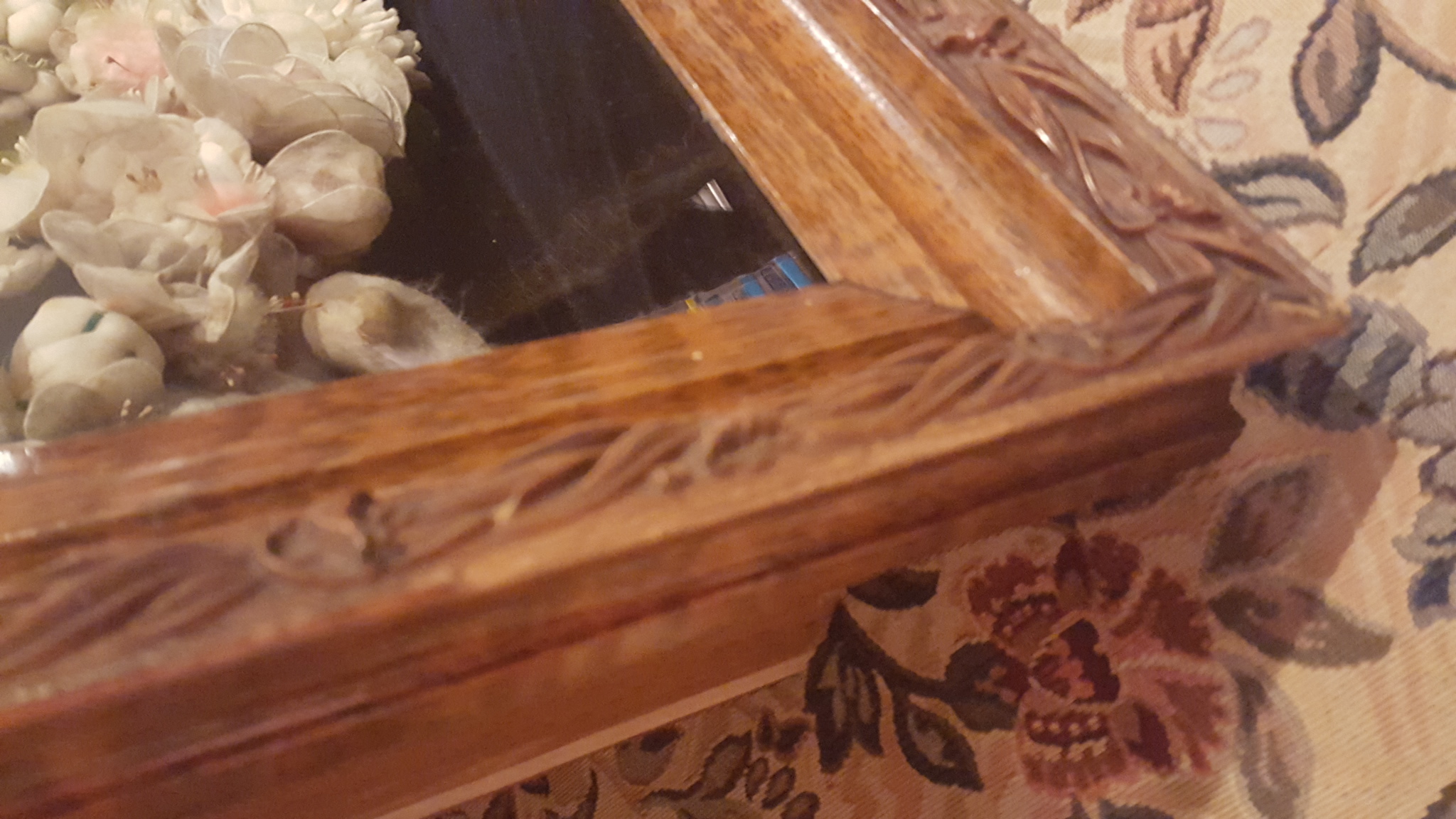 I recently acquired this wreath. It is rather large more than 24 inches wide and tall. The flowers seem to be made of tissue or cotton and yarn, mostly. The band kground looks pretty be covered in black velvet. There is some damage to the frame as pictured. I would like to know value and anything else you can share.