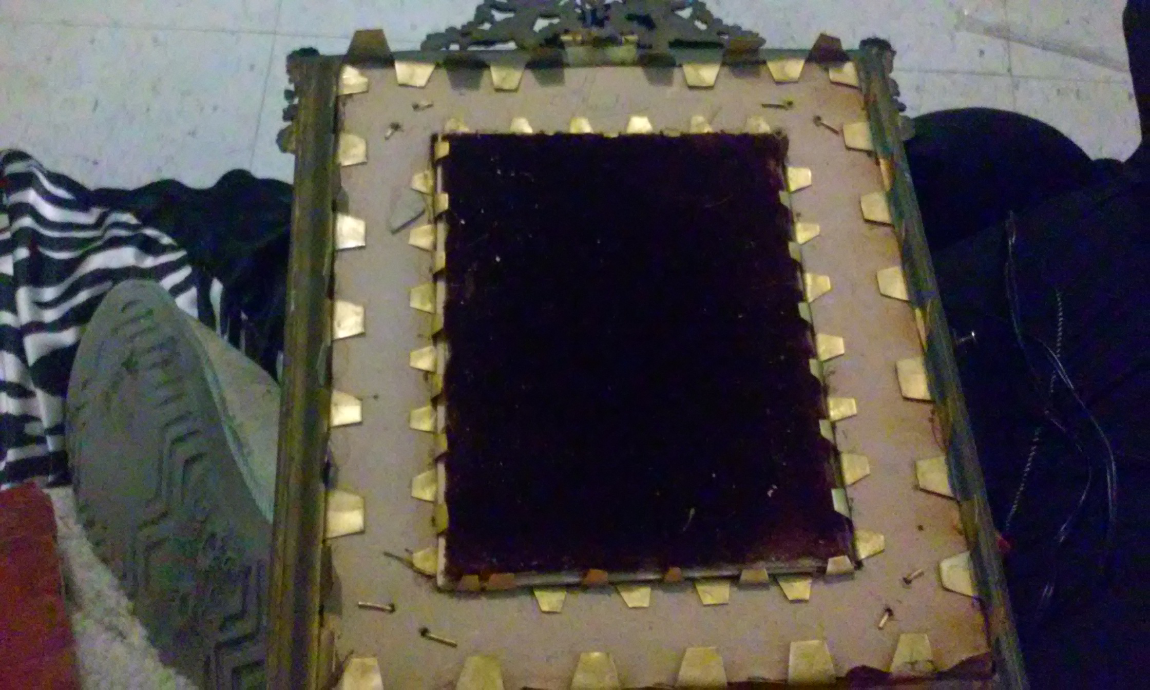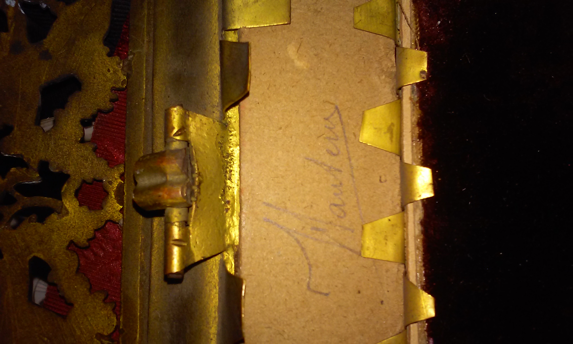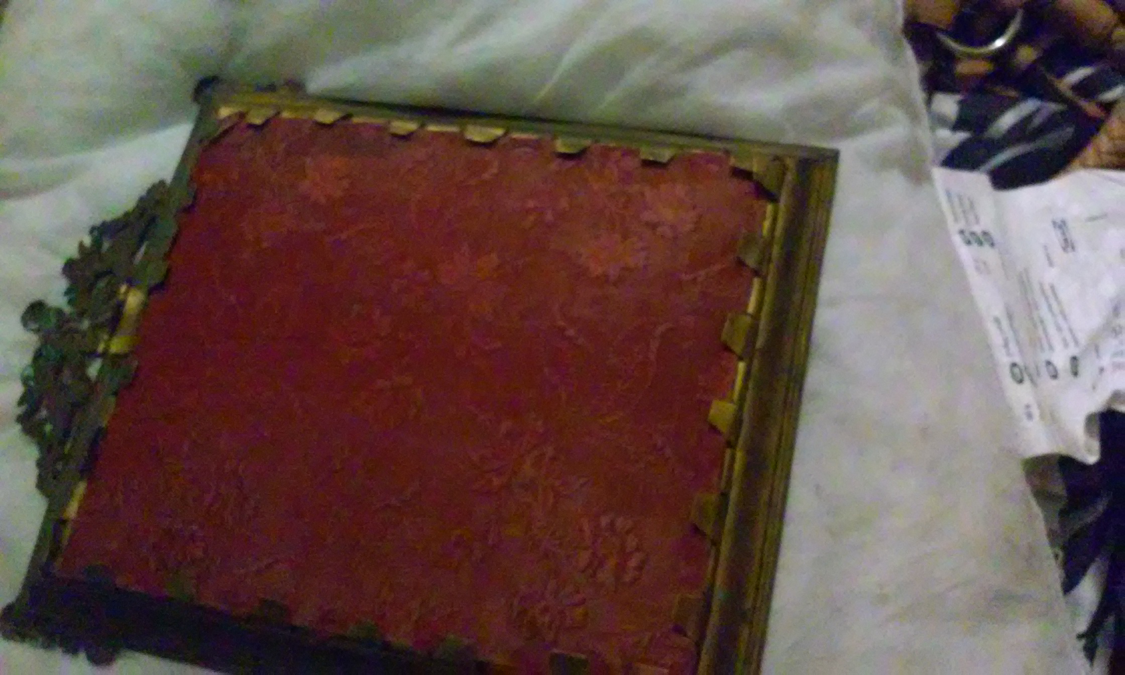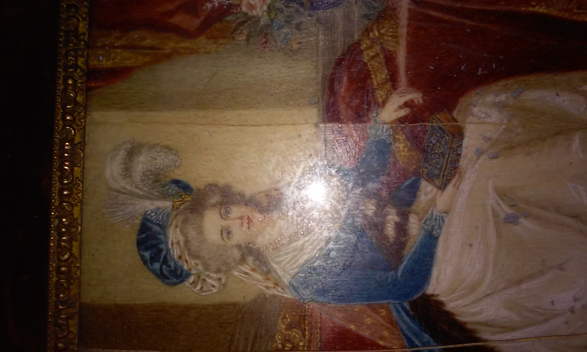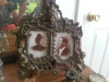 The frame is brass metal and has tabs on back to hold the backing together. Very fine decorative details. The painting in the center is oil, and appears to be from the Victorian Era. On the inside there is a signature, "Wantery".