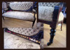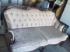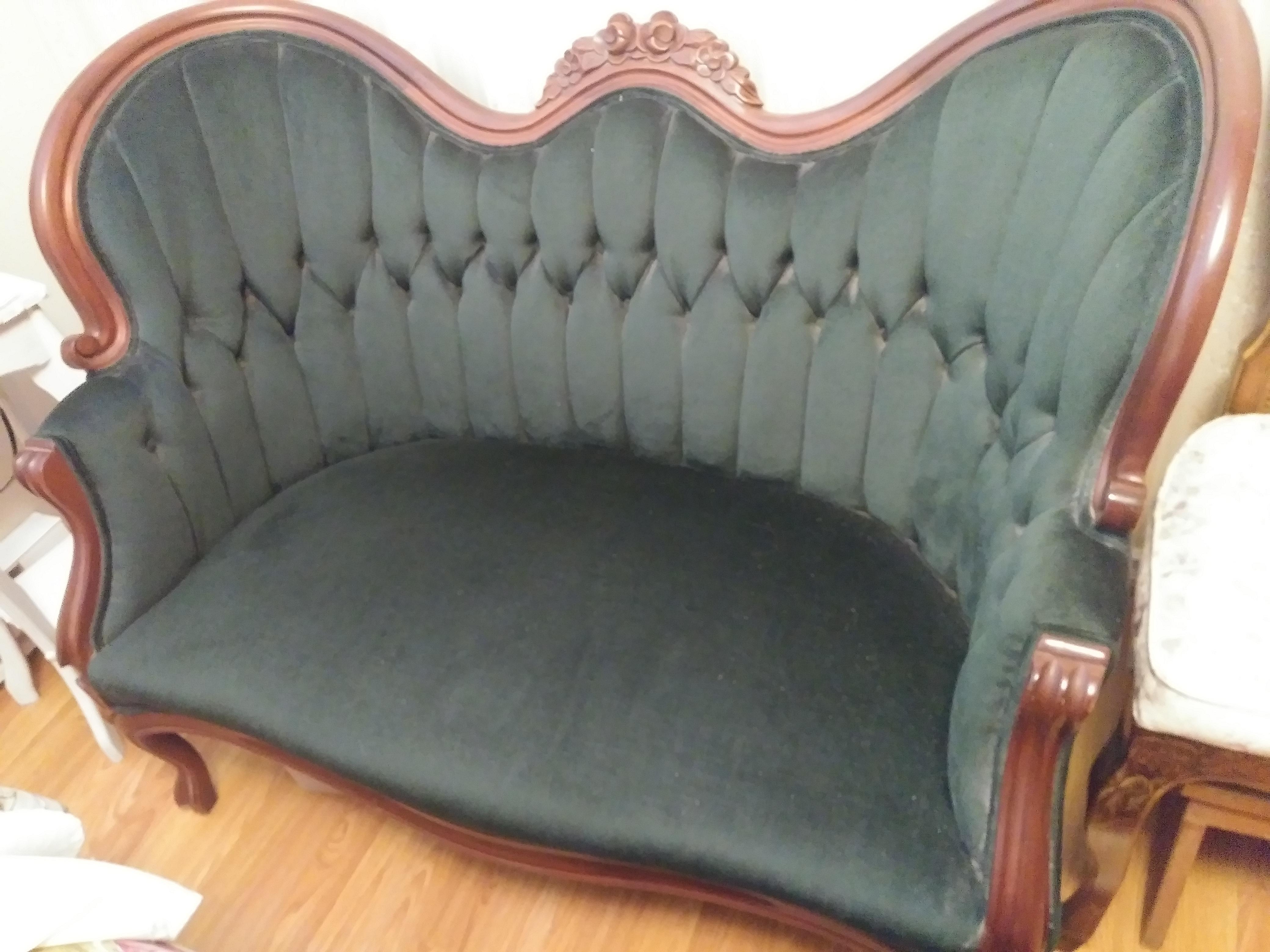 Green velvet and mahogany wood Queen ann loveseat. Ive had it for 35yrs. Bought it in an antique shop and had it reapolstered.