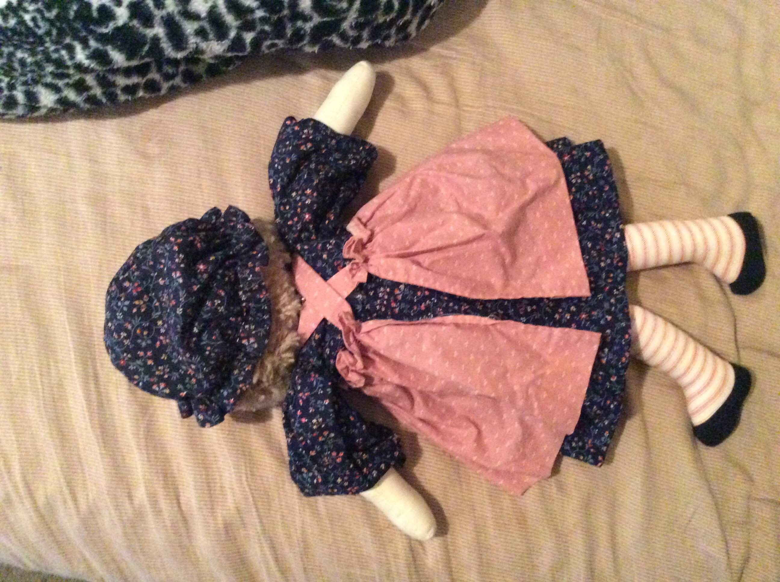 She has sandy blonde hair with a light pink triangle nose and light pink mouth. The hat or bonnet is navy blue with little colorful flowers all over it and has a off pink apron over the dress with a small white pattern all over it. The doll has no stains and never played with. She is all cloth.