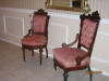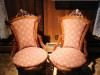 I researched the chair so my information may not be accurate. It is a four foot chair made from walnut wood and some type of shiny material. The chair is covered with a salmon pink floral pattern material. The chair is armless and has a cloud shaped back. The two front legs are different than the back ones. The top design is partially missing and there are two small holes at the top.
