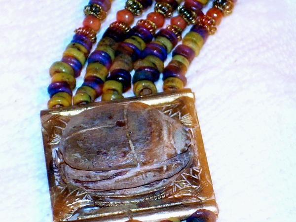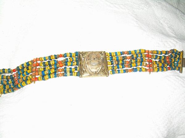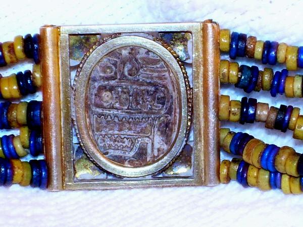 The bracelet is brightly colored with some minor signs of wear. I believe that the metal is brass I am more interested in the approx age of the scarab. The hieroglyphics on the back are well worn but the scarab itself is in very good condition. It has been carved from stone and is about 1/2 in length. I am not sure of the stone. Please see attached pictures. Thank you.