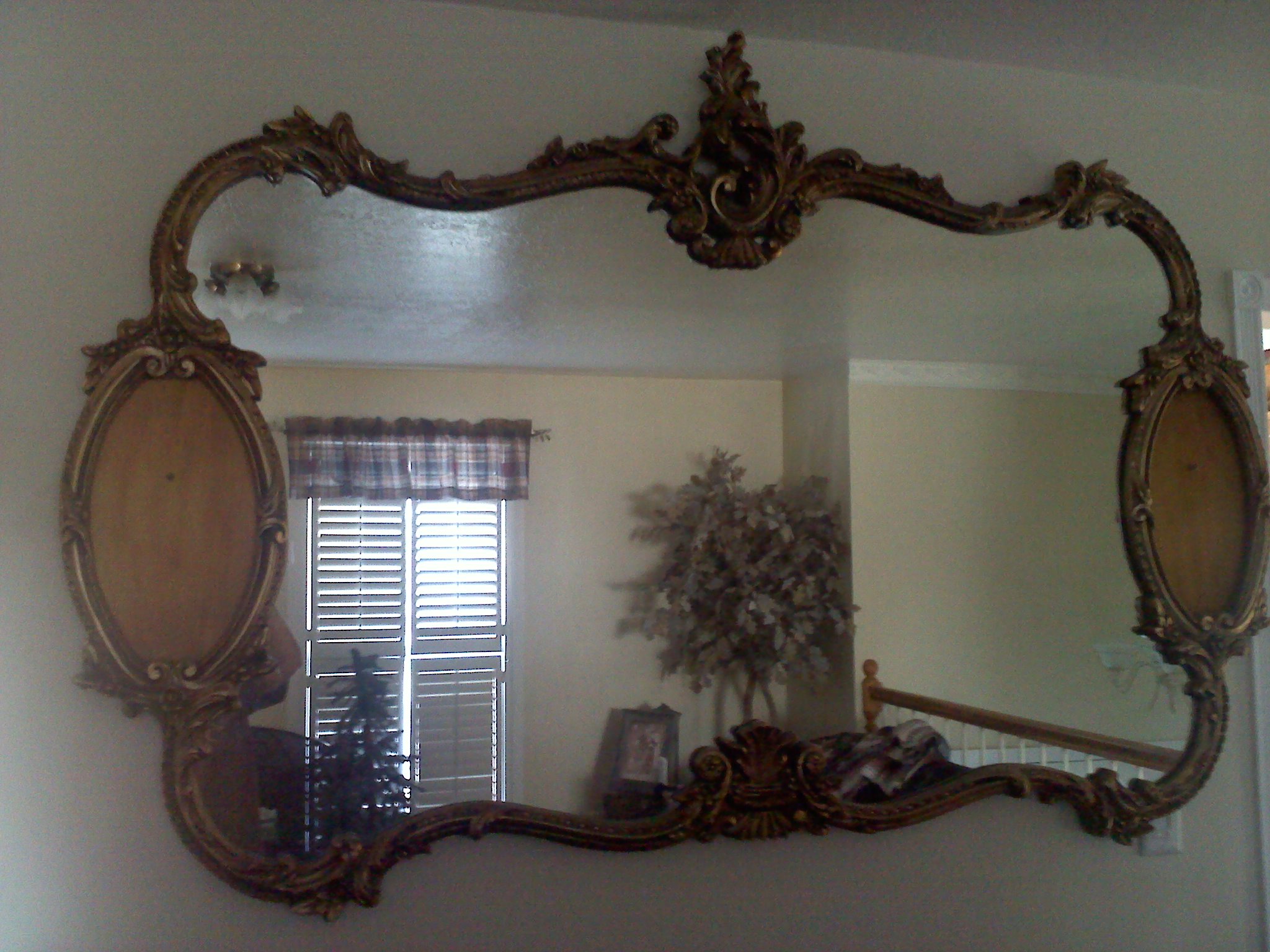 I was told this is called a wedding mirror. It is black and gold trim with scrolls all the way around the mirror. It has an opening on each end for pictures (I do not have the bubbles or glass that belongs in that area. The mirror measures 75 x 42.