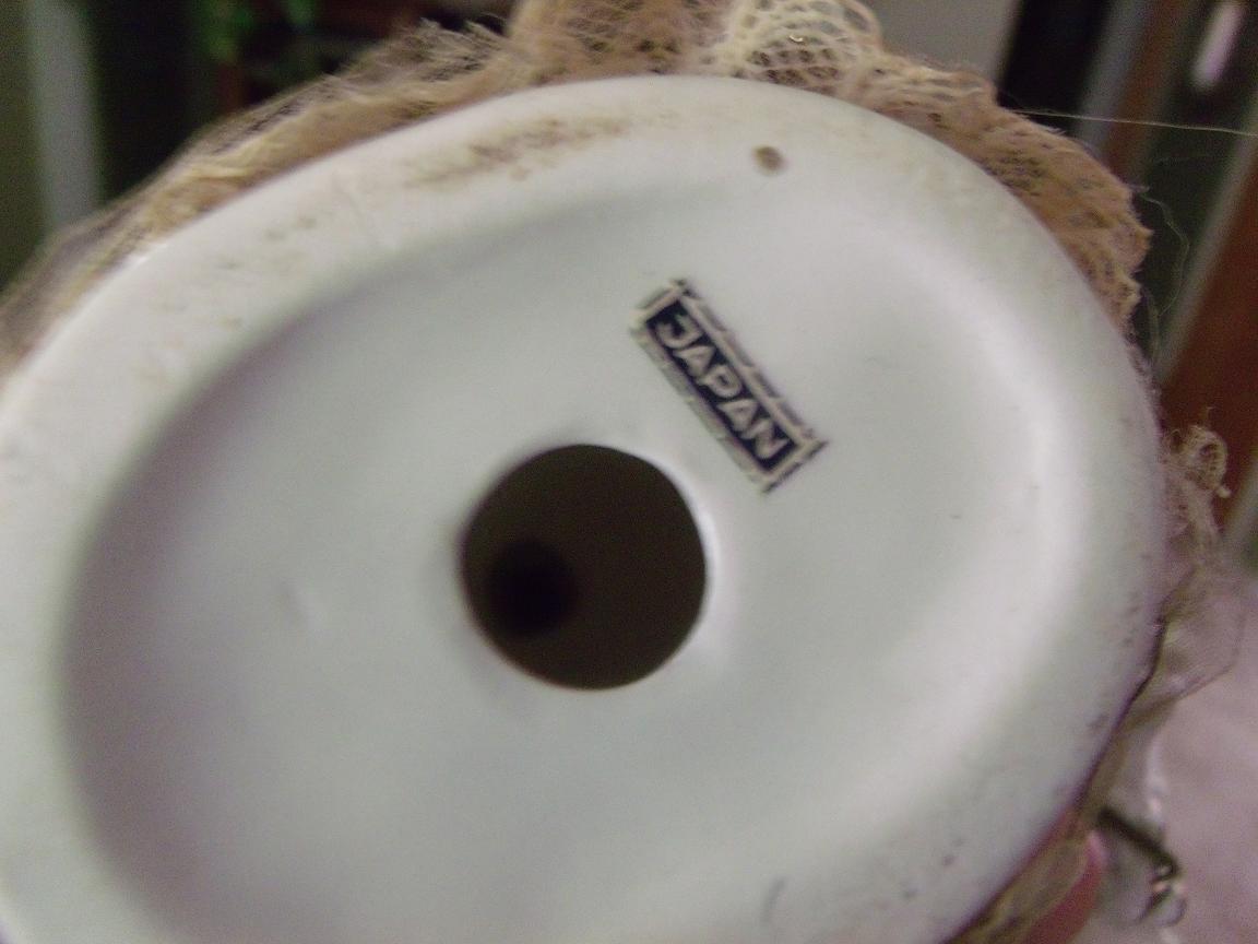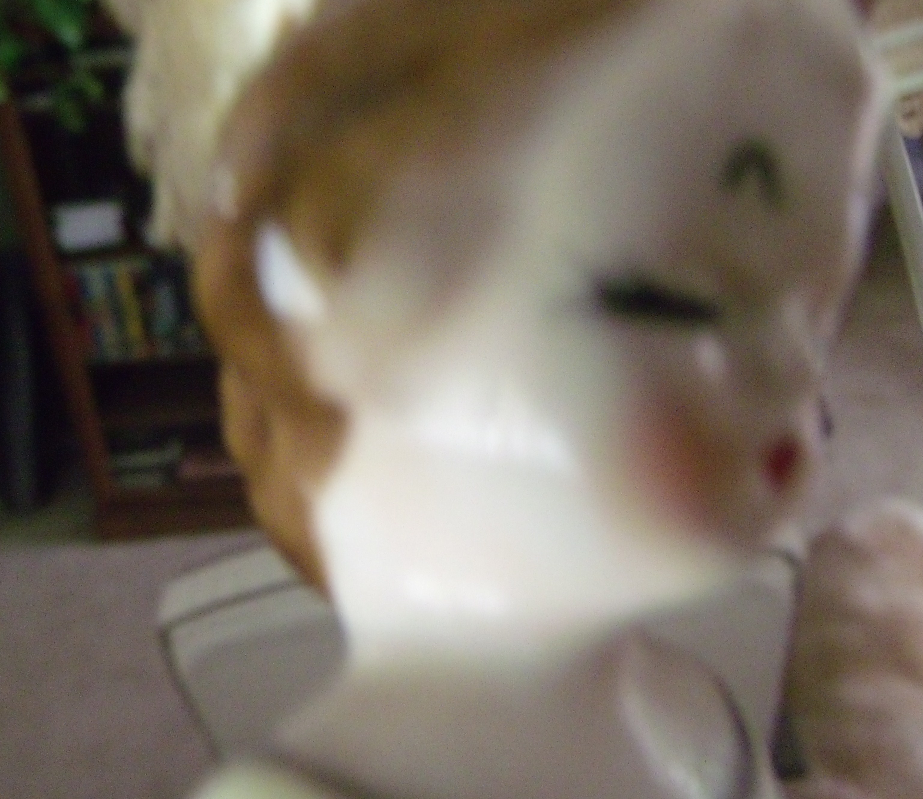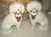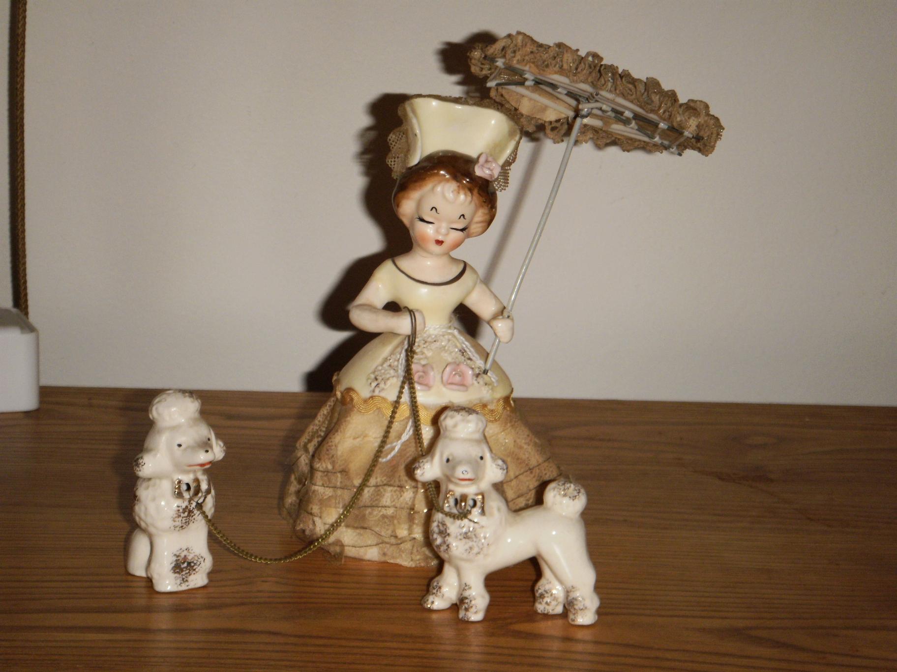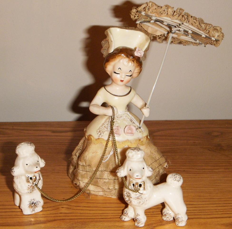 She looks to be a Victorian Age Woman holding an umbrella and walking two white poodles on leashes.