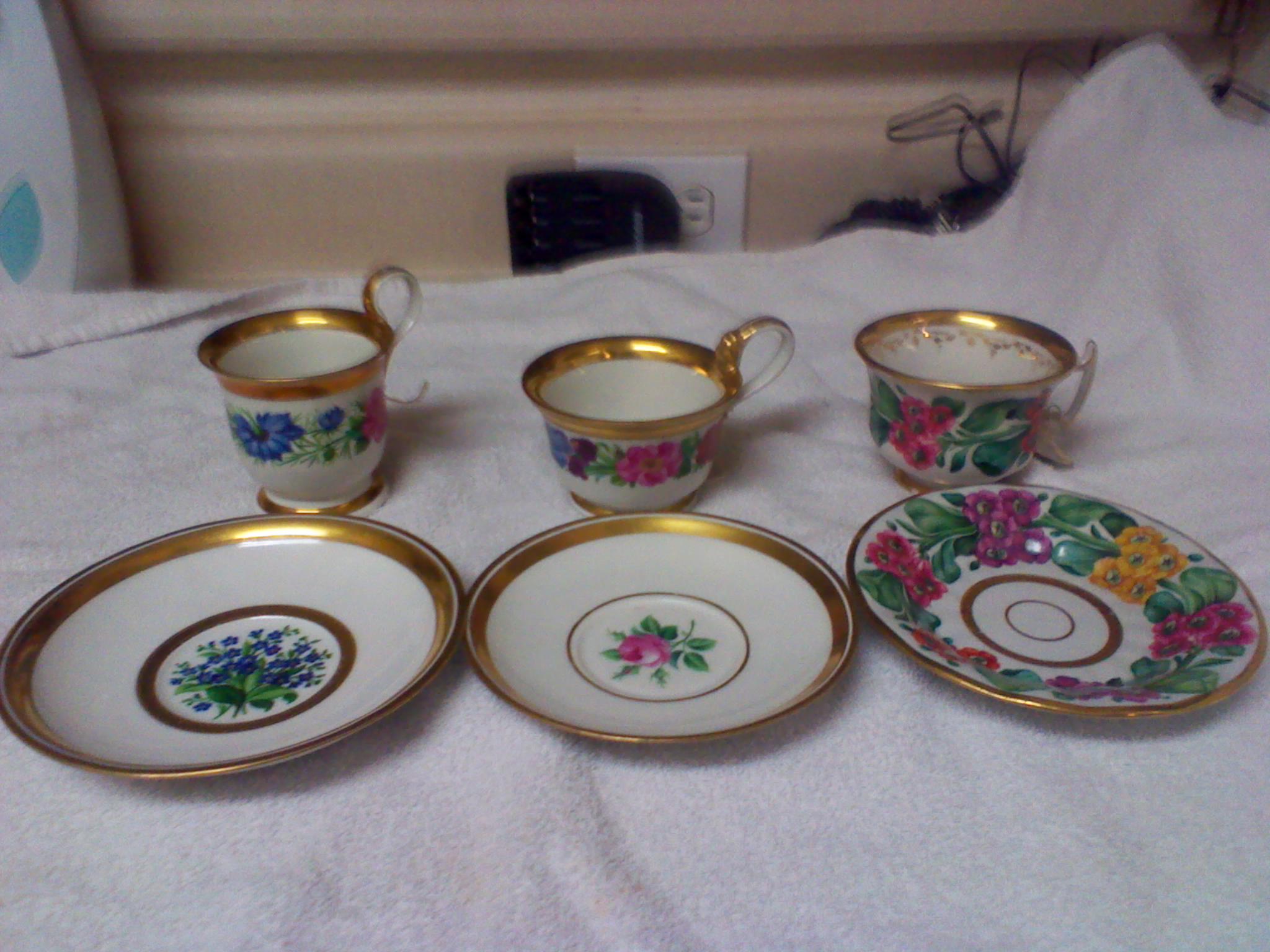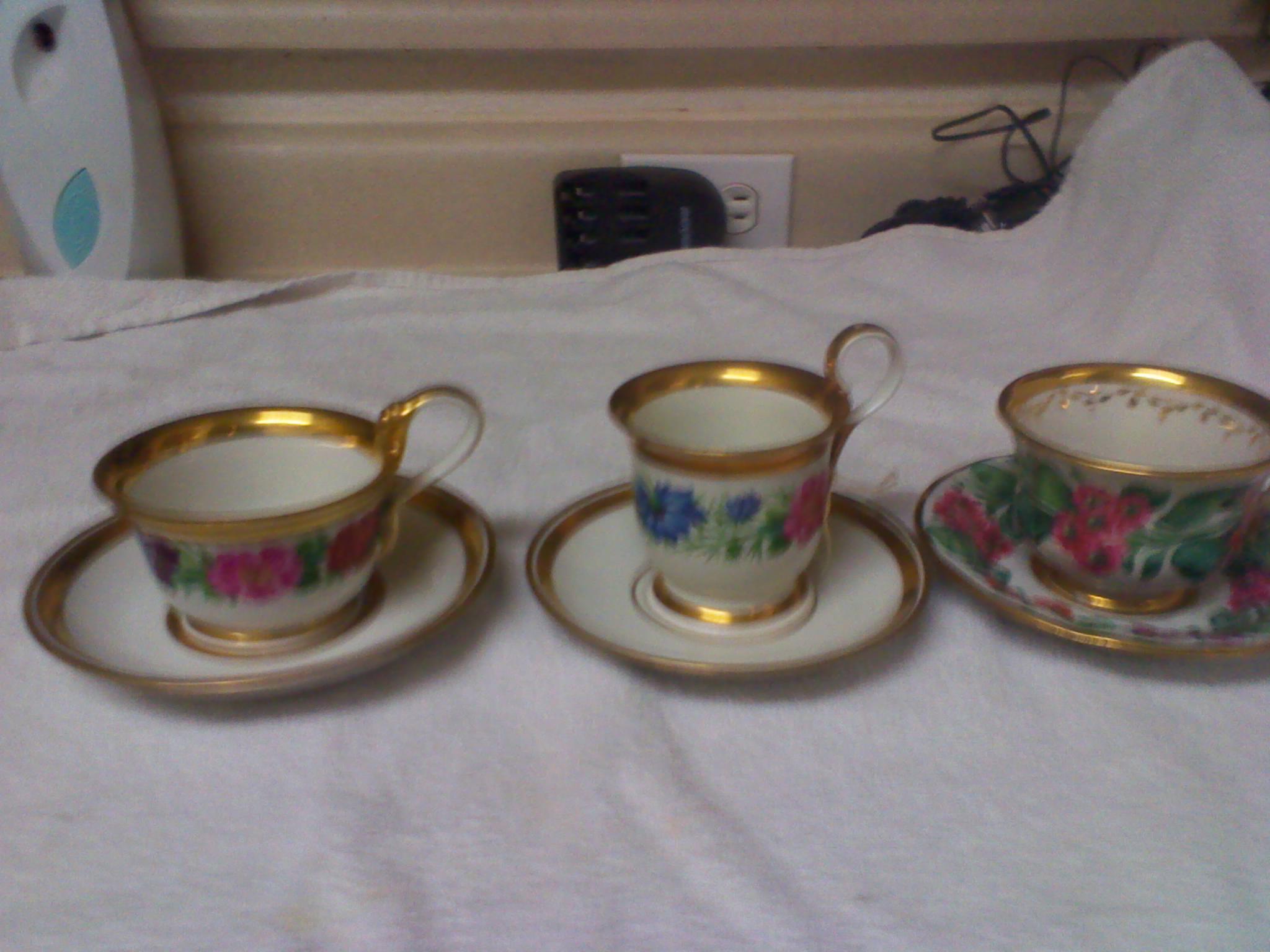 I have three different tea cups with matching saucers I would like to find out more information on these very beautiful Tea Cups the only information I have is what is on the bottom of the Cups and Saucers here is the information that I have on them the informantion is at the bottom on this. Can anyone please help me to get more information. All the cups and saucers are in very mint condition