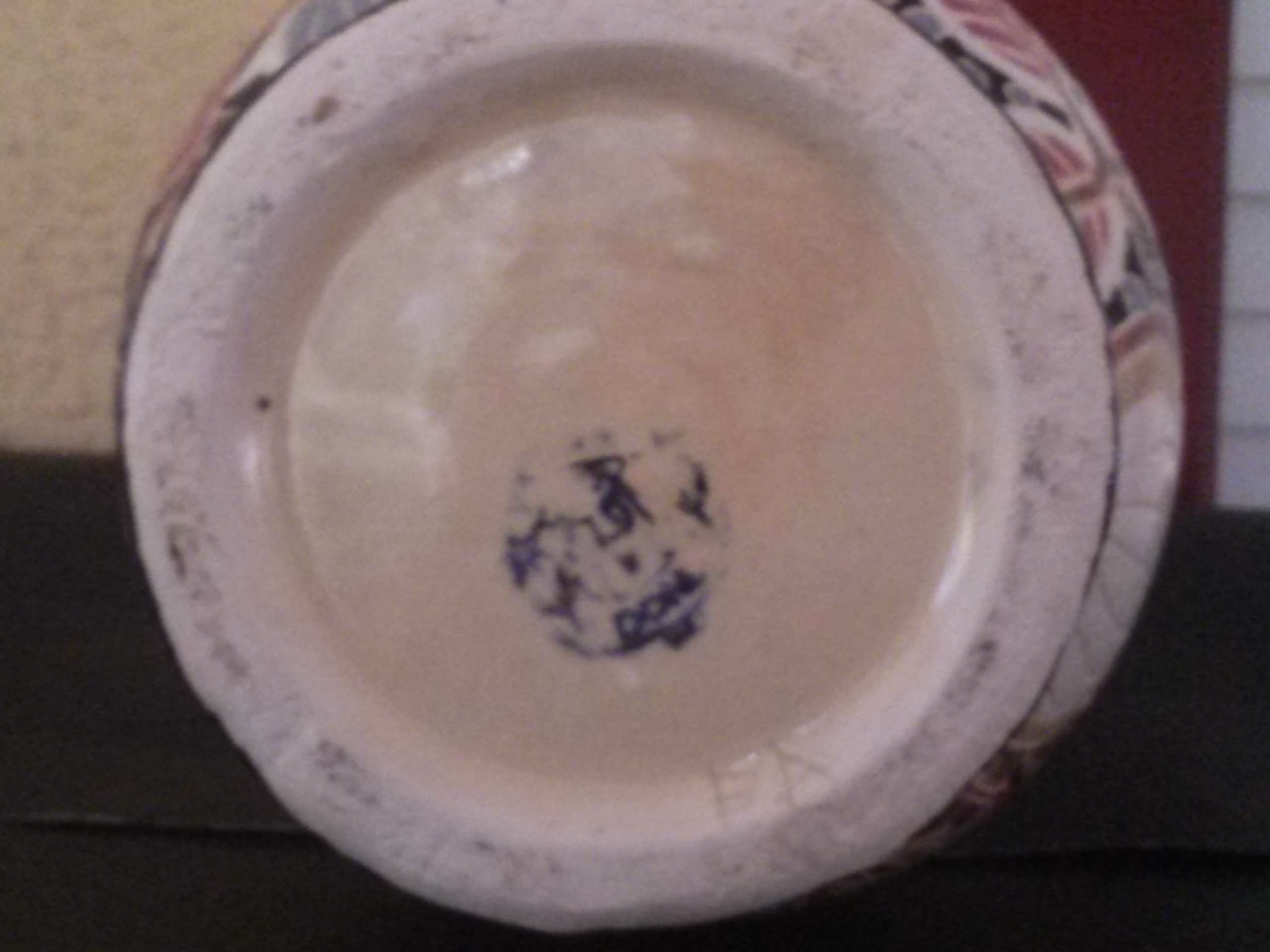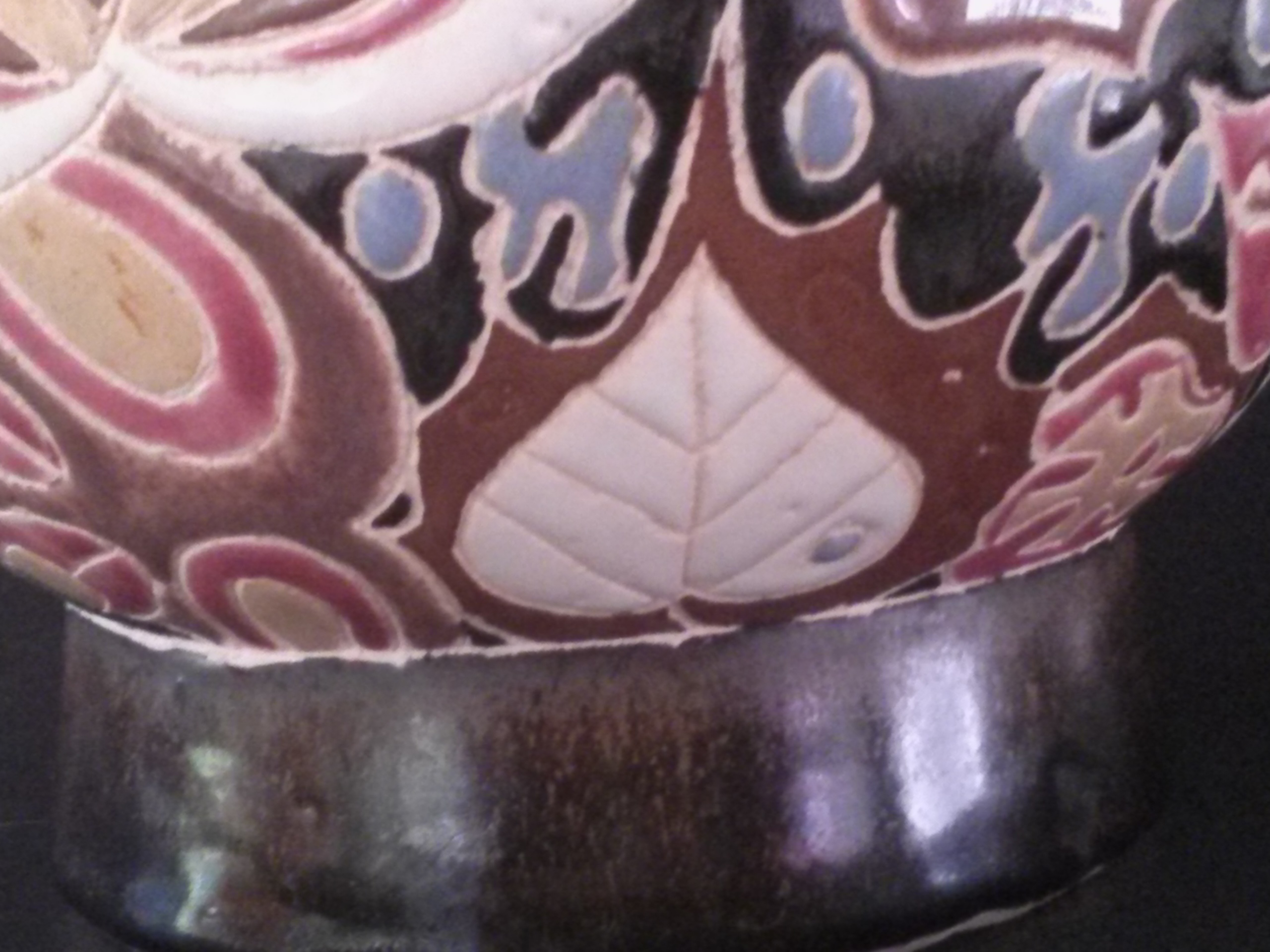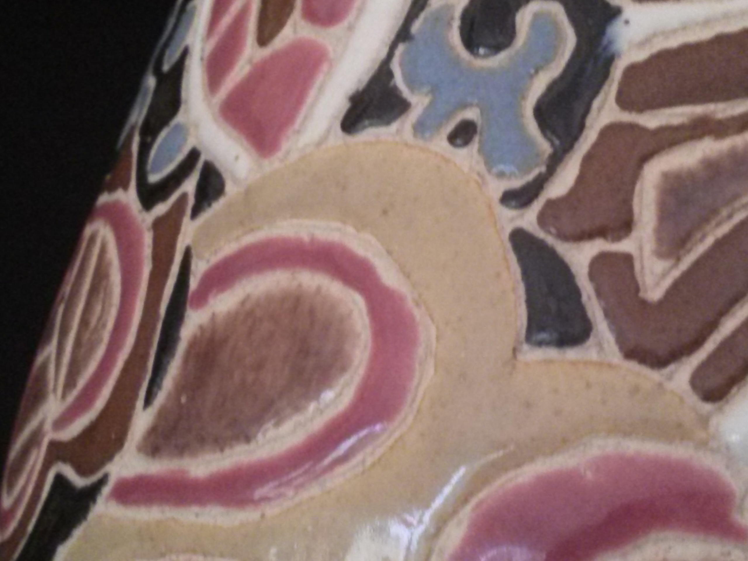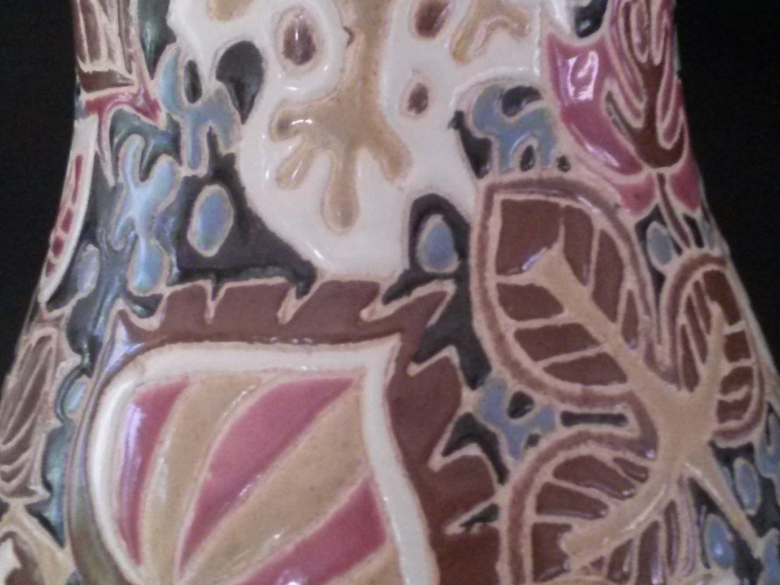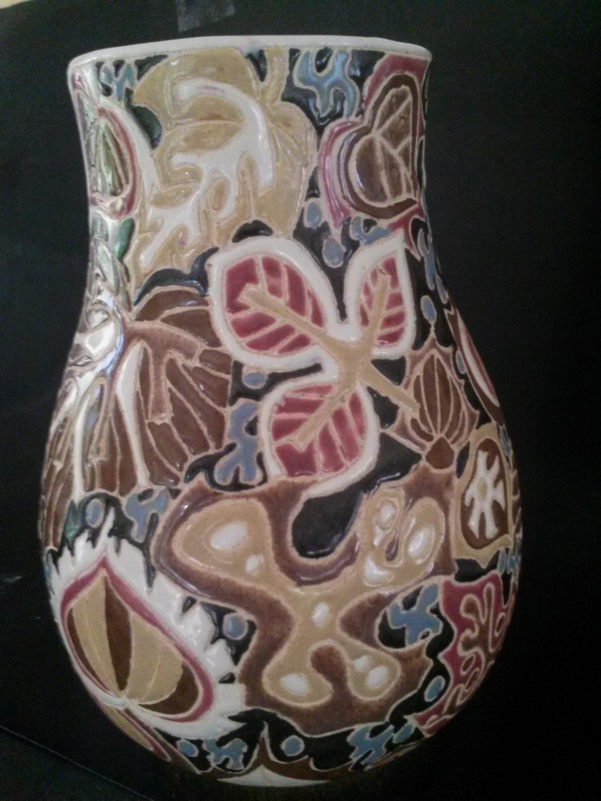 I found this in a thrift store. It just happened to catch my eye. The colors are deeper and richer then in the pictures. The vase weighs about 4 lbs. 12" tall, top opening is 4 1/2" wide and base is 5 1/2" wide. I have seen a few pieces on ebay but none with this pattern. Any help or knowledge would be most appreciated!
