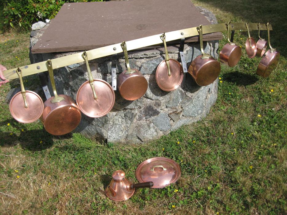 Description 1950s 1960s villideau france copper cookwere, has 5 pots a pan 2 kettles. They all have lids and are in very good shape.