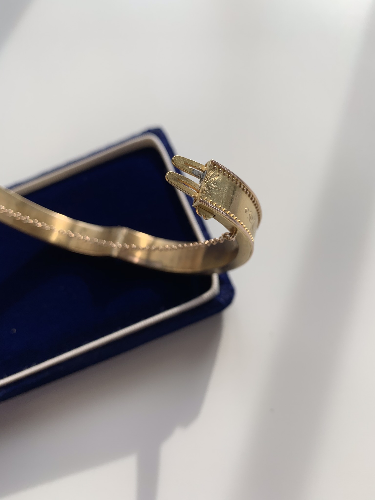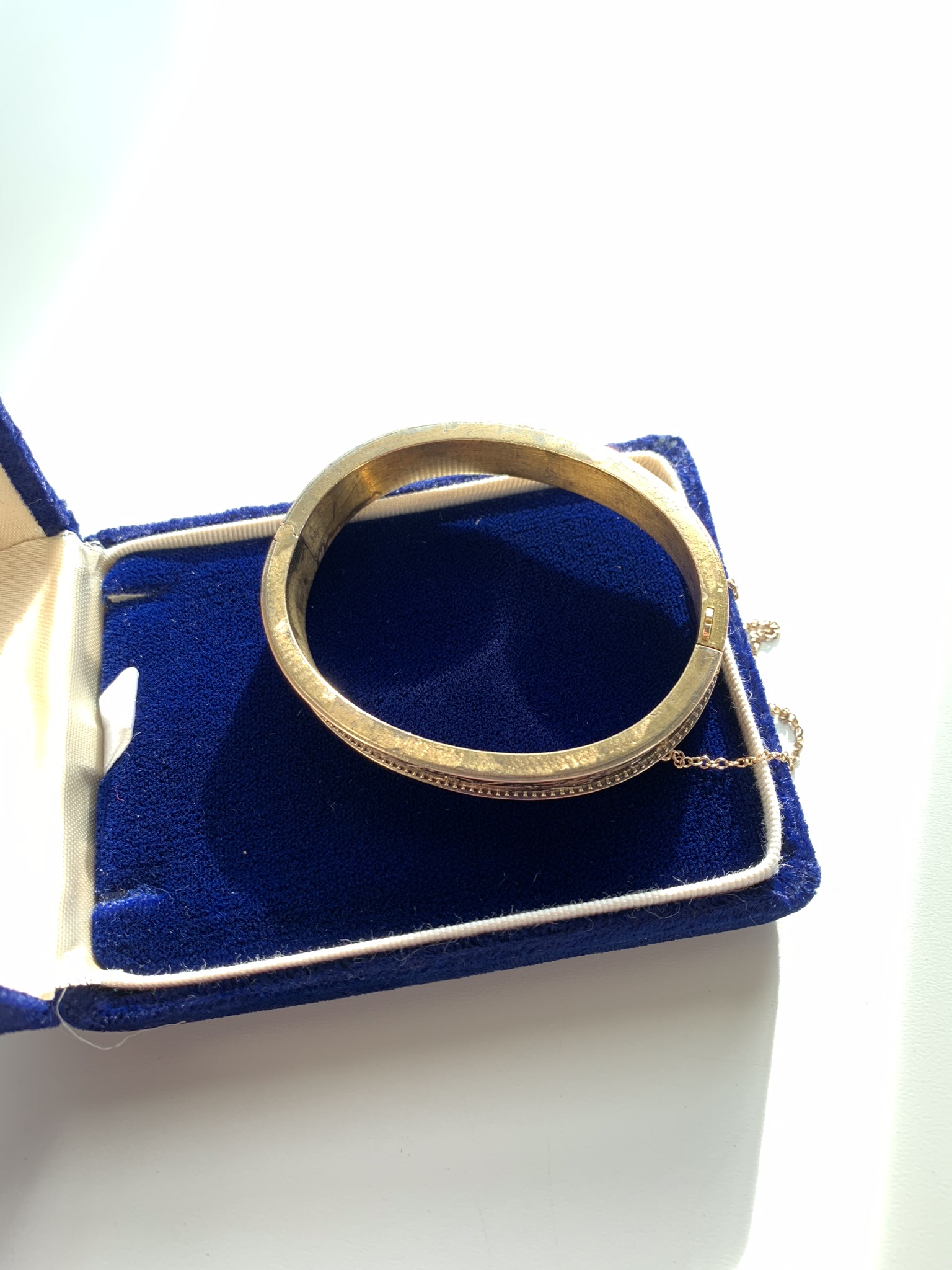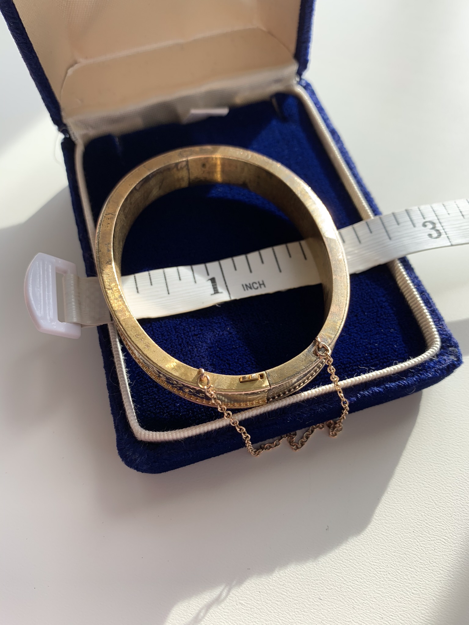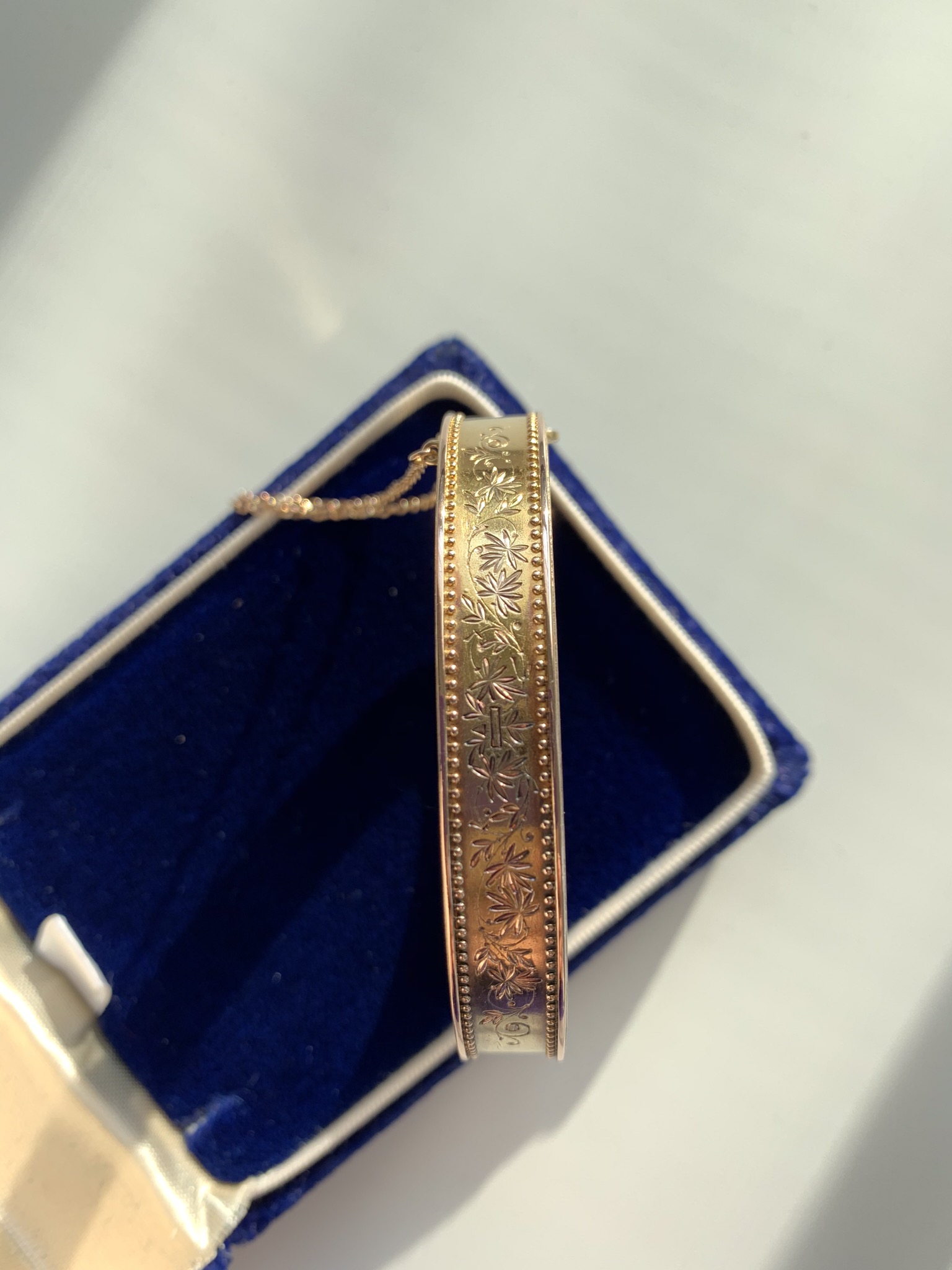Vintage 14K Gold-filled Bangle Bracelet with delicate floral engraving 1 side and bamboo on the other. Has security chain. Approx weight 18.1 grams. It’s vintage, but may be antique Victorian.